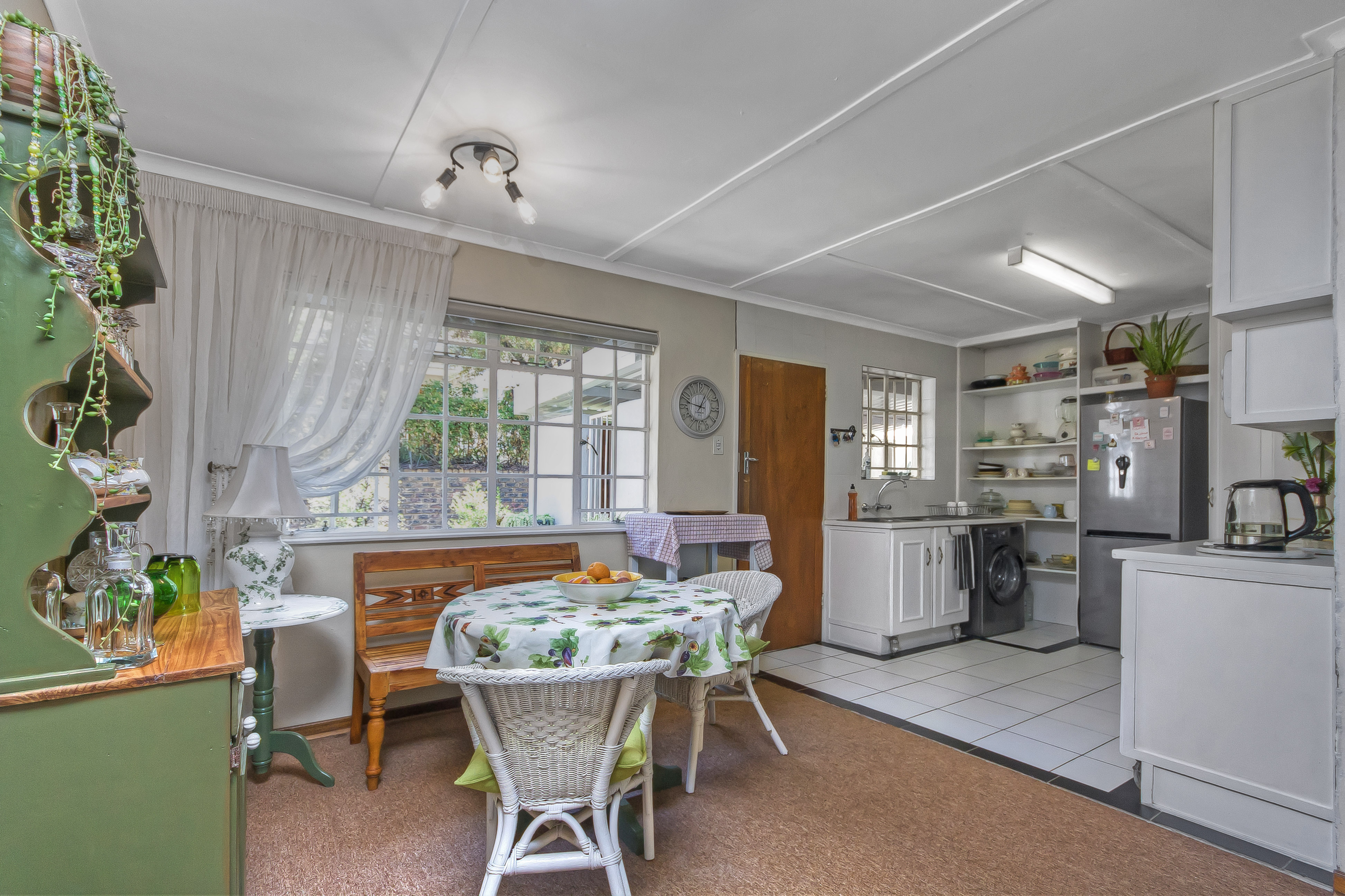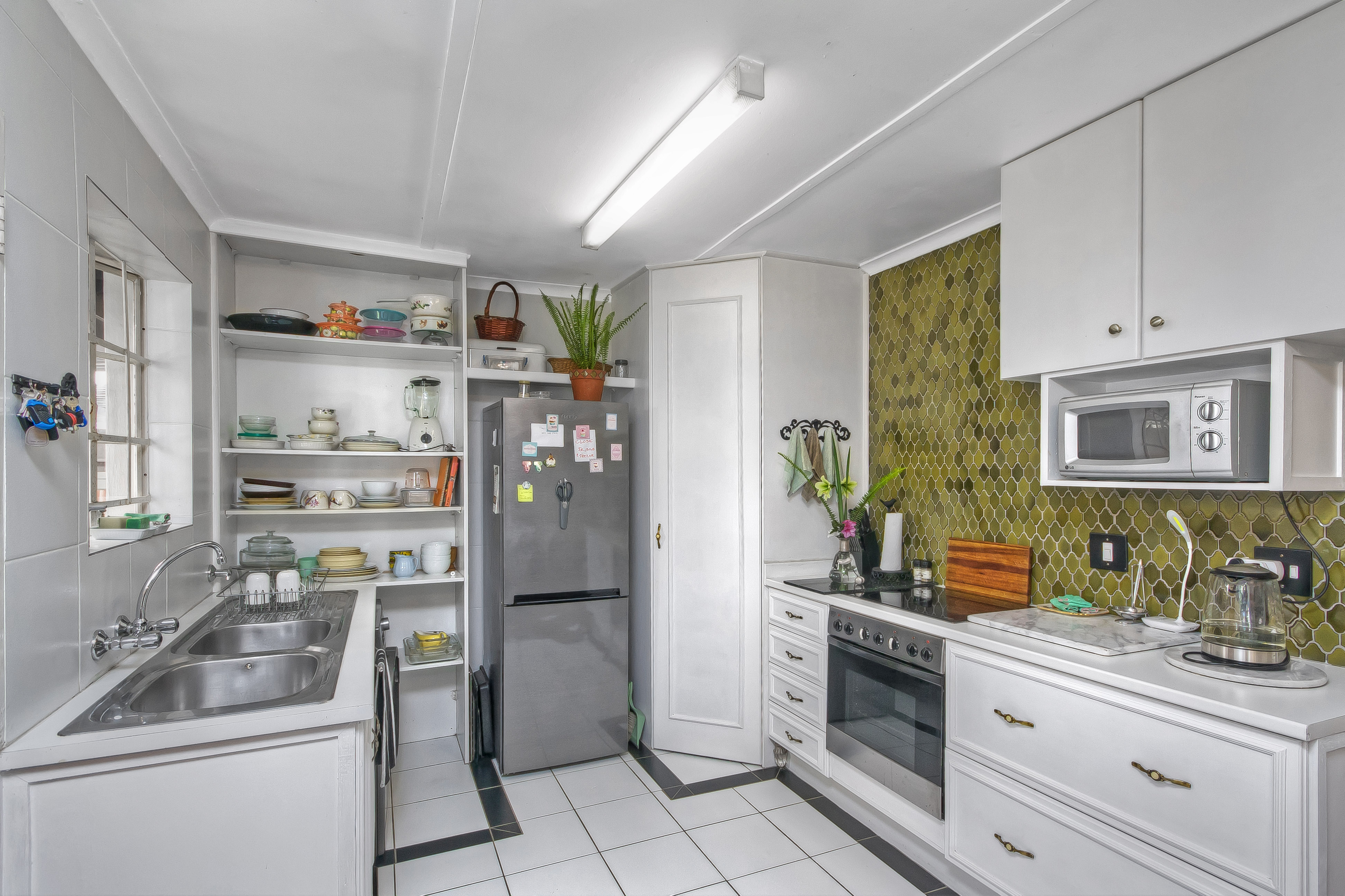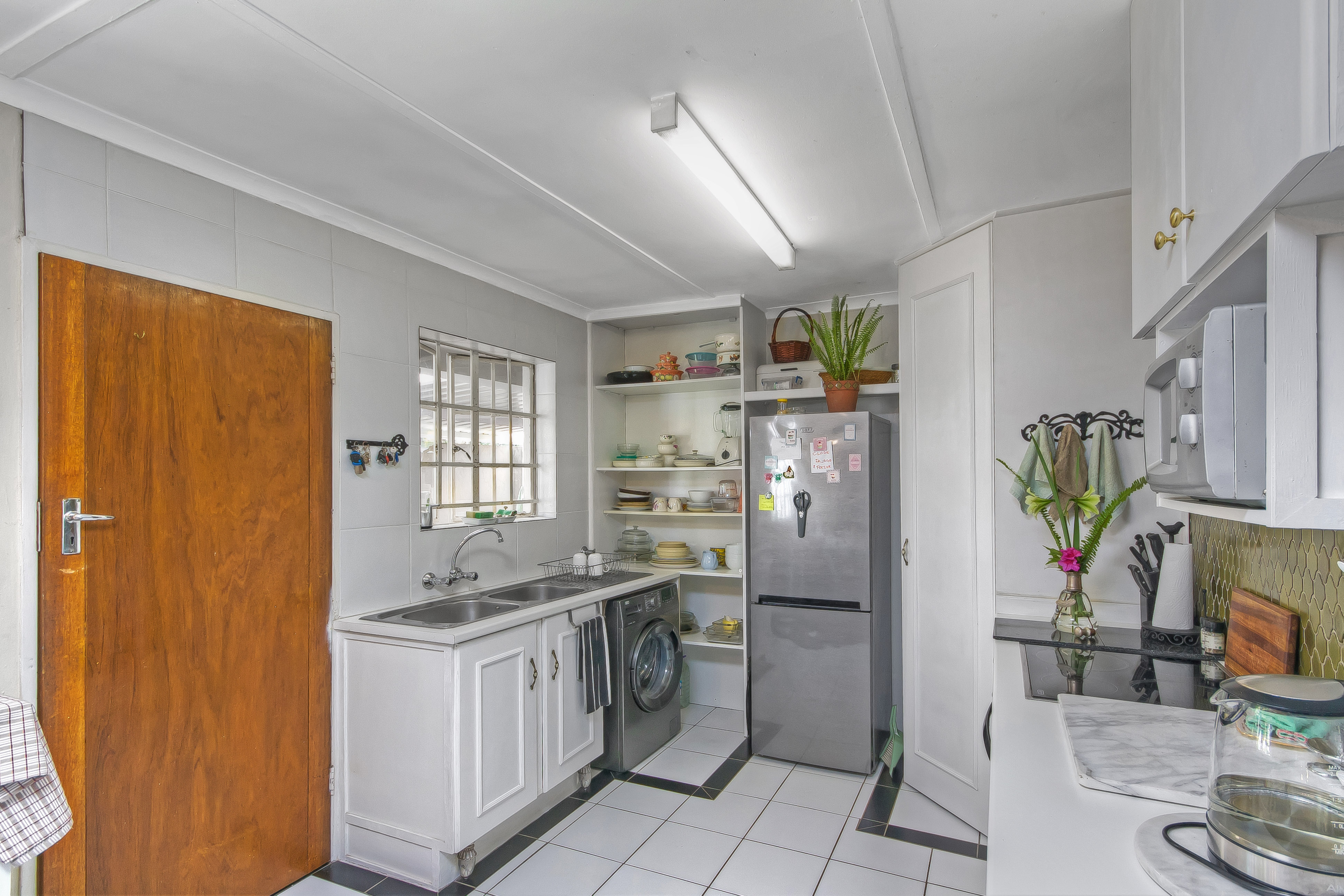 Kitchen: Tiled with pantry and space for one appliance