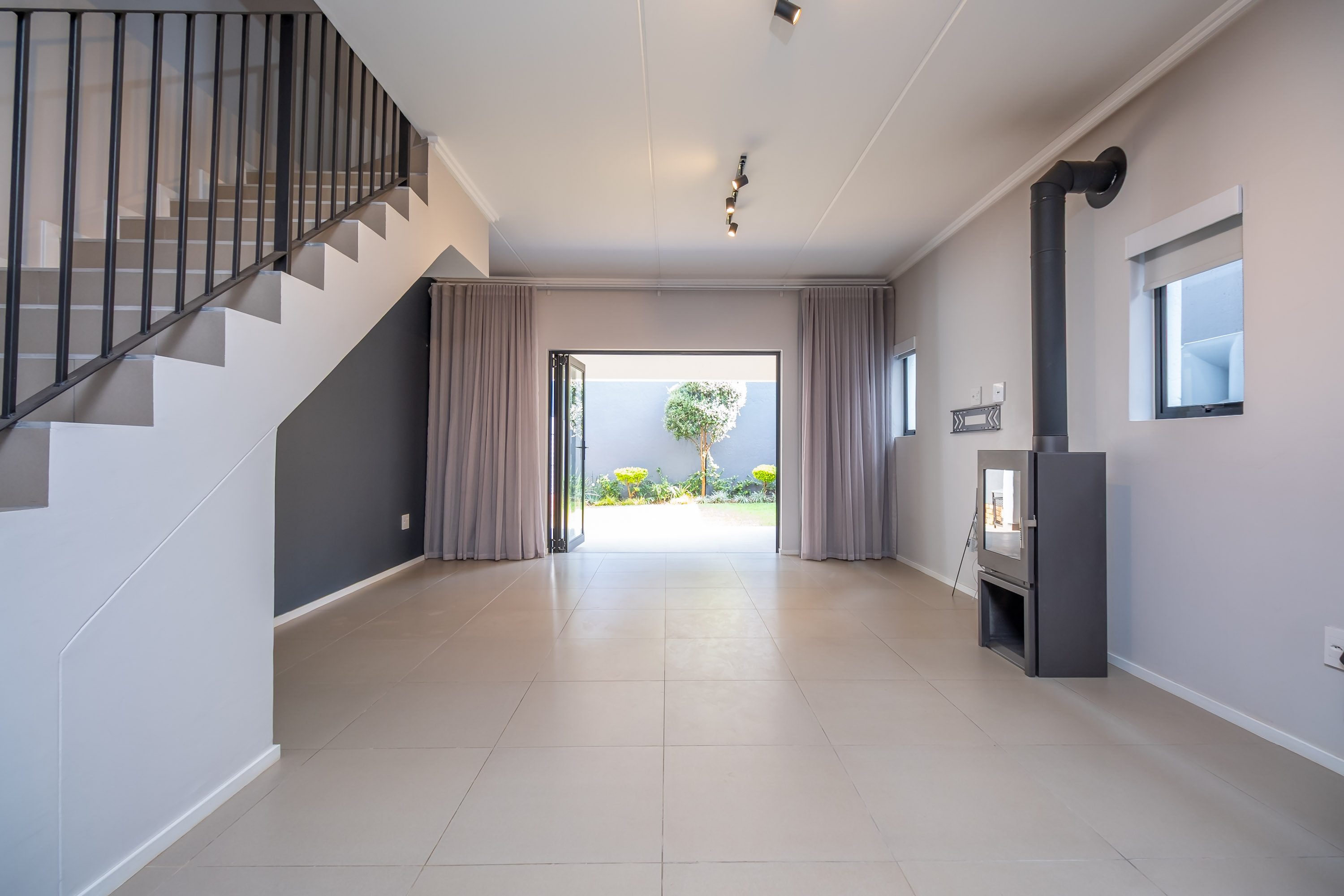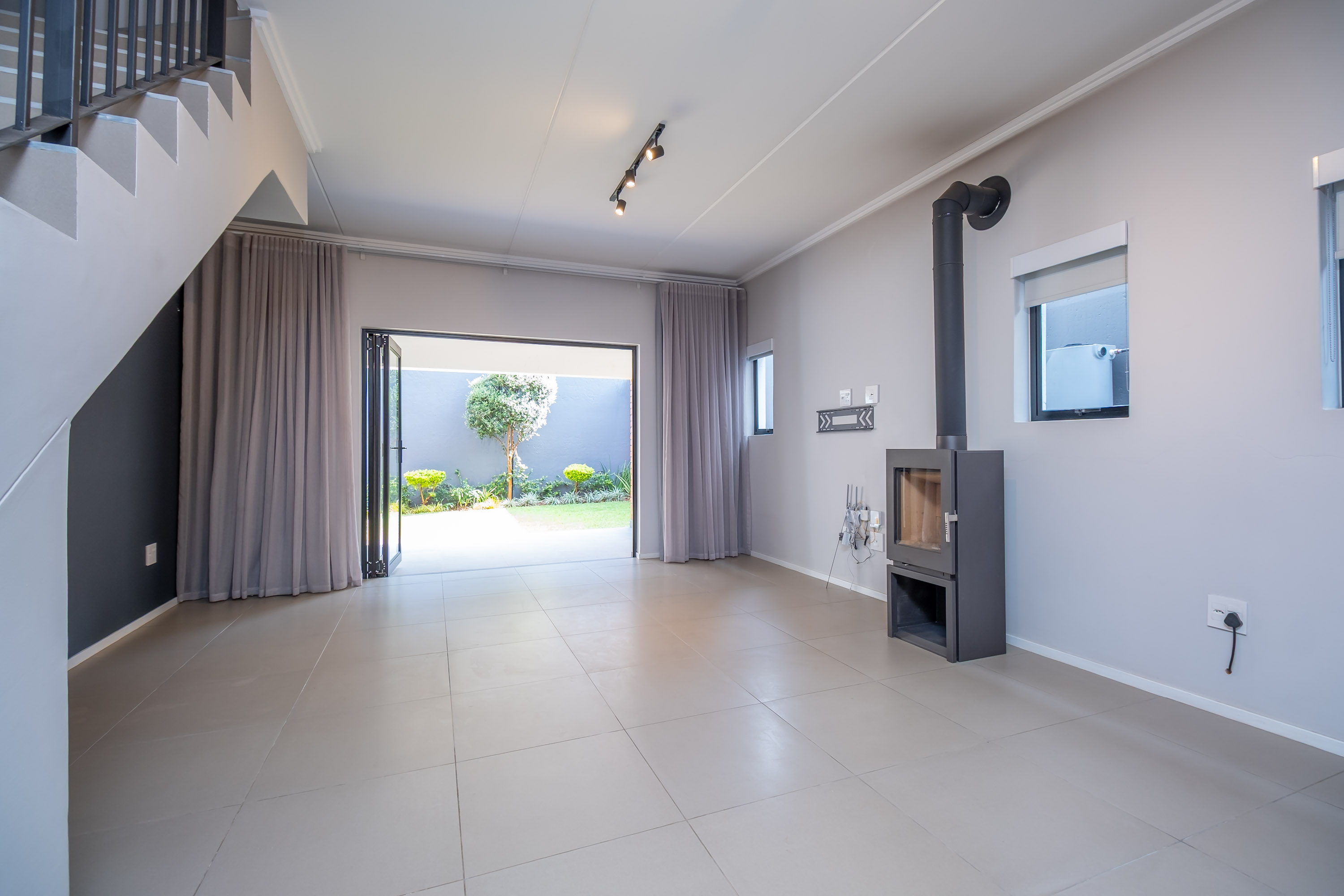Downstairs the kitchen with ample cabinets, a central island, gas hob and electric oven as well as undercounter space for two appliances seamlessly flows into the open-plan living living area. Lounge with feature wood burning fireplace and stacking doors to covered patio and and private garden.