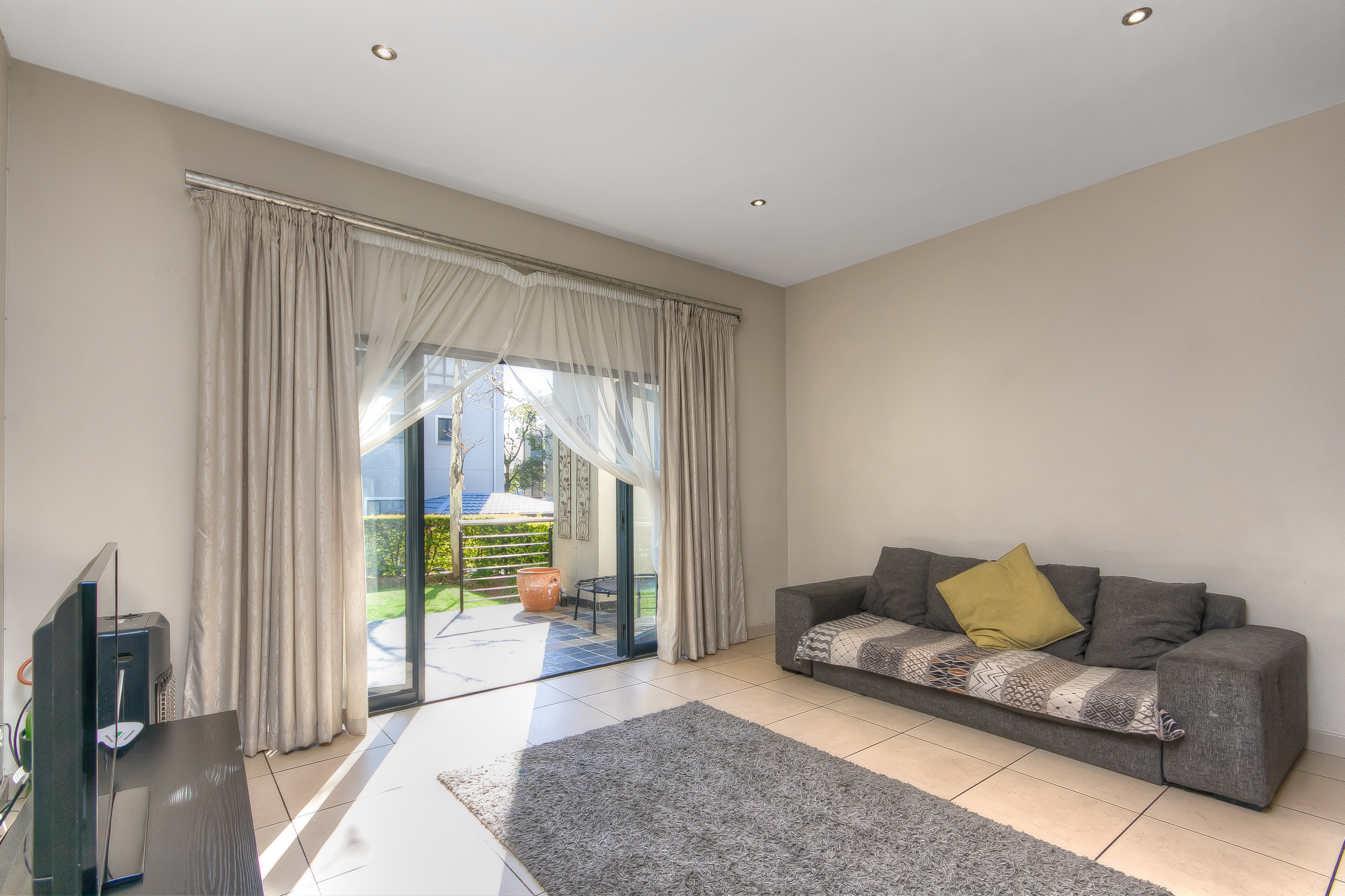 Living Area: Spacious, with extra cupboards, leads onto a covered patio and small garden