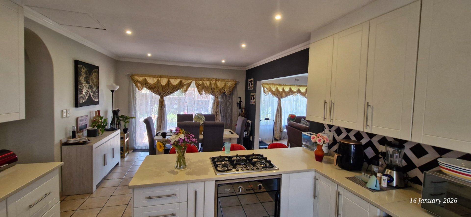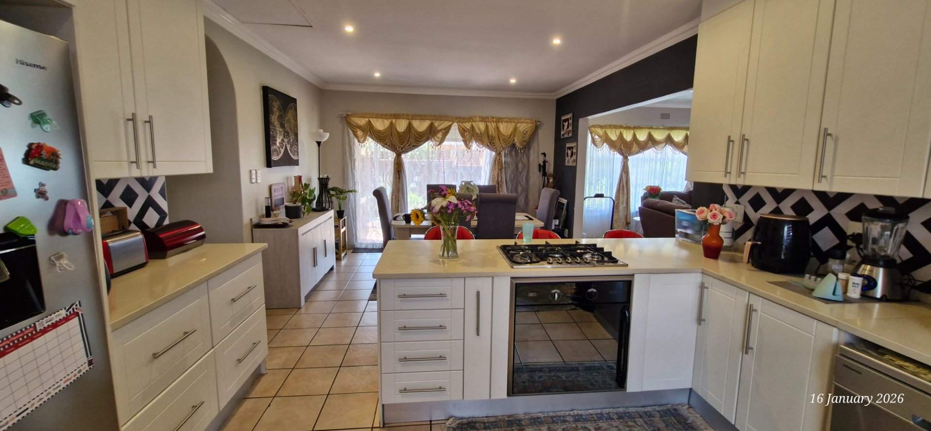 Granite tops and gas stove space for double fridge and 2 appliances,