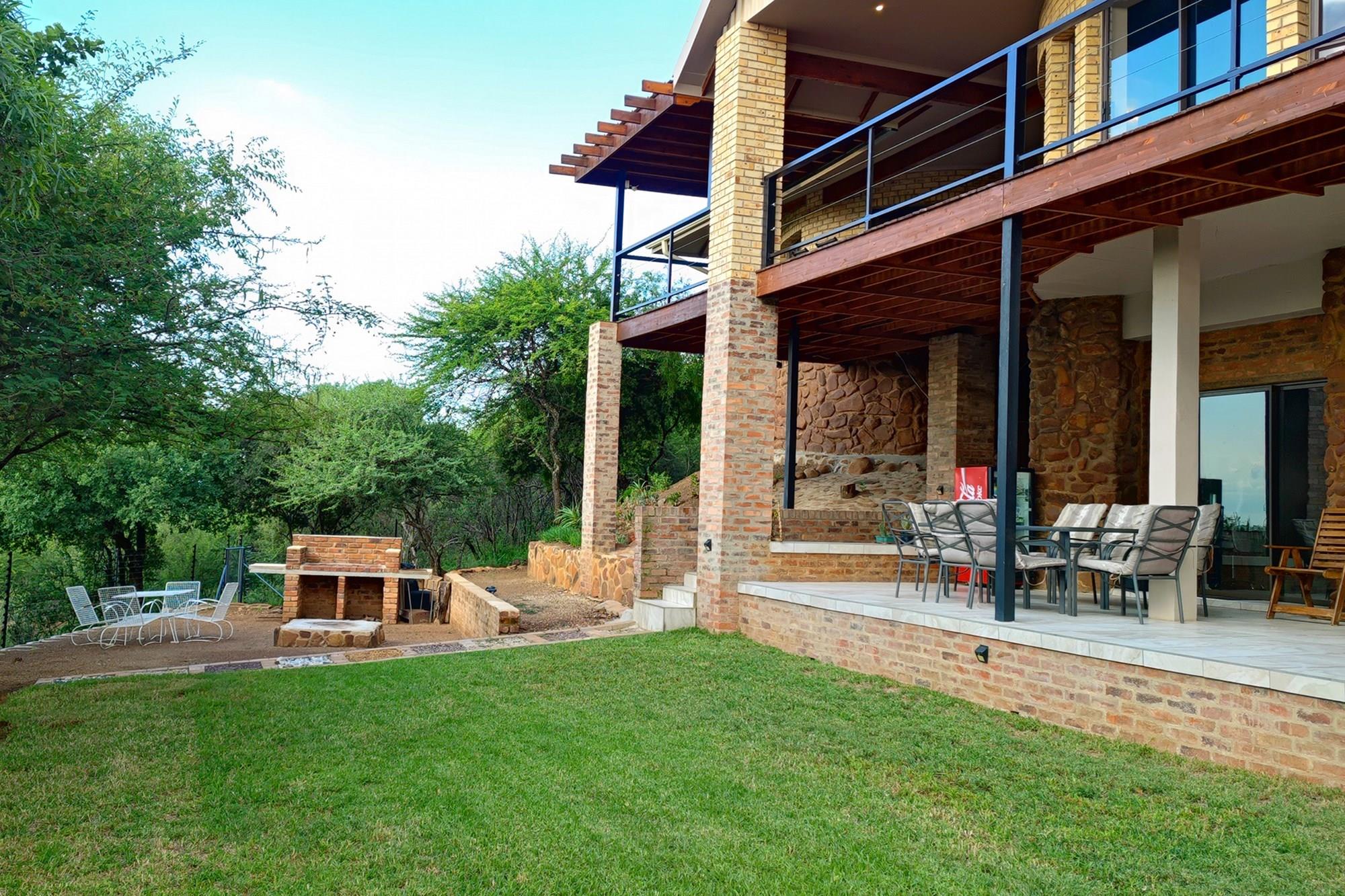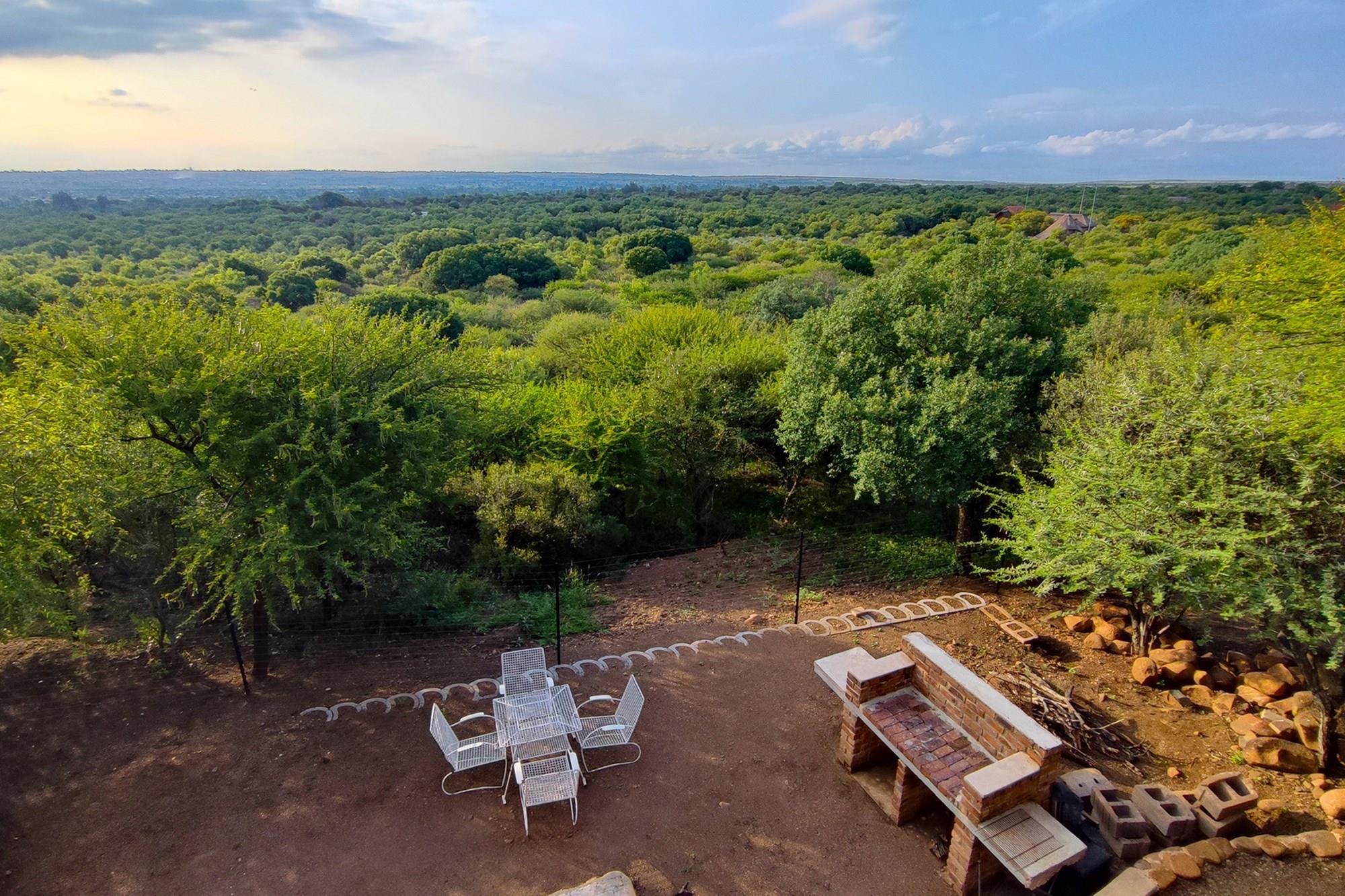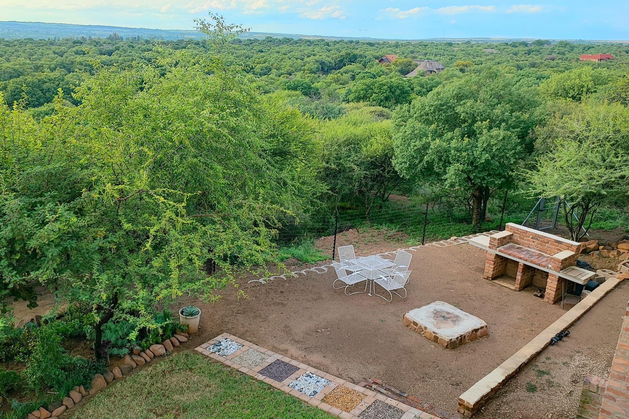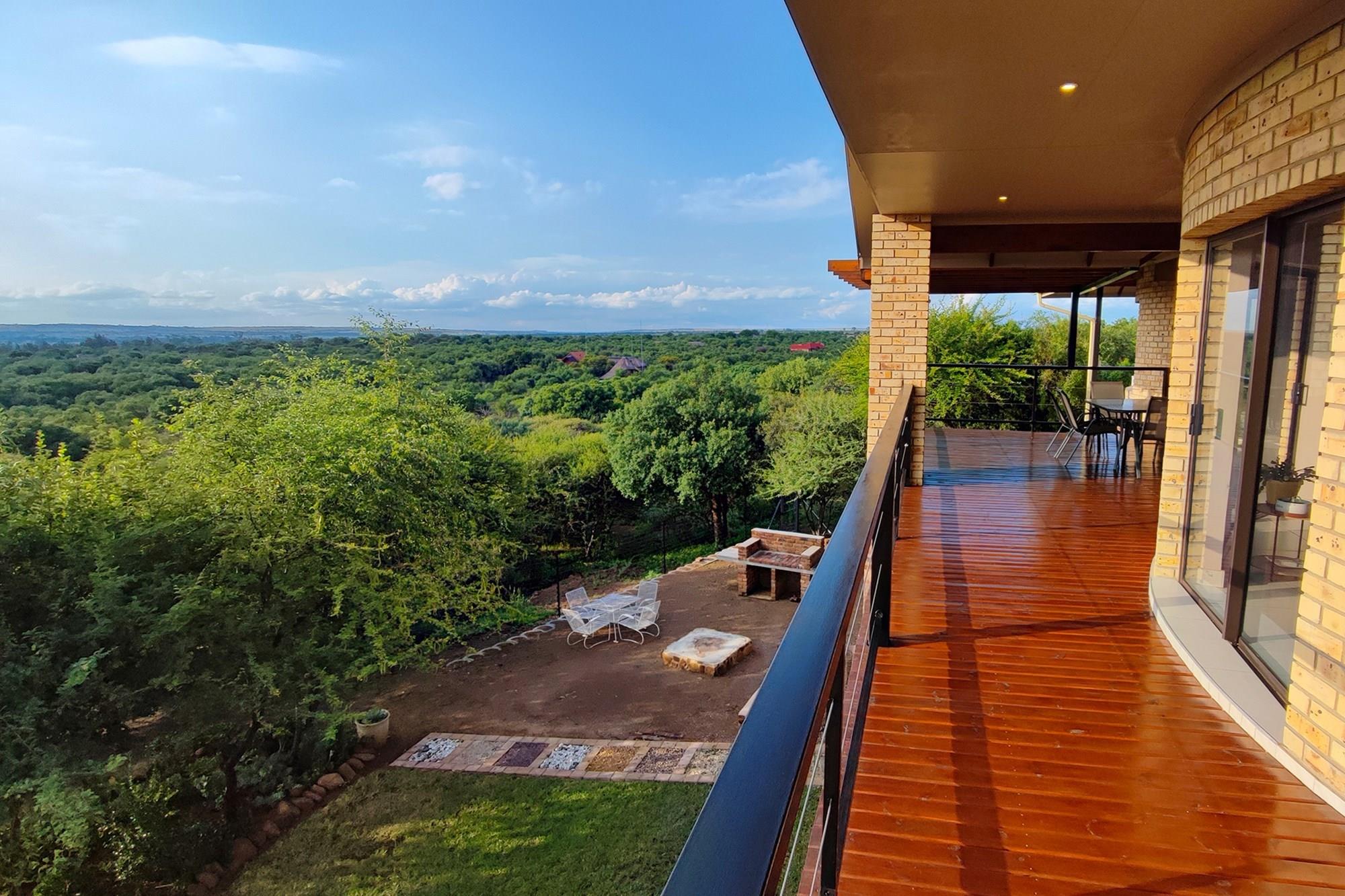 Prepare to be enchanted by the open-plan living, dining, and kitchen area, also air-conditioned for your convenience. All of the upstairs rooms flow onto the inviting wooden deck, where you can revel in a mesmerizing 180-degree panoramic view. Equipped with a built-in braai, this outdoor oasis is perfect for entertaining guests or simply enjoying the tranquil surroundings whilst listening to the noises of the birds and animals in the bush.
