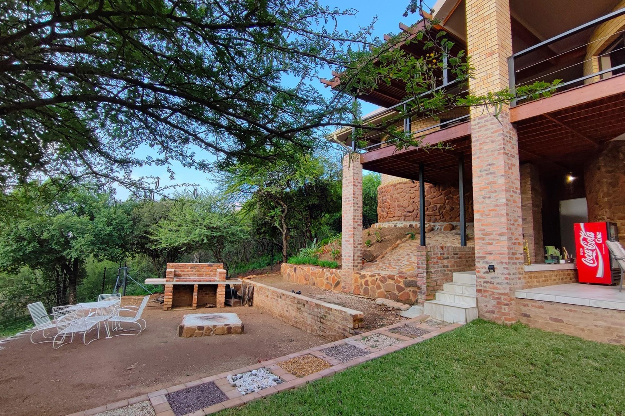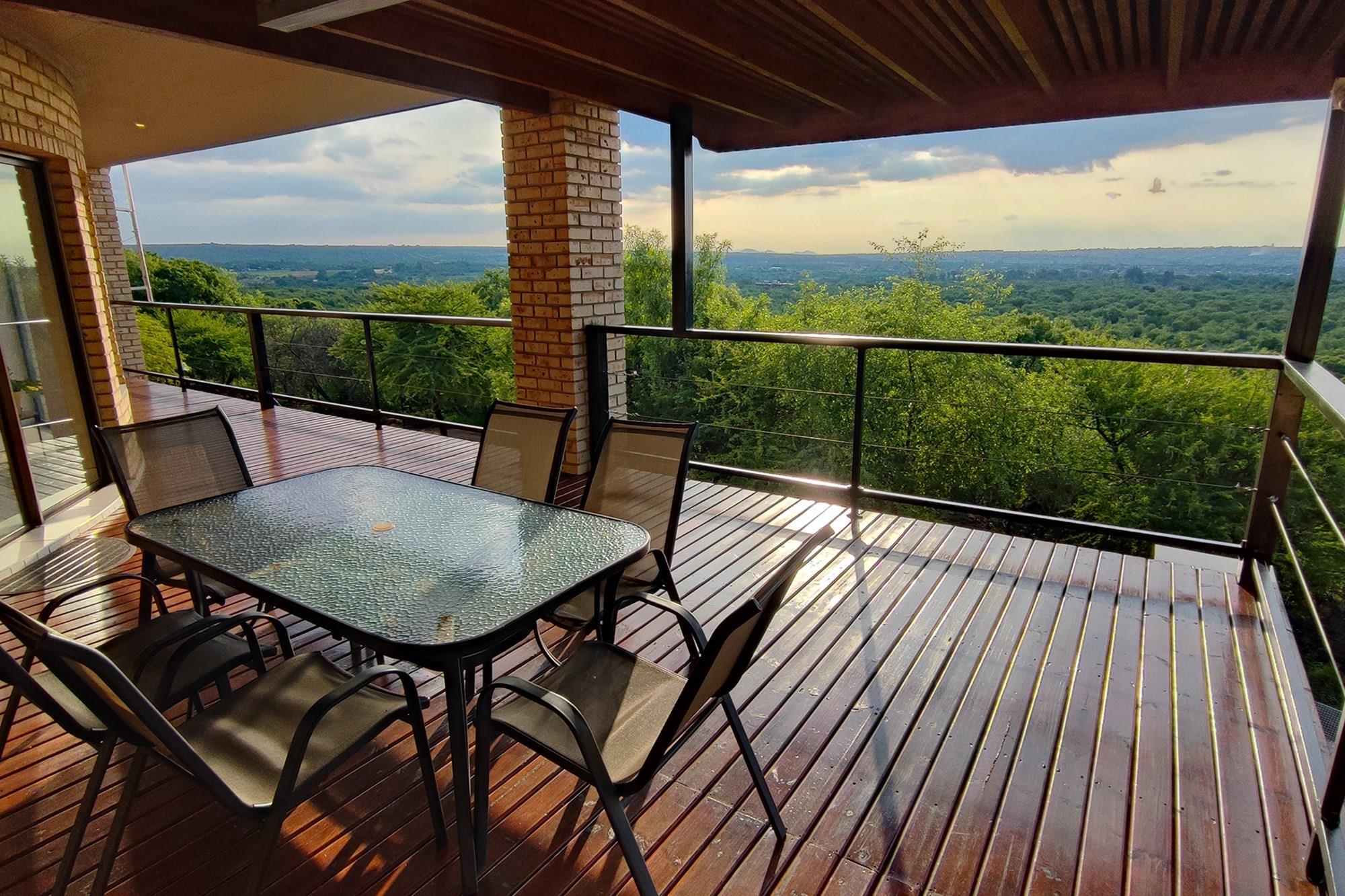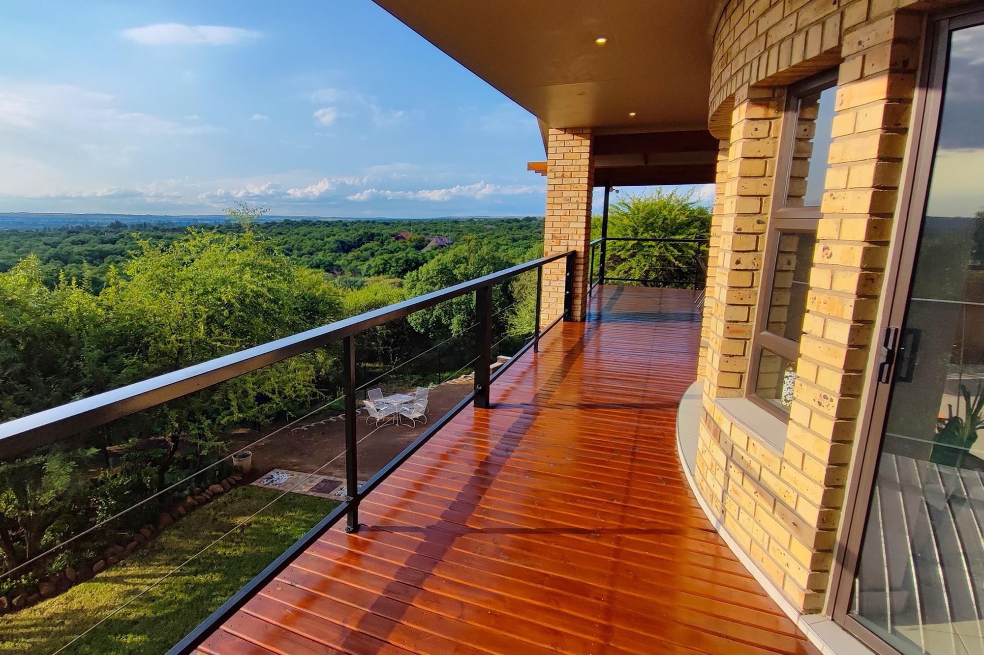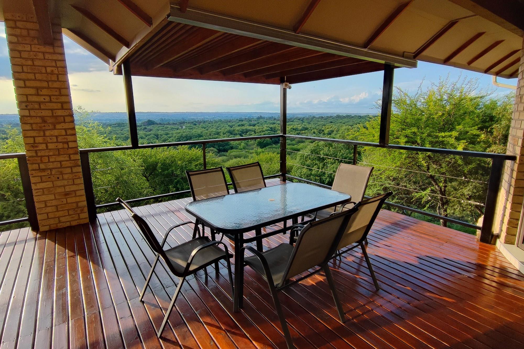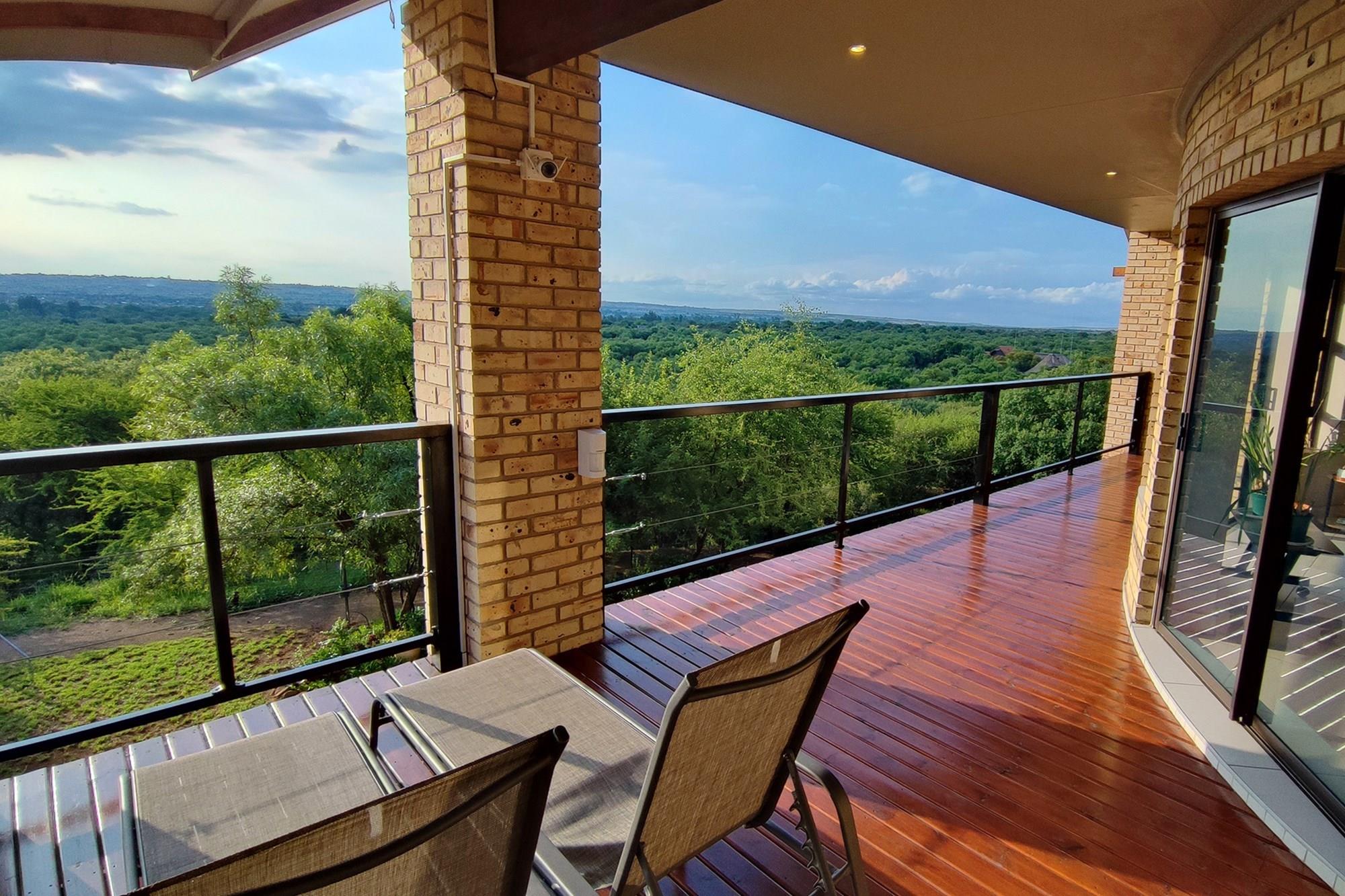 Prepare to be enchanted by the open-plan living, dining, and kitchen area, also air-conditioned for your convenience. All of the upstairs rooms flow onto the inviting wooden deck, where you can revel in a mesmerizing 180-degree panoramic view. Equipped with a built-in braai, this outdoor oasis is perfect for entertaining guests or simply enjoying the tranquil surroundings whilst listening to the noises of the birds and animals in the bush.