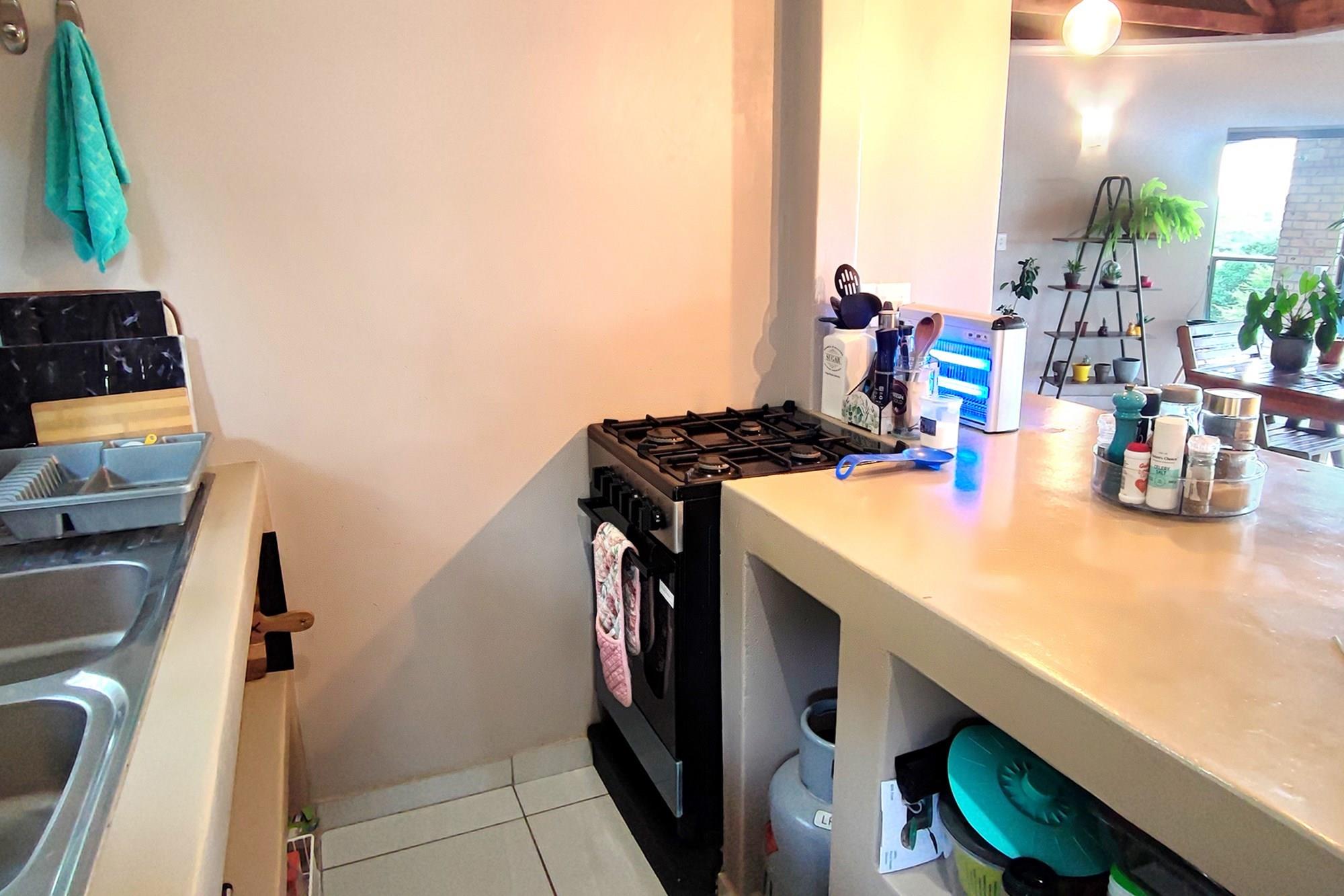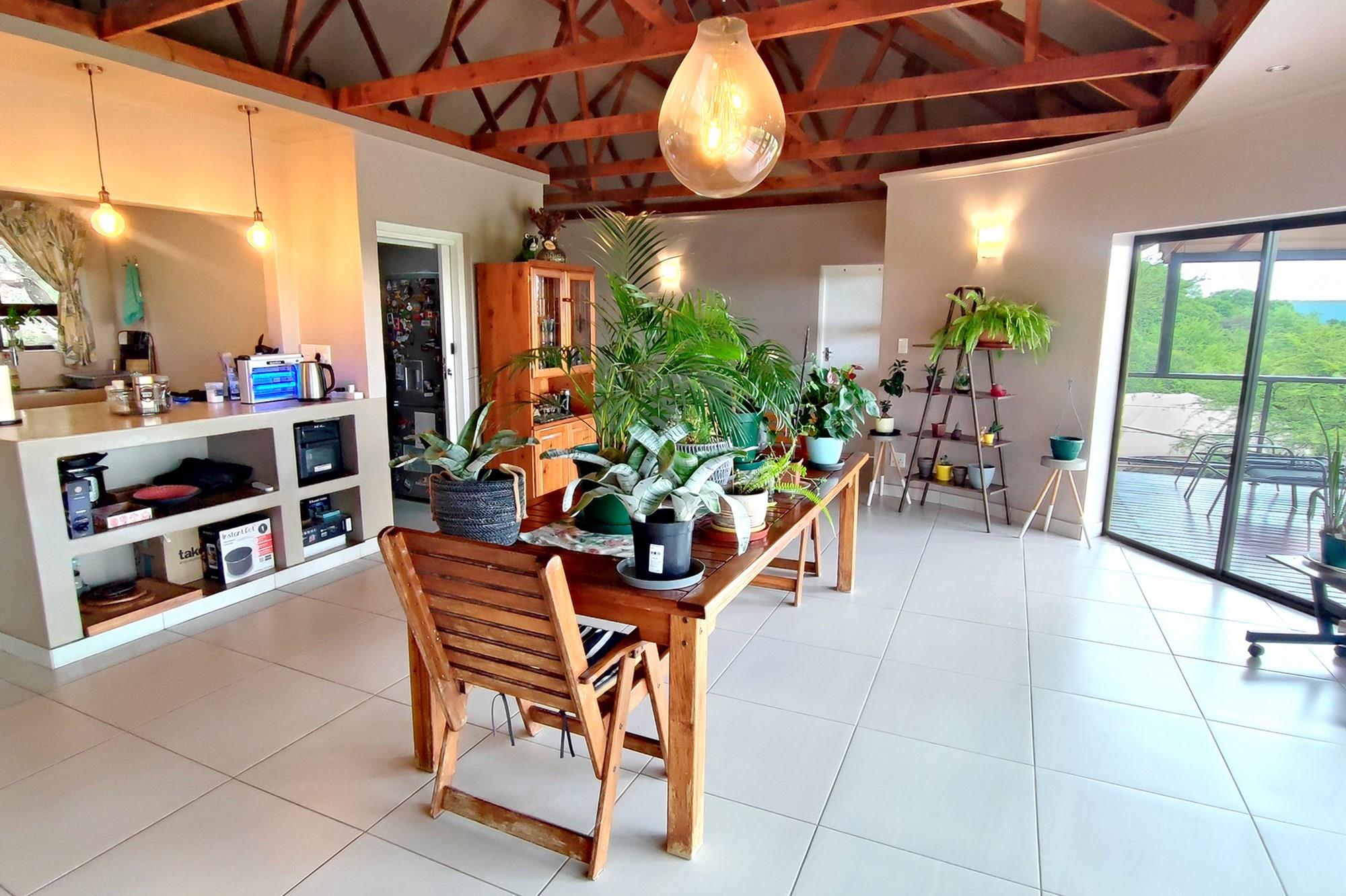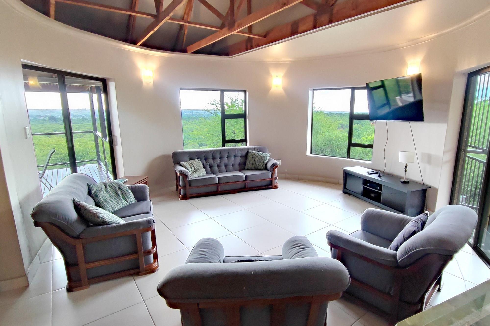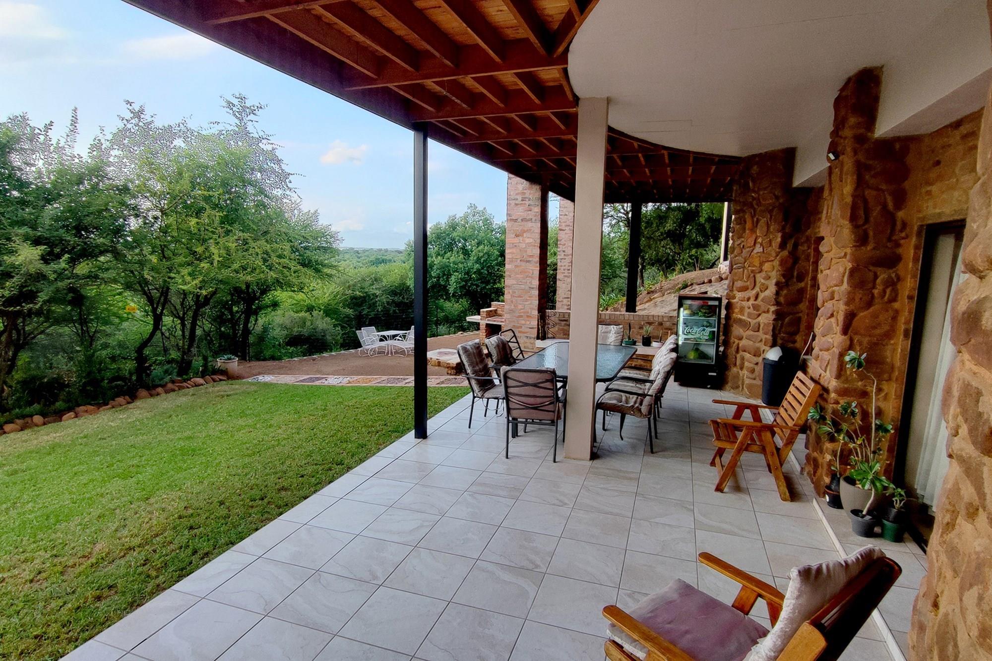 Prepare to be enchanted by the open-plan living, dining, and kitchen area, also air-conditioned for your convenience. All of the upstairs rooms flow onto the inviting wooden deck, where you can revel in a mesmerizing 180-degree panoramic view. Equipped with a built-in braai, this outdoor oasis is perfect for entertaining guests or simply enjoying the tranquil surroundings whilst listening to the noises of the birds and animals in the bush.