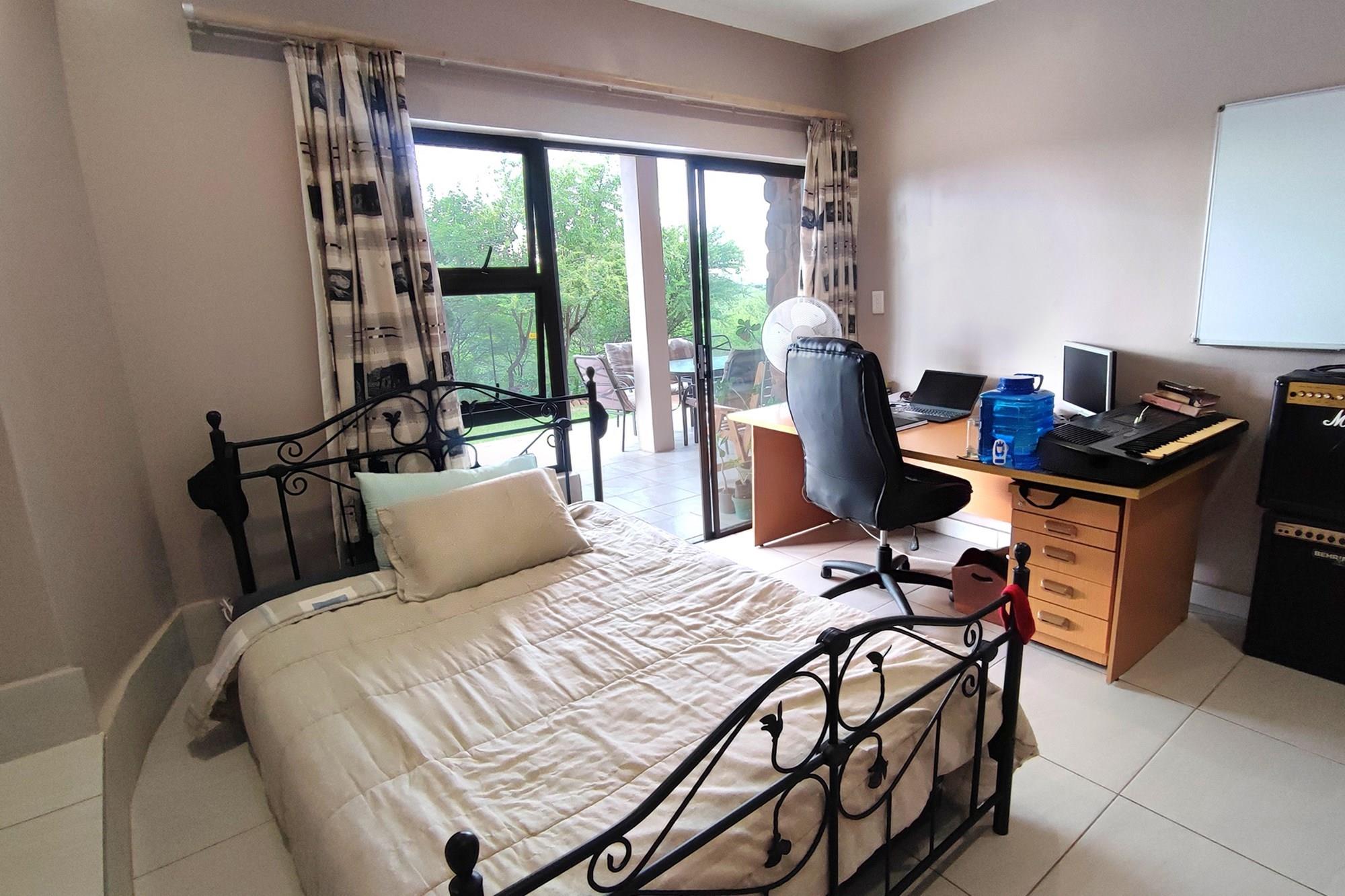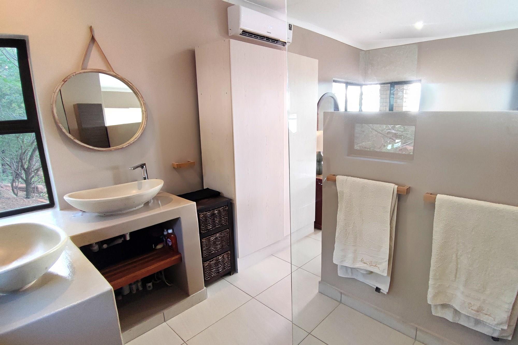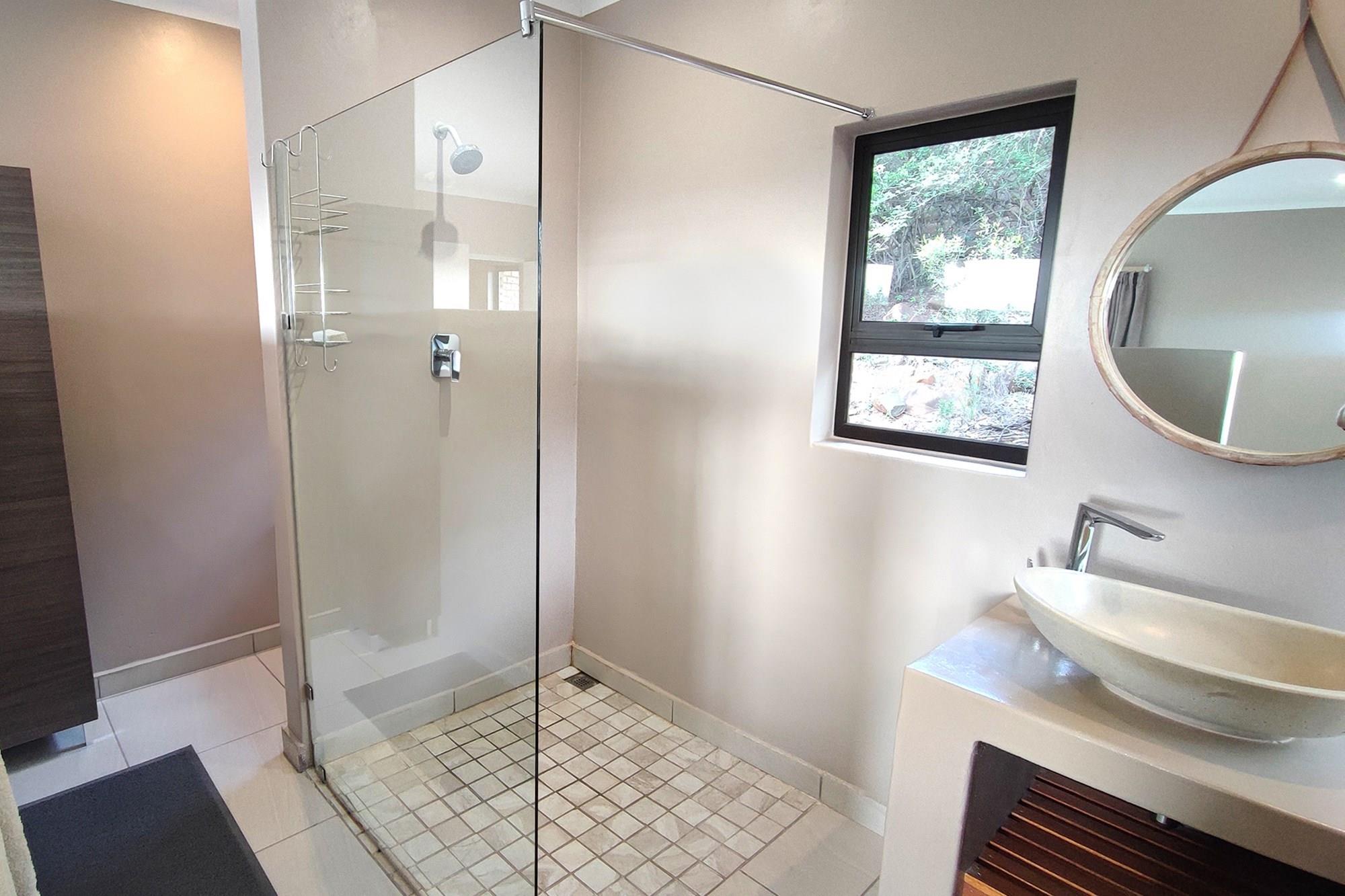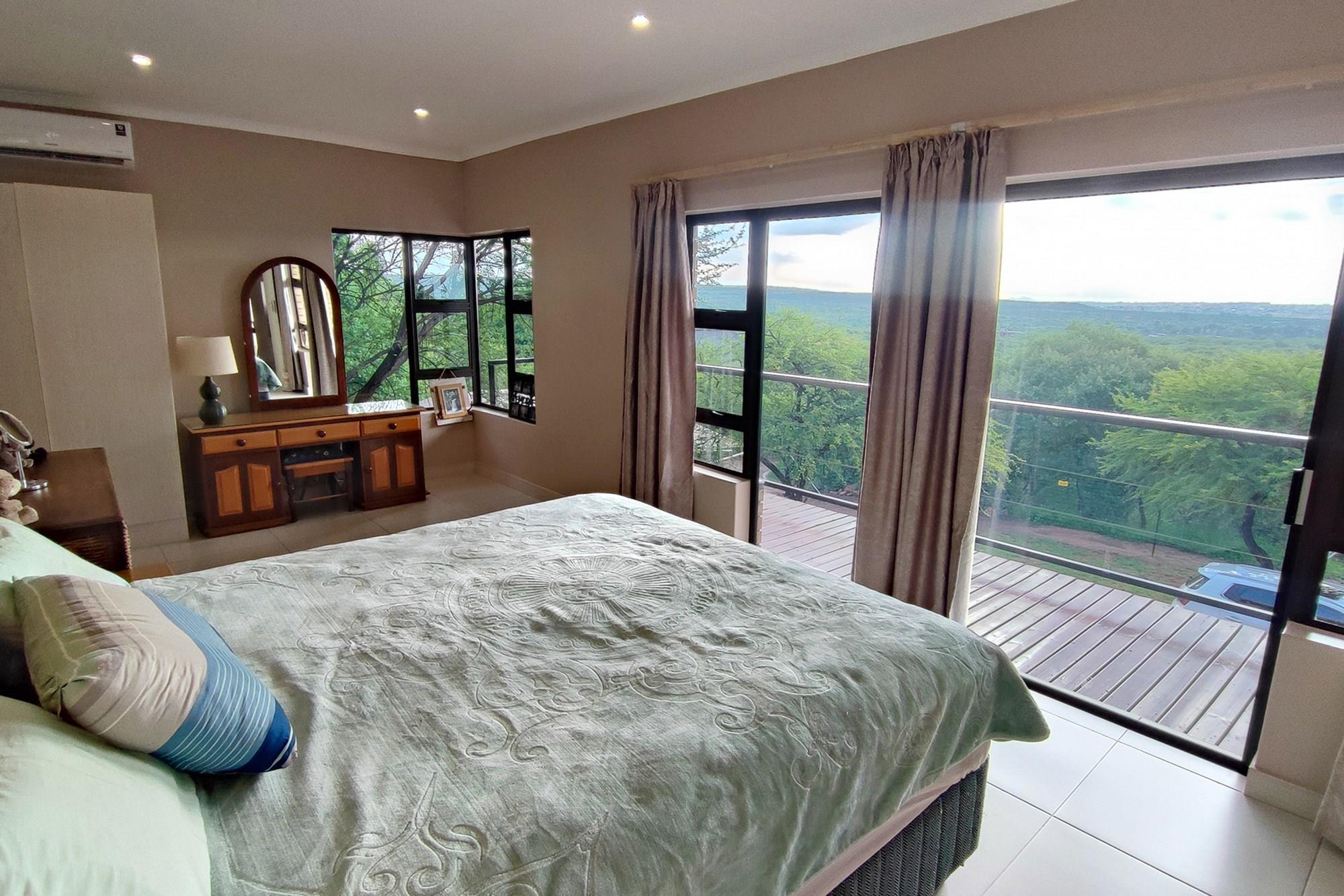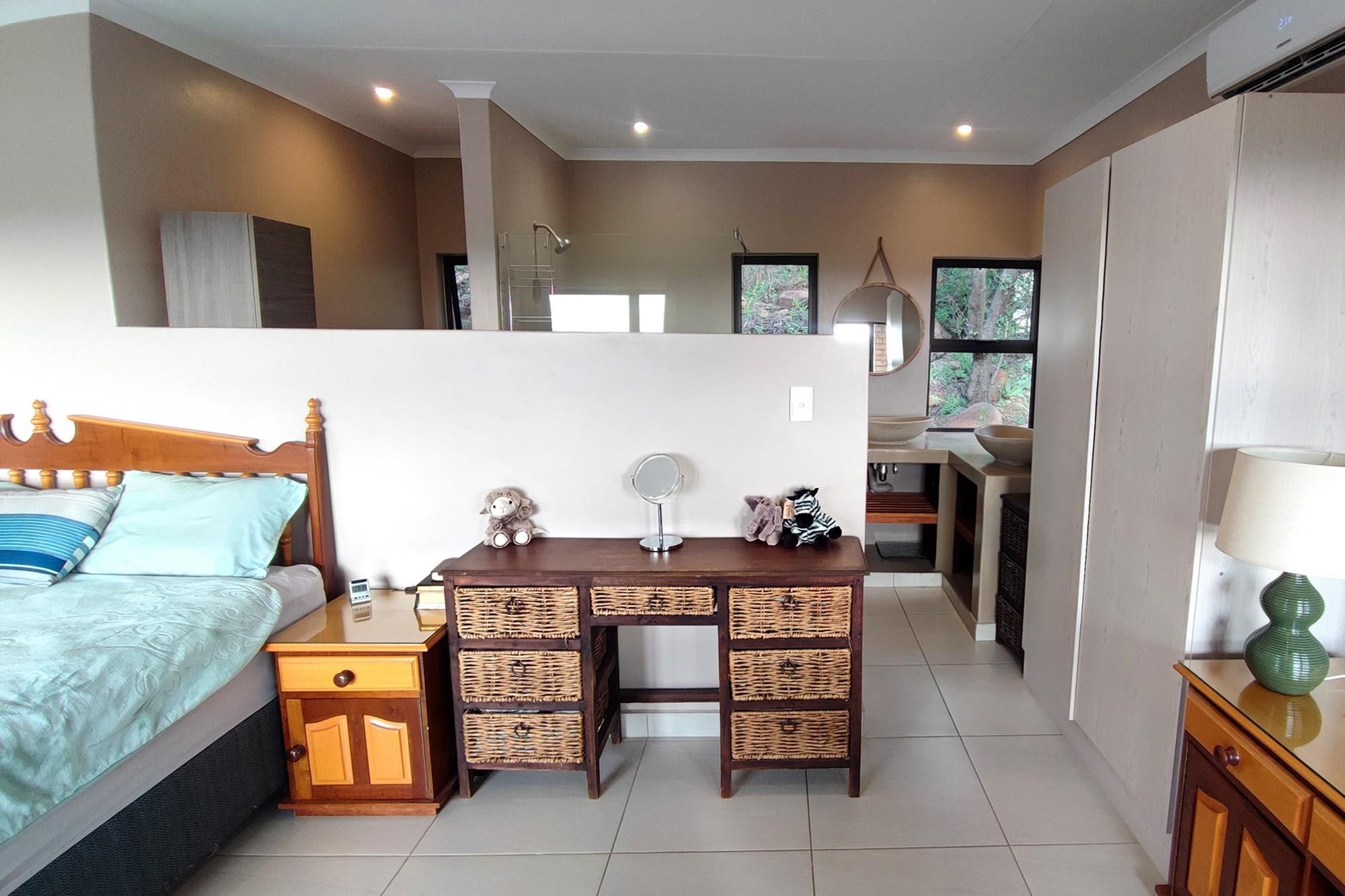 This beautiful home boasts three modern bedrooms, each with its own en-suite bathroom. The main bedroom is situated on the upper level with gorgeous views of the African bushveld. Step into this sanctuary and be greeted by a spacious layout, complete with a full-length patio offering awe-inspiring views that will leave you breathless. For your ultimate comfort, the main bedroom is air-conditioned, ensuring a tranquil retreat.
