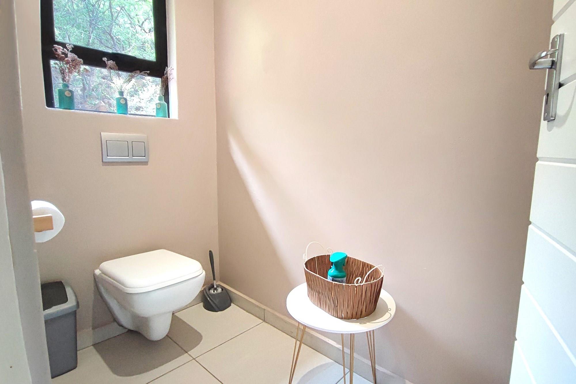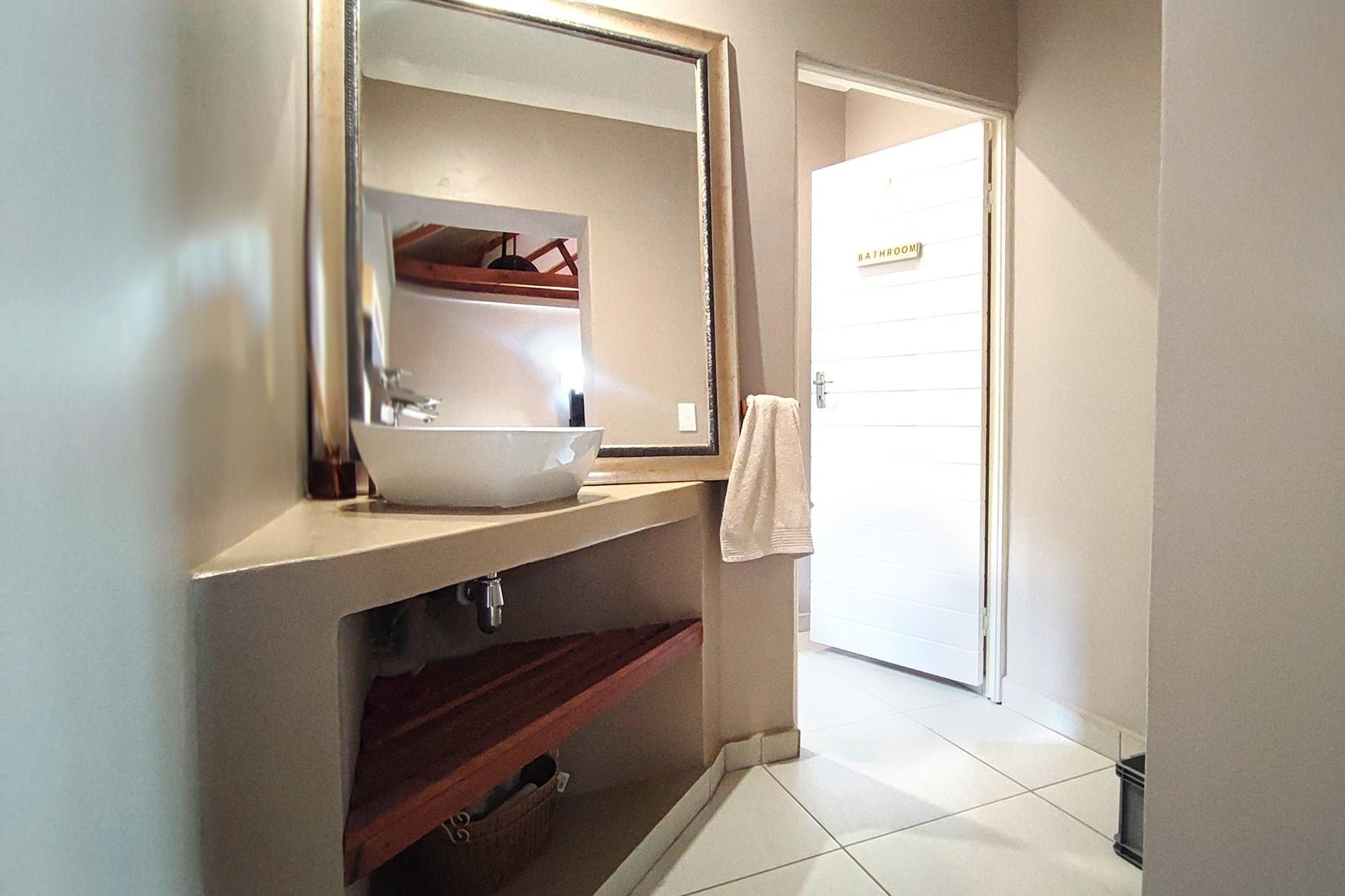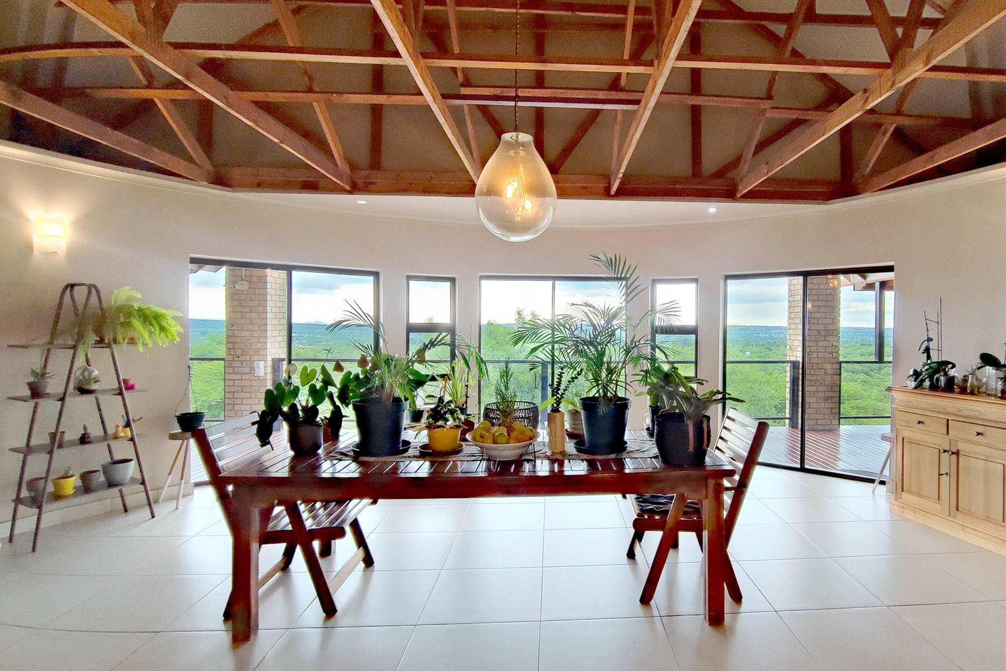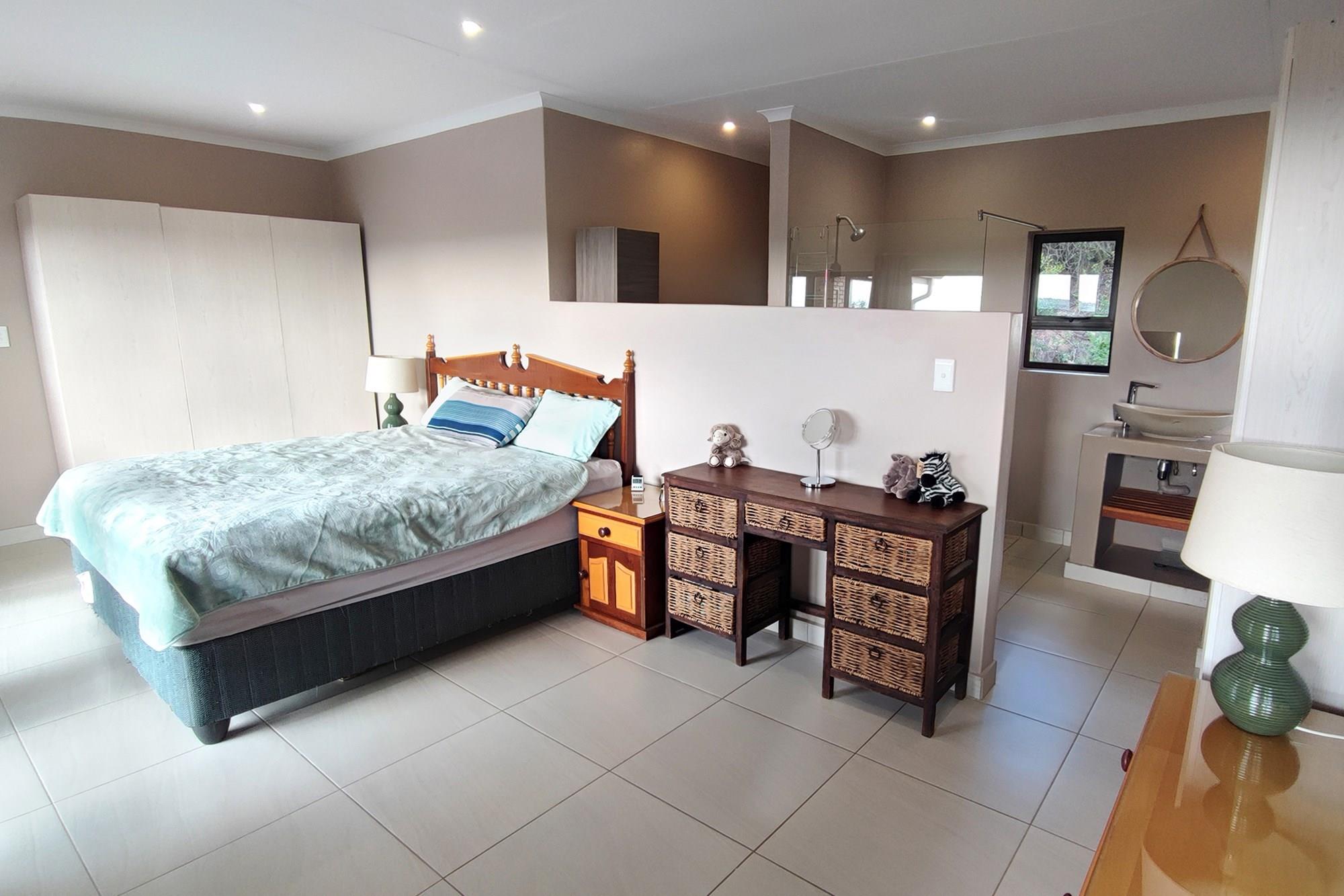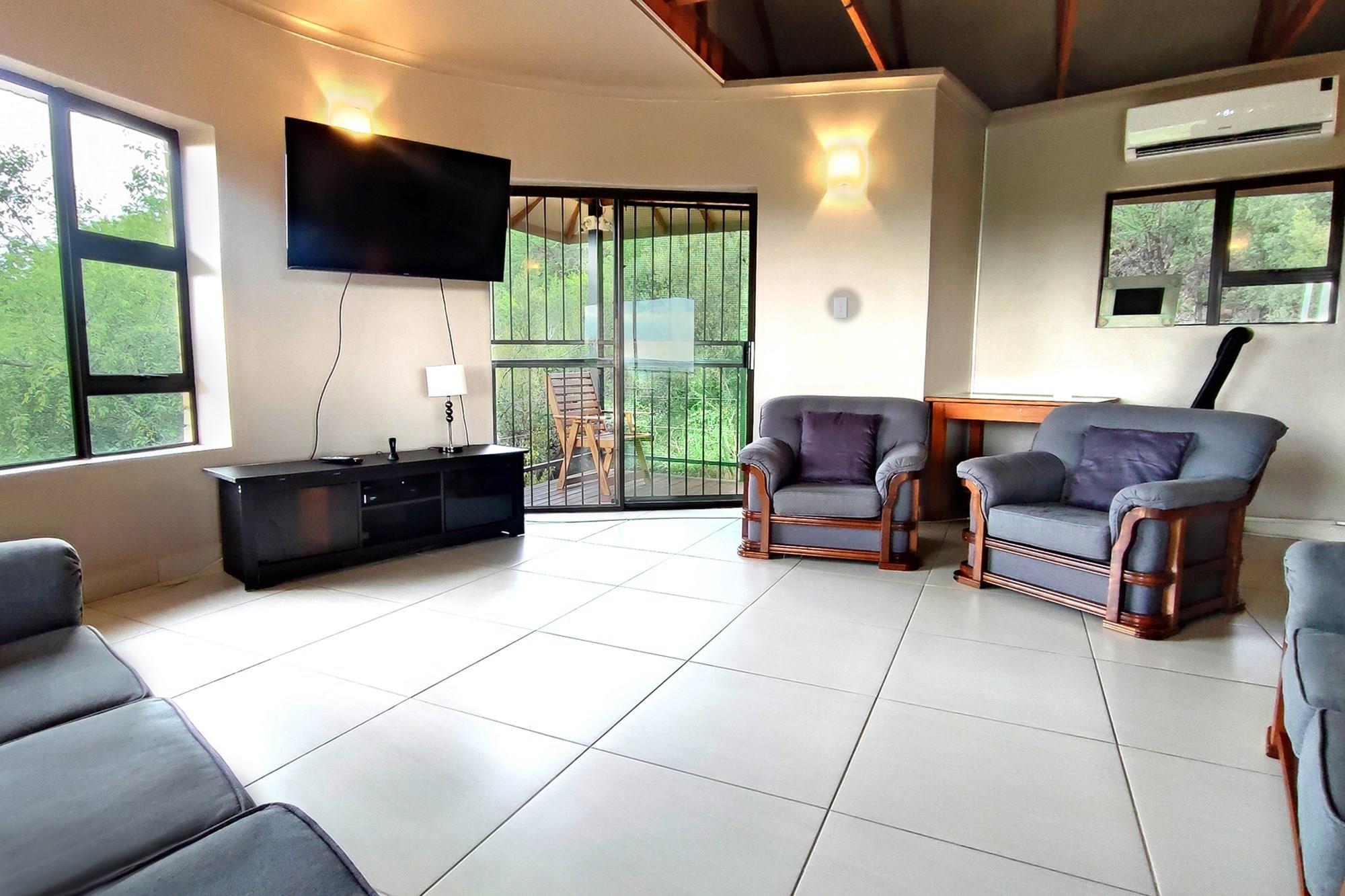 This beautiful home boasts three modern bedrooms, each with its own en-suite bathroom. The main bedroom is situated on the upper level with gorgeous views of the African bushveld. Step into this sanctuary and be greeted by a spacious layout, complete with a full-length patio offering awe-inspiring views that will leave you breathless. For your ultimate comfort, the main bedroom is air-conditioned, ensuring a tranquil retreat.