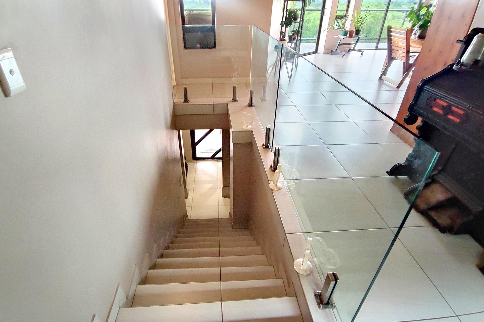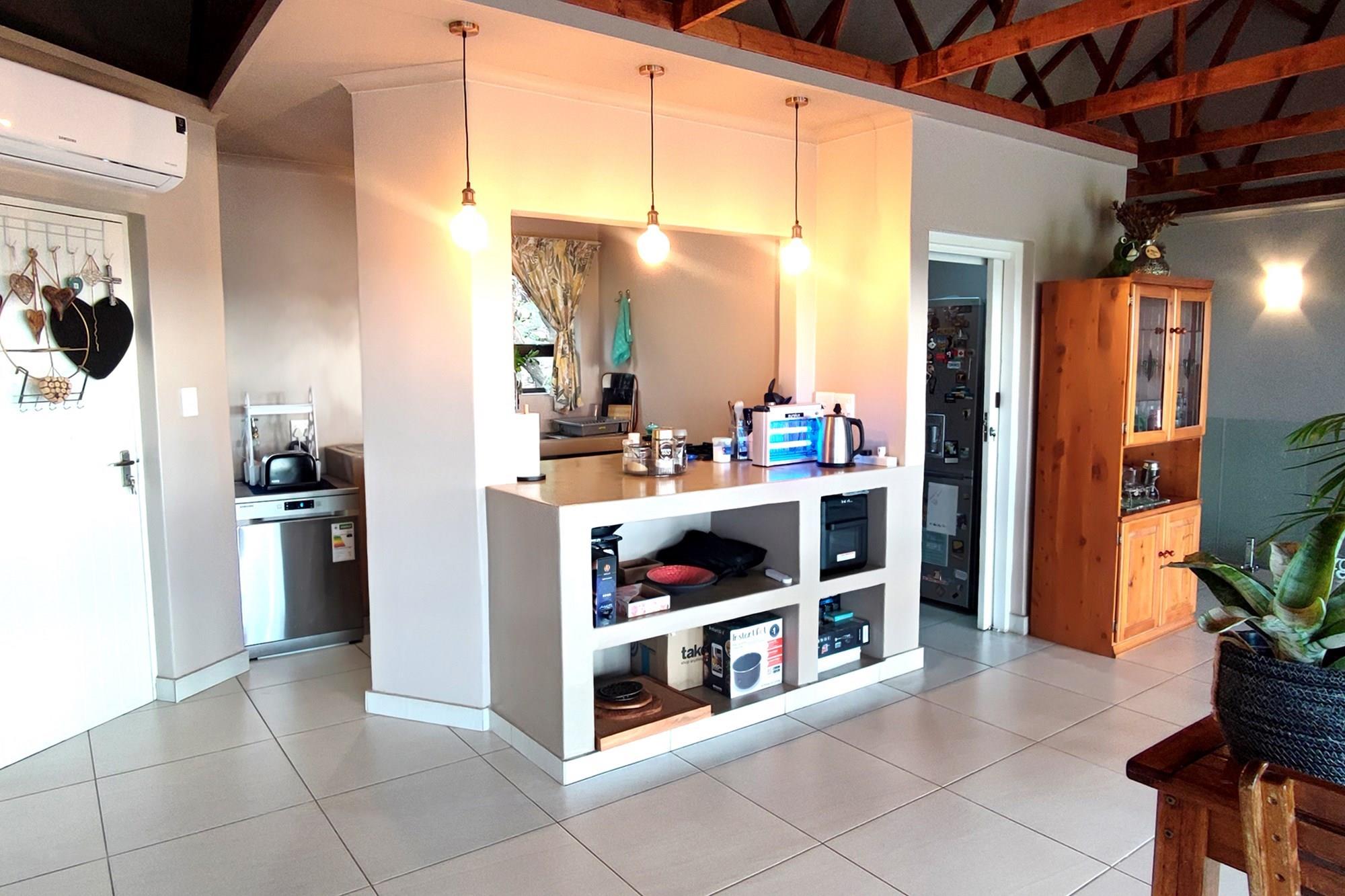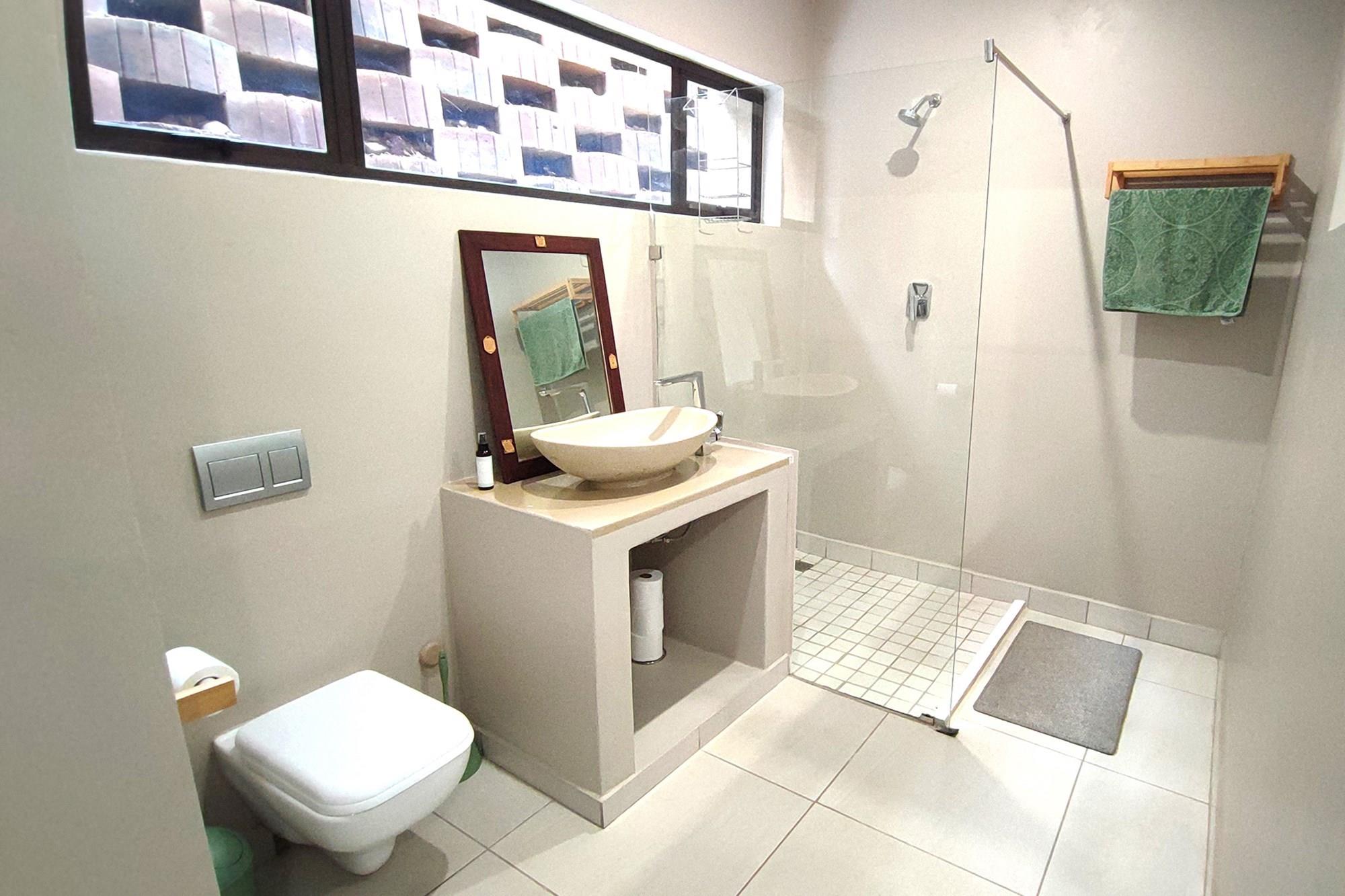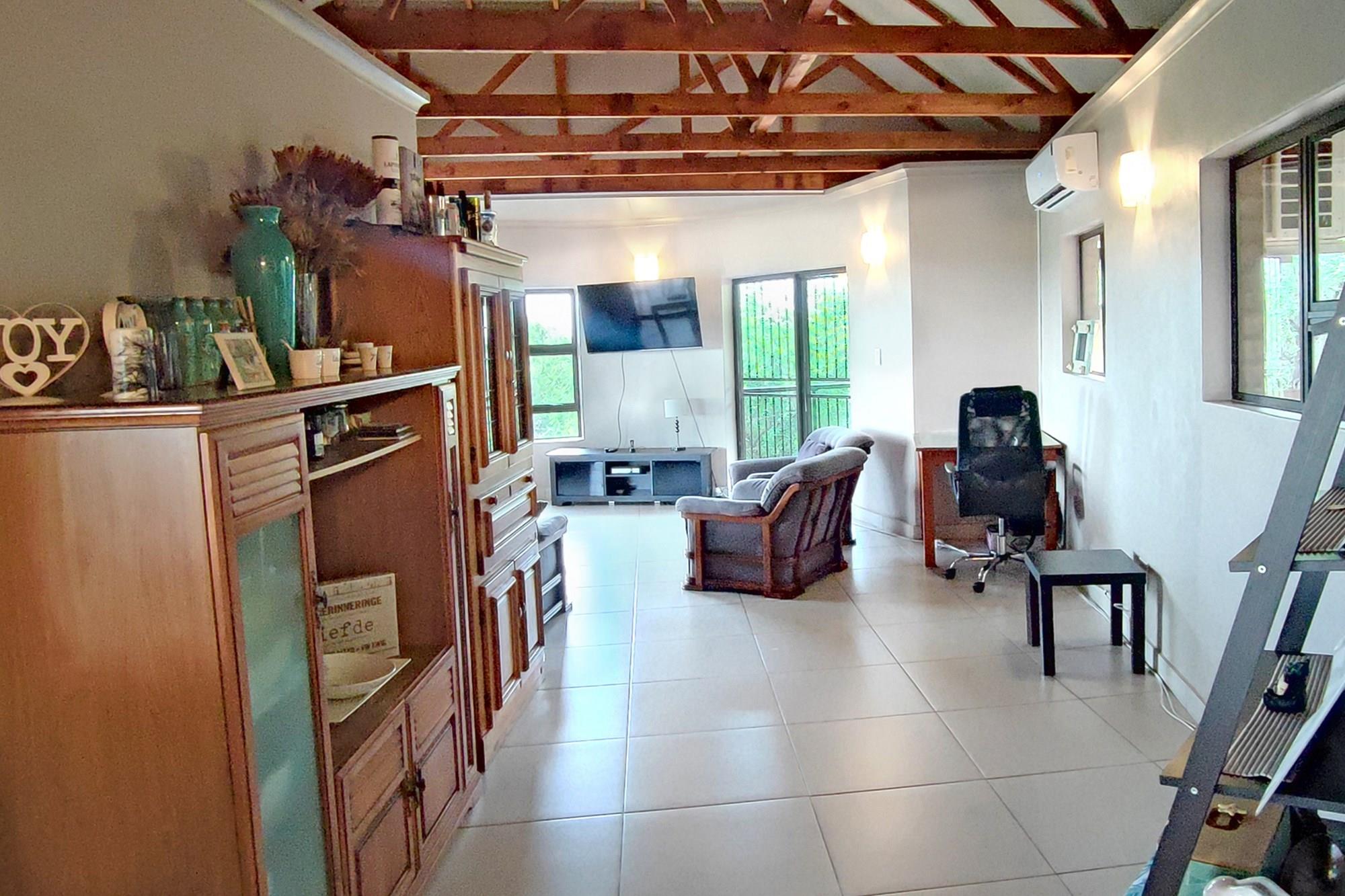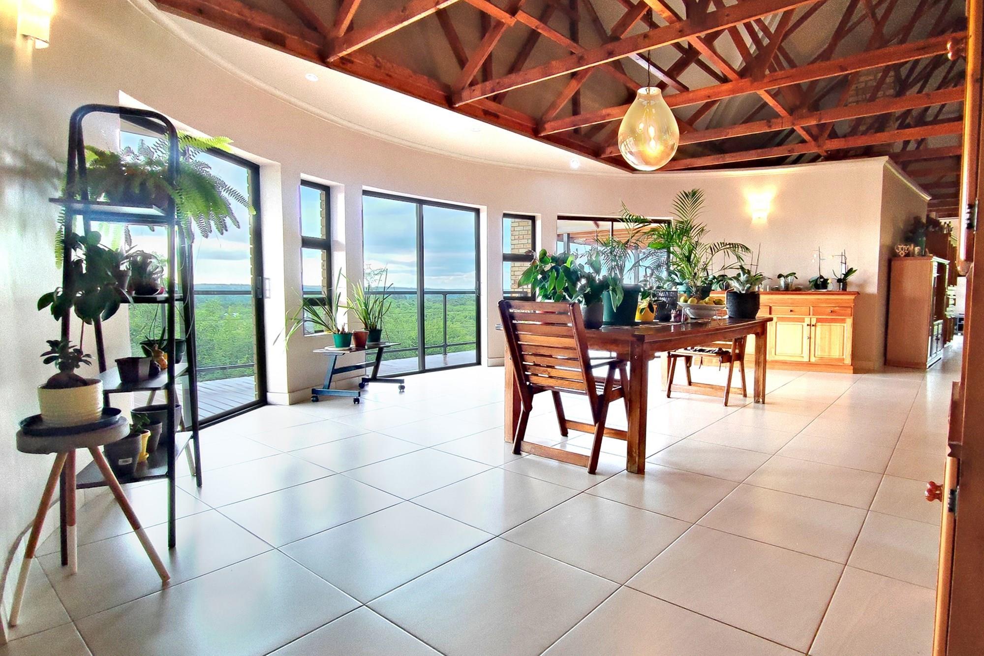 This beautiful home boasts three modern bedrooms, each with its own en-suite bathroom. The main bedroom is situated on the upper level with gorgeous views of the African bushveld. Step into this sanctuary and be greeted by a spacious layout, complete with a full-length patio offering awe-inspiring views that will leave you breathless. For your ultimate comfort, the main bedroom is air-conditioned, ensuring a tranquil retreat.