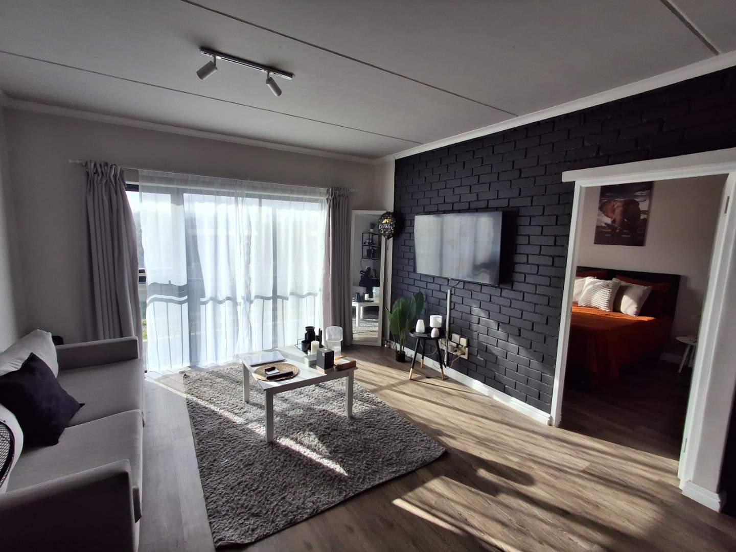 The living area has contemporary charm with a striking dark grey brick feature wall, creating a stylish focal point. The beautiful vinyl flooring offers both durability and a modern touch.