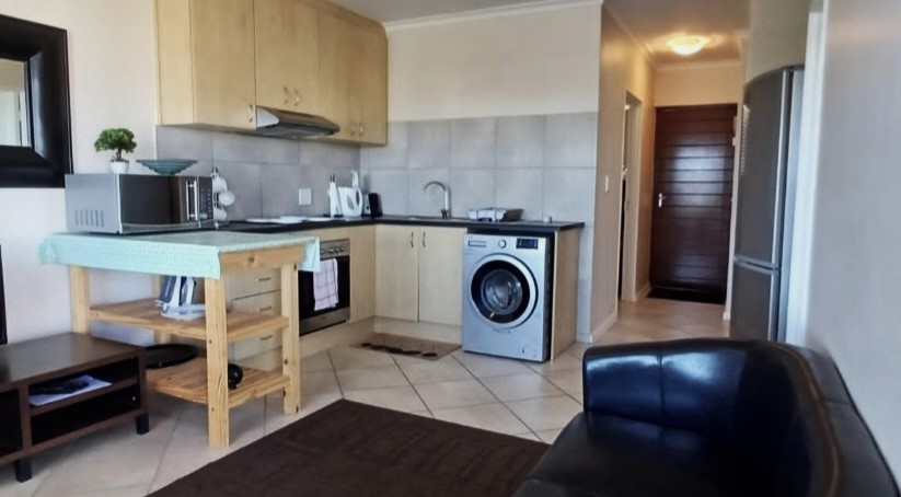 The apartment features a lounge and dining room overlooking an open-plan kitchen equipped with a fitted under-counter stove and extractor fan. The lounge has a door that leads to a lovely balcony, offering views of the entire Cape Town area. Fibre is included with the rent. Available immediately