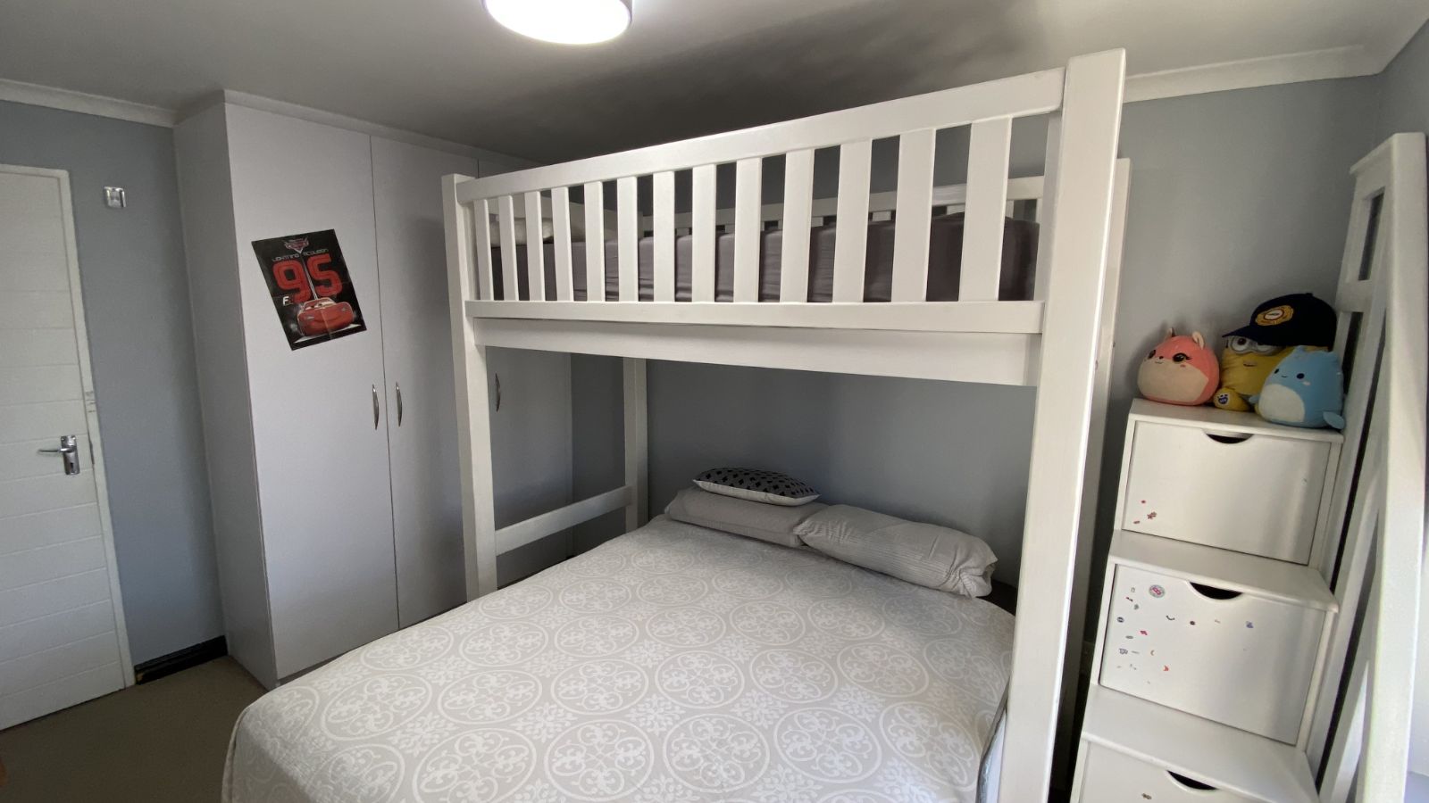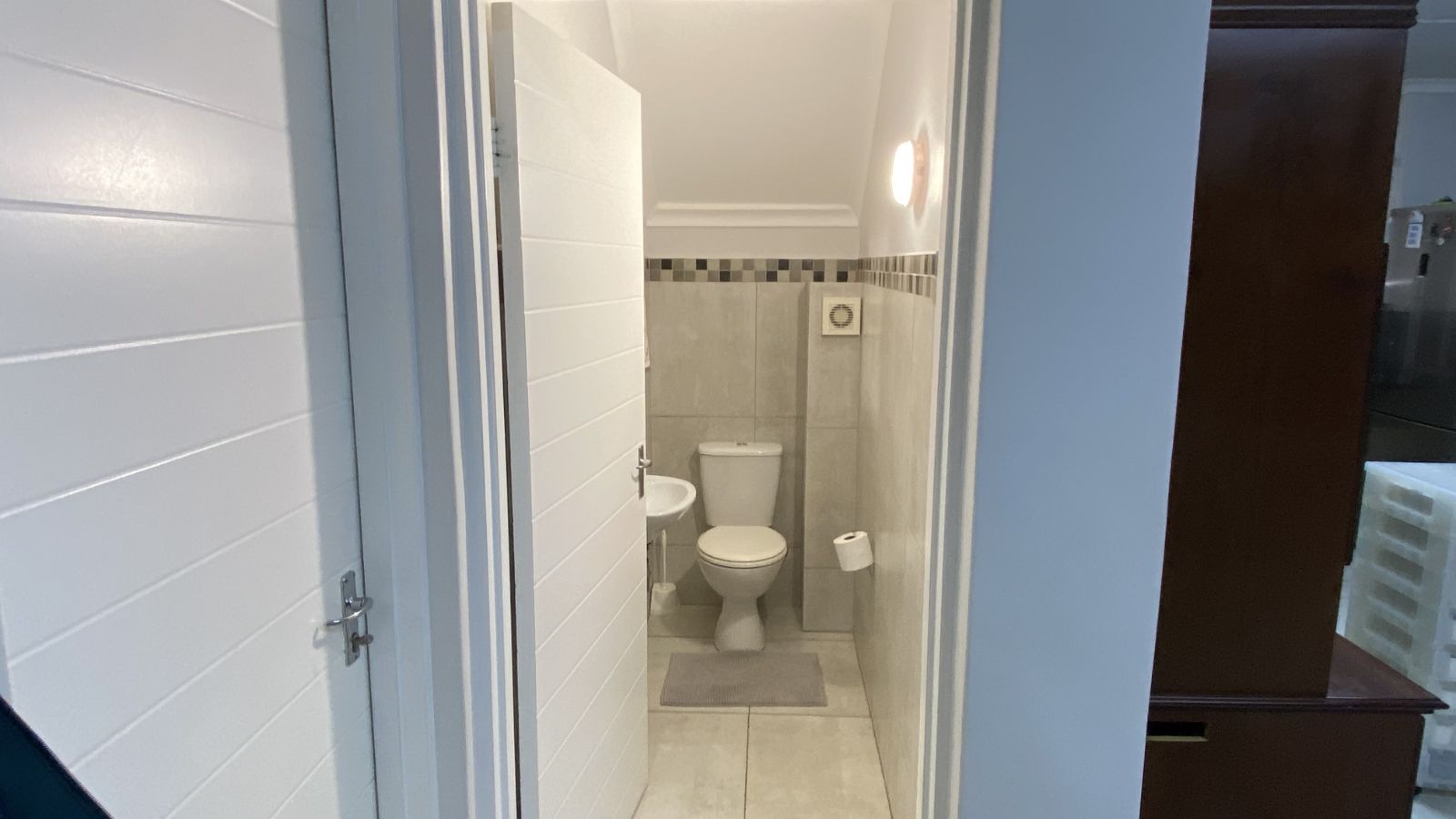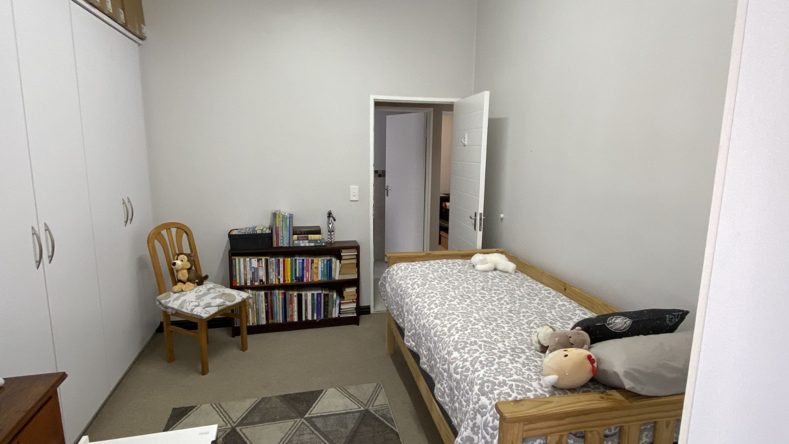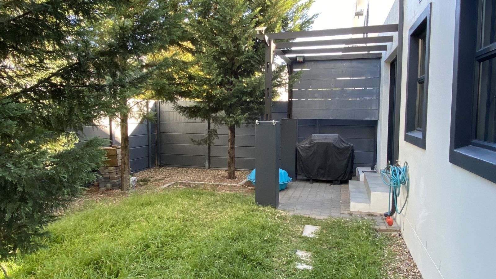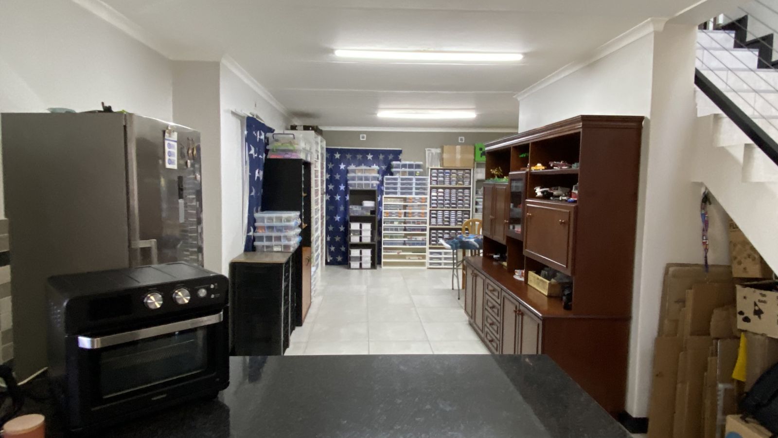 3 bedrooms on the secured top floor and two with built-in cupboards. The main bedroom is en-suite, complemented by a family bathroom and a convenient downstairs guest toilet. Mosquito netting on the bedroom windows will keep your home pest free and the top-floor airconditioning unit will keep you sleeping comfortably.