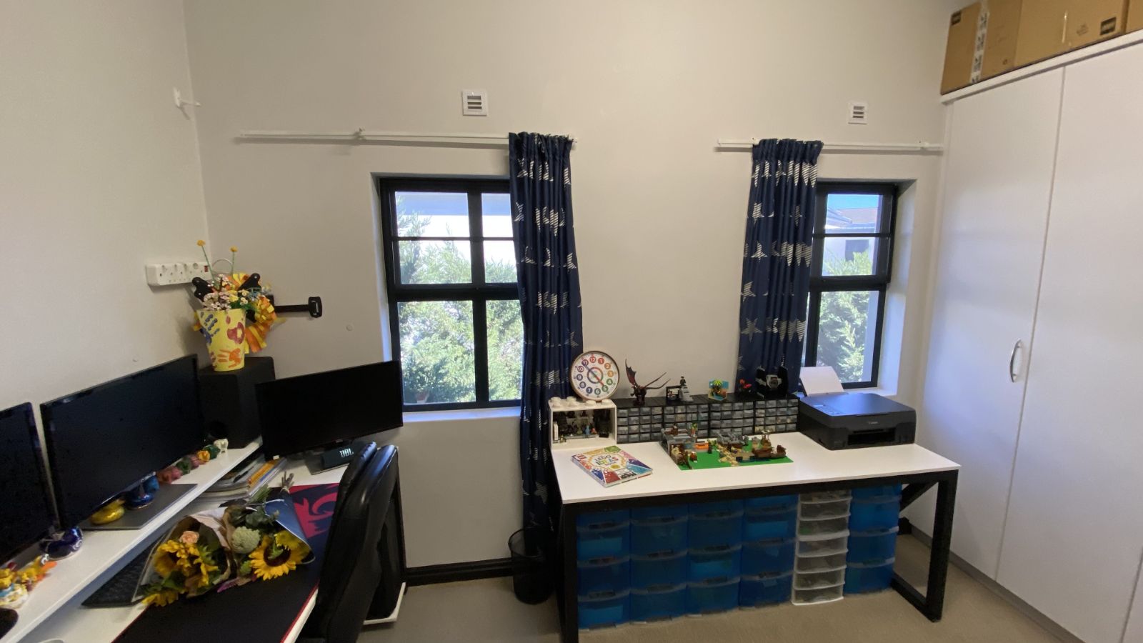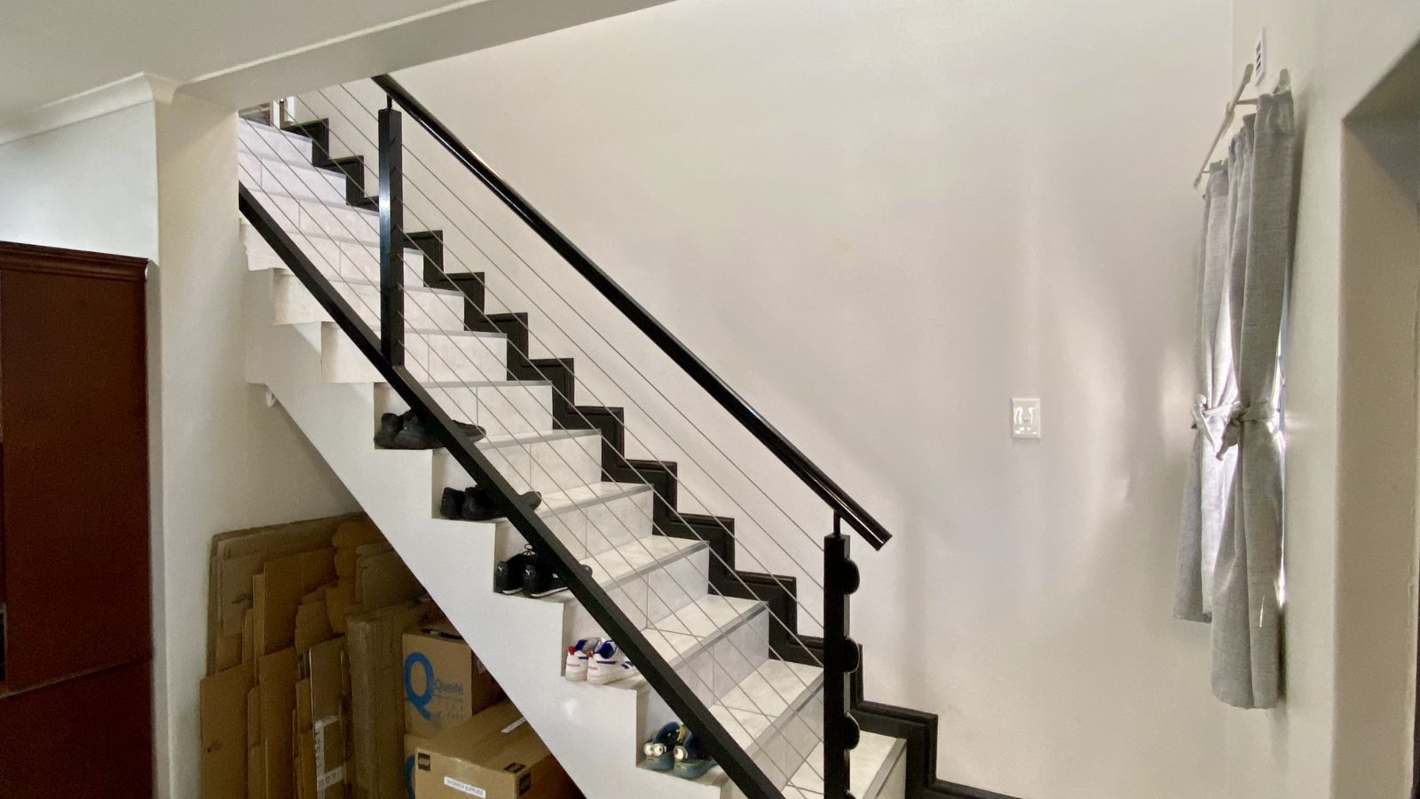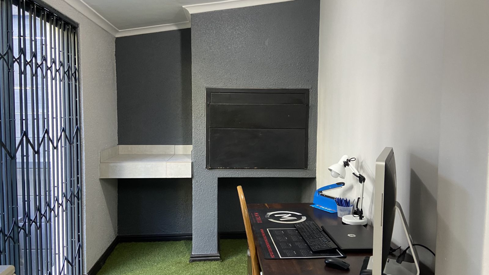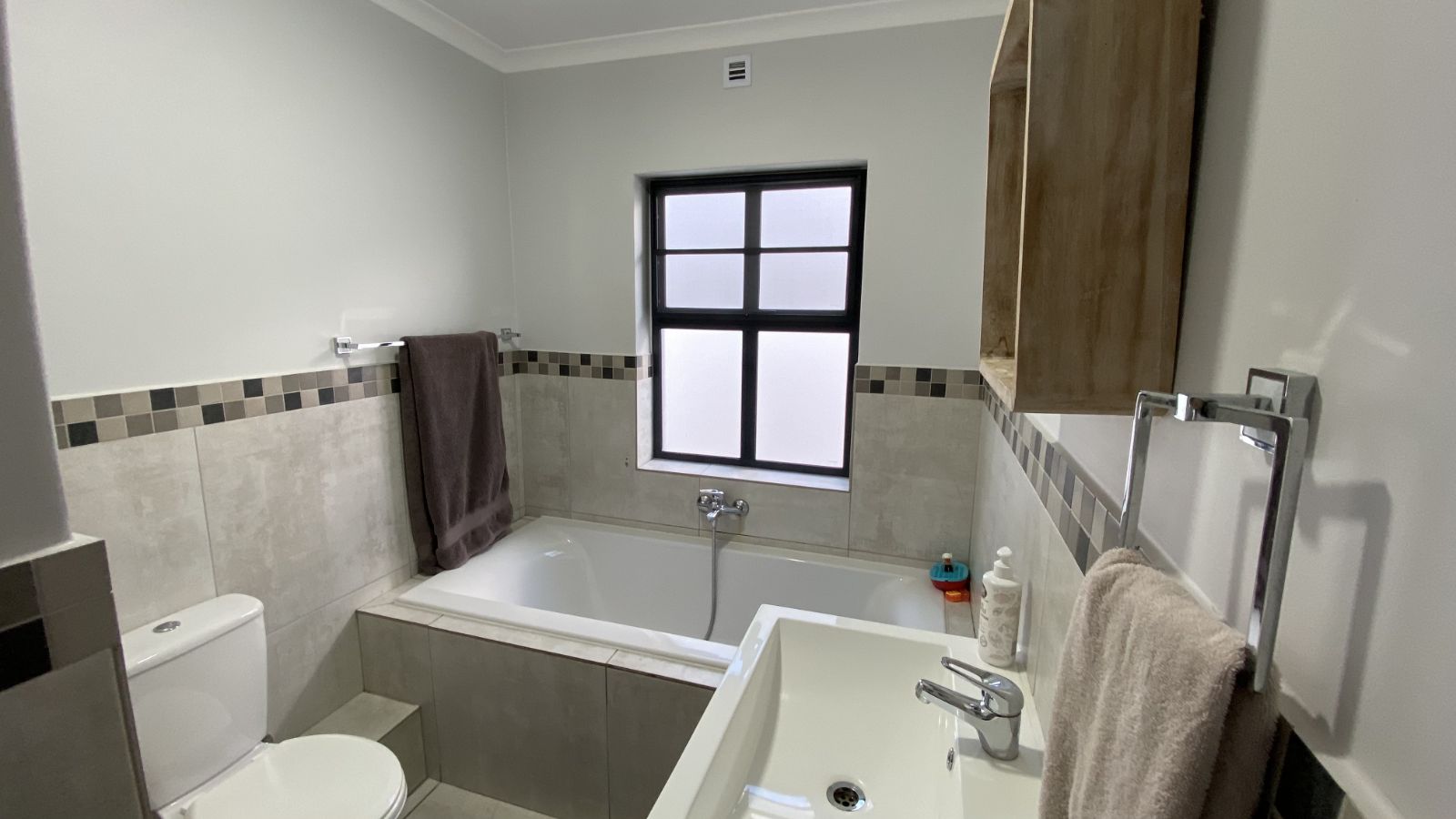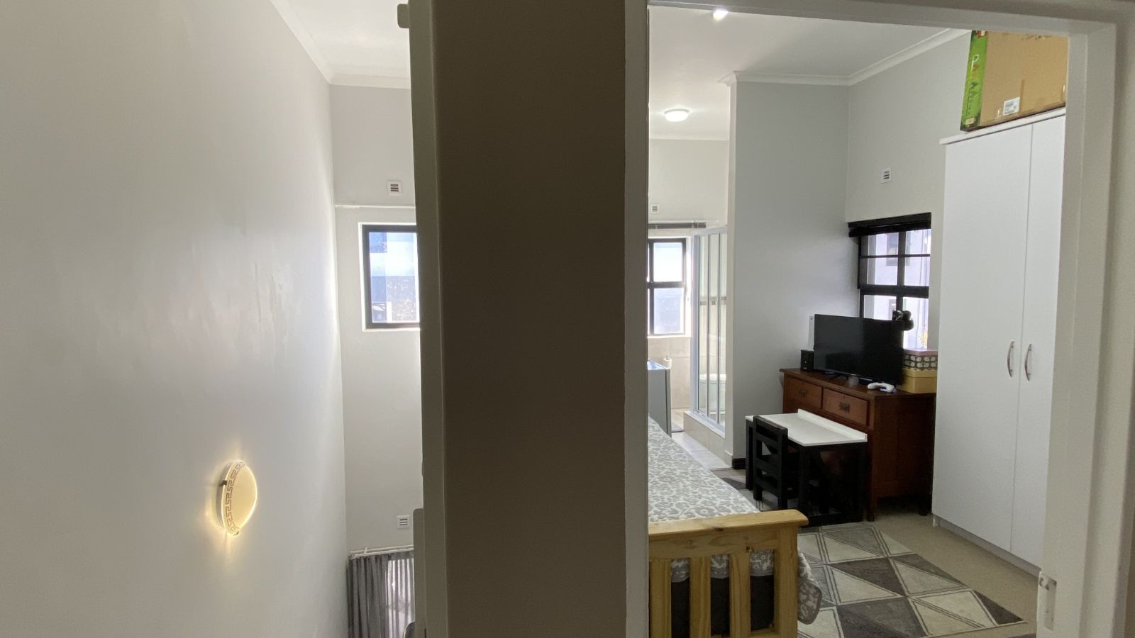 3 bedrooms on the secured top floor and two with built-in cupboards. The main bedroom is en-suite, complemented by a family bathroom and a convenient downstairs guest toilet. Mosquito netting on the bedroom windows will keep your home pest free and the top-floor airconditioning unit will keep you sleeping comfortably.