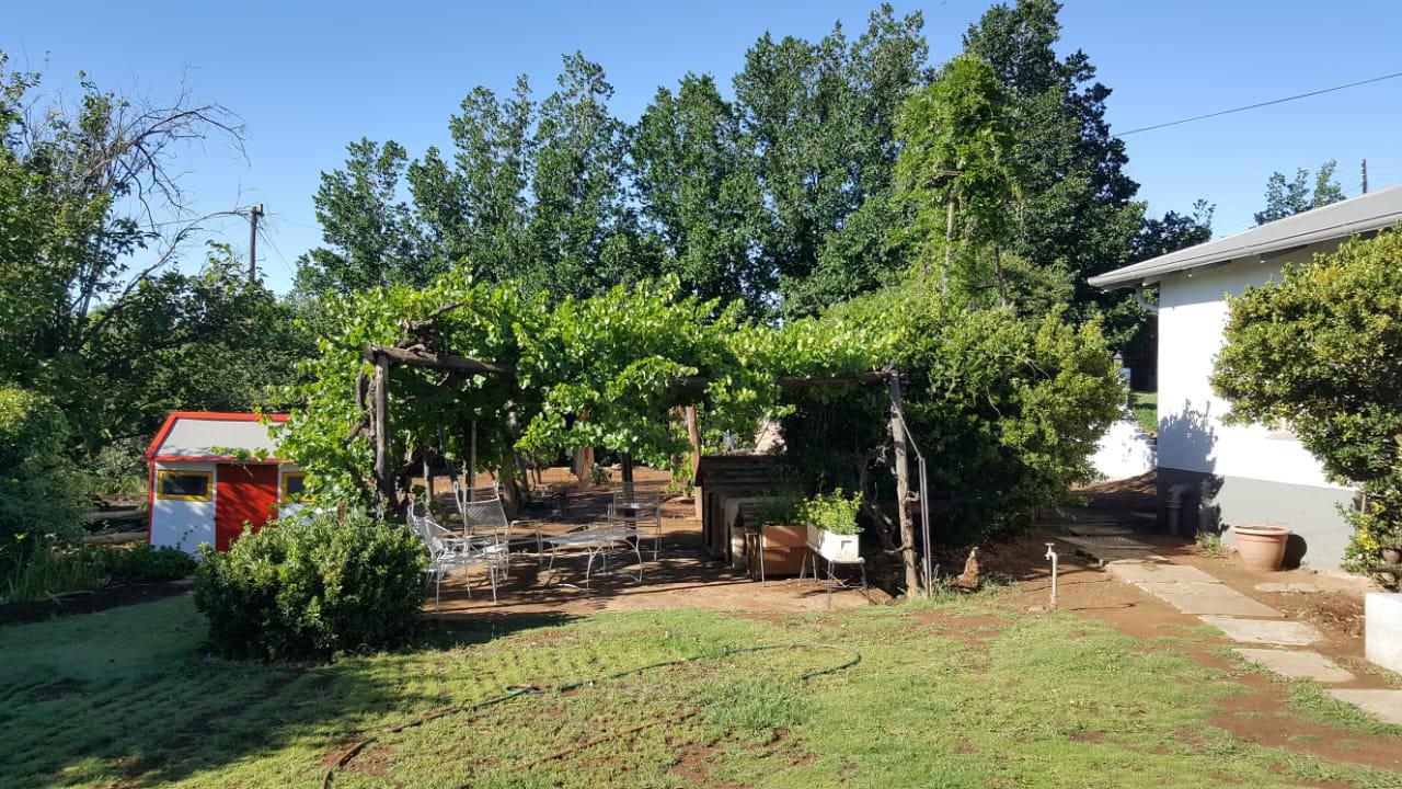 Goedversorgde tuin met drie terras-grasperke, n groot area vir groente en 34 vrugtebome