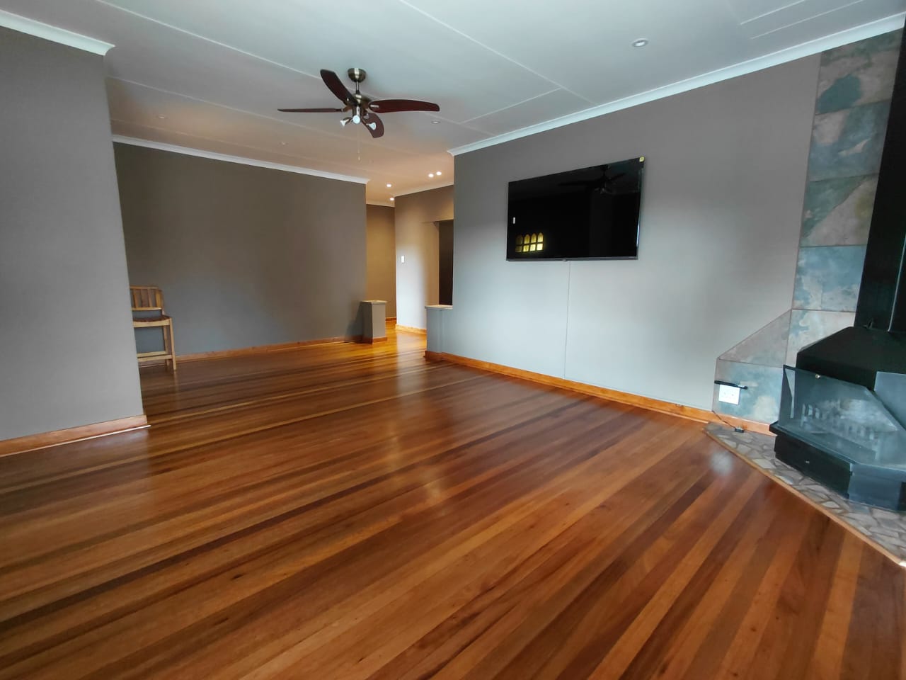 The lounge is a standout feature, boasting warm wooden floors, a striking feature fireplace, and a ceiling fan, creating an inviting space for relaxed evenings and entertaining.