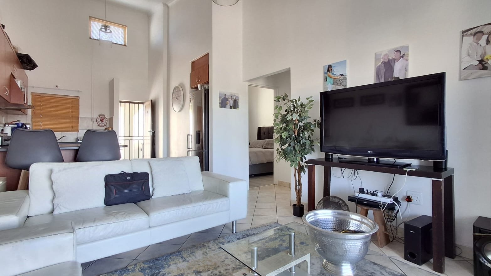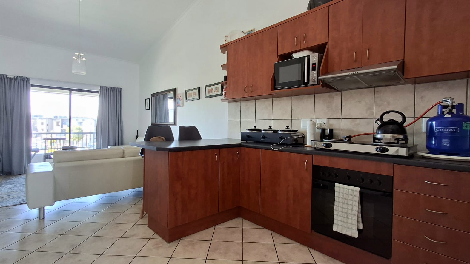 Spacious, tiled living area - High ceilings; Leading out to a well sized balcony with expansive hill and mountain views.