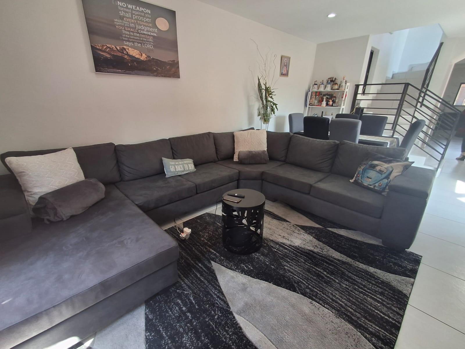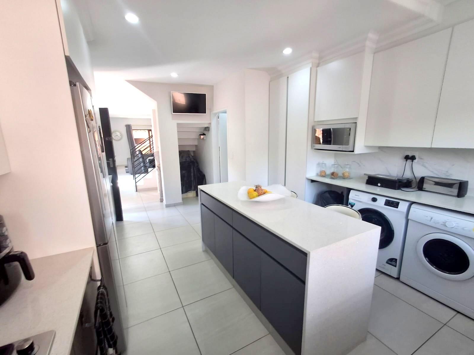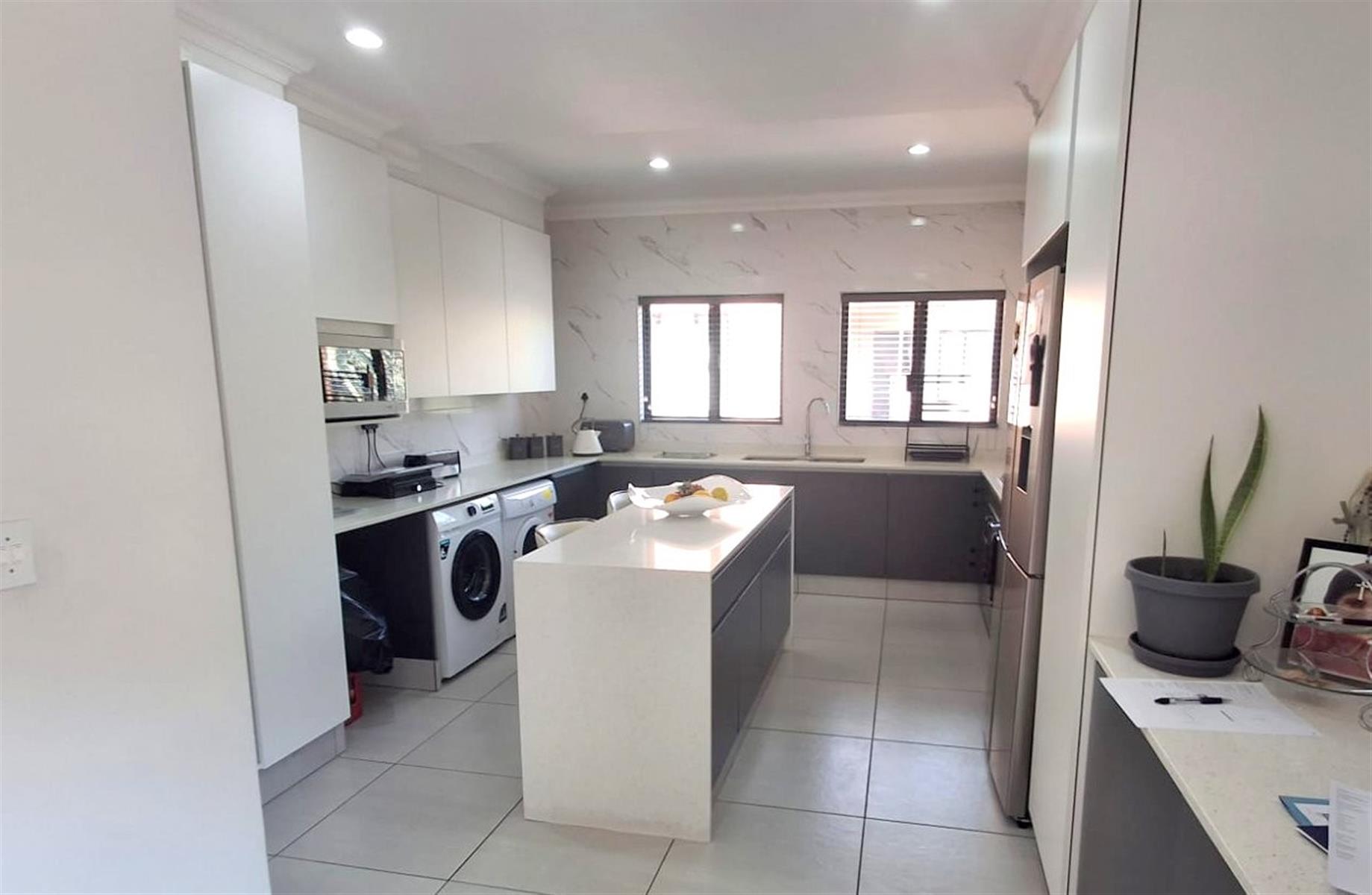 A light and airy interior greets you as you enter, pale grey floor tiles and white walls with an open plan lounge and dining room. A large kitchen with white ceasarstone counter tops and a superb centre island. Charcoal under counter cupboard doors and white above counter cupboard doors. A gas hob and electric oven, Dedicated spaces for the microwave, washing machine and dishwasher, as well as space for a double door fridge.