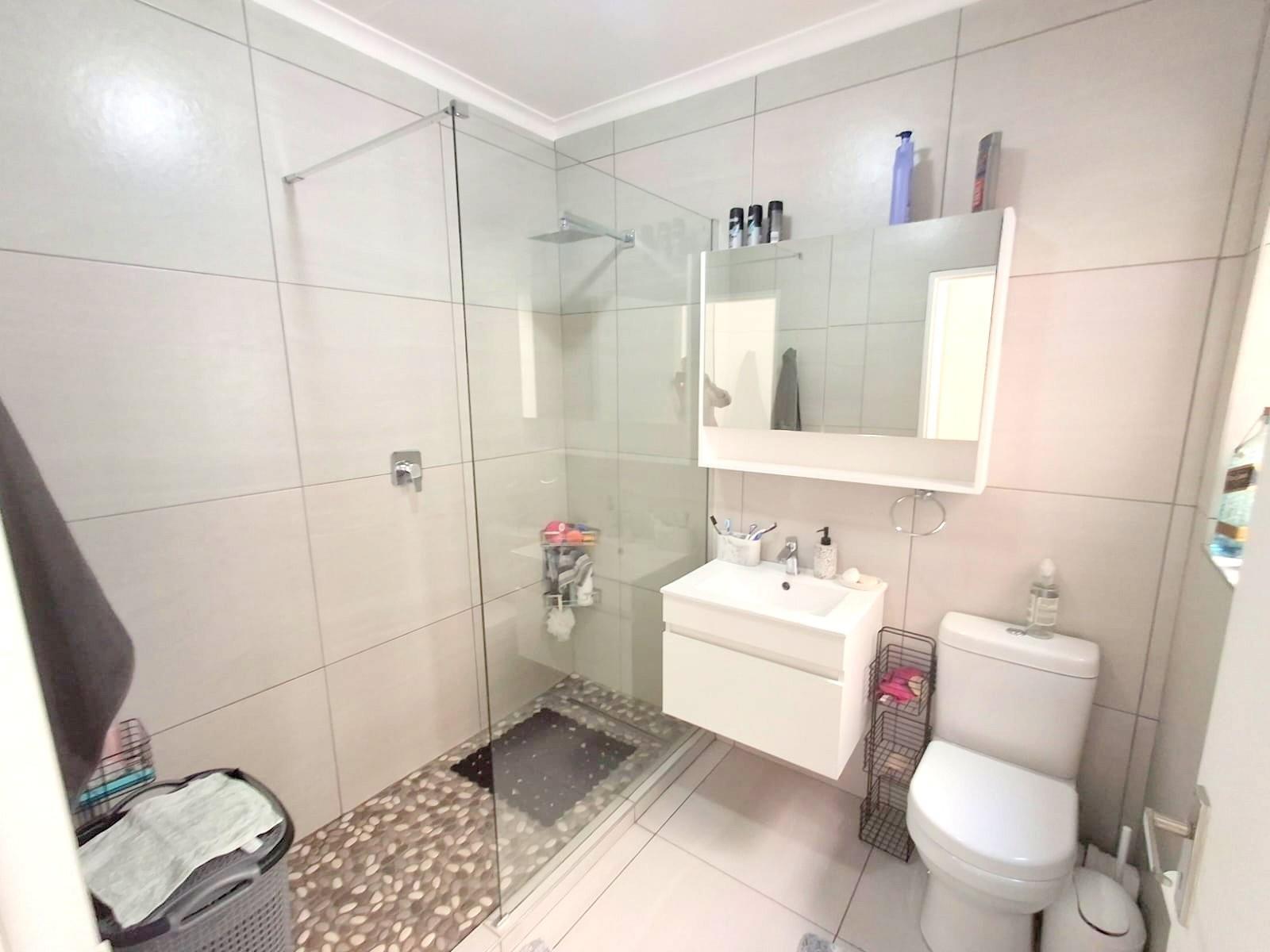The bathroom is spacious with a large glass enclosed shower, basin and toilet. Tiled floor to ceiling with modern fixtures.