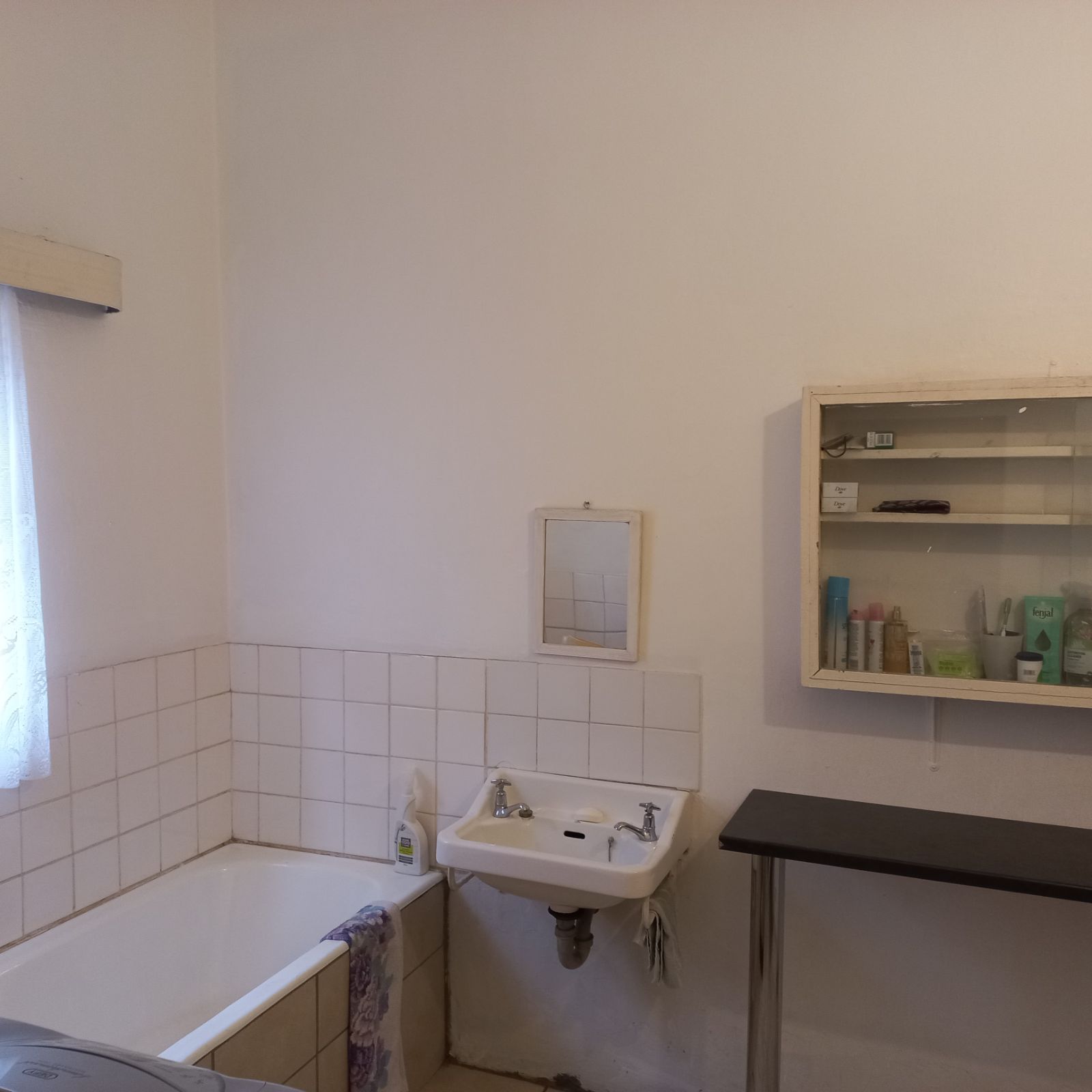A spacious bathroom, including a bath, shower, toilet, and basin, with extra storage for added convenience.