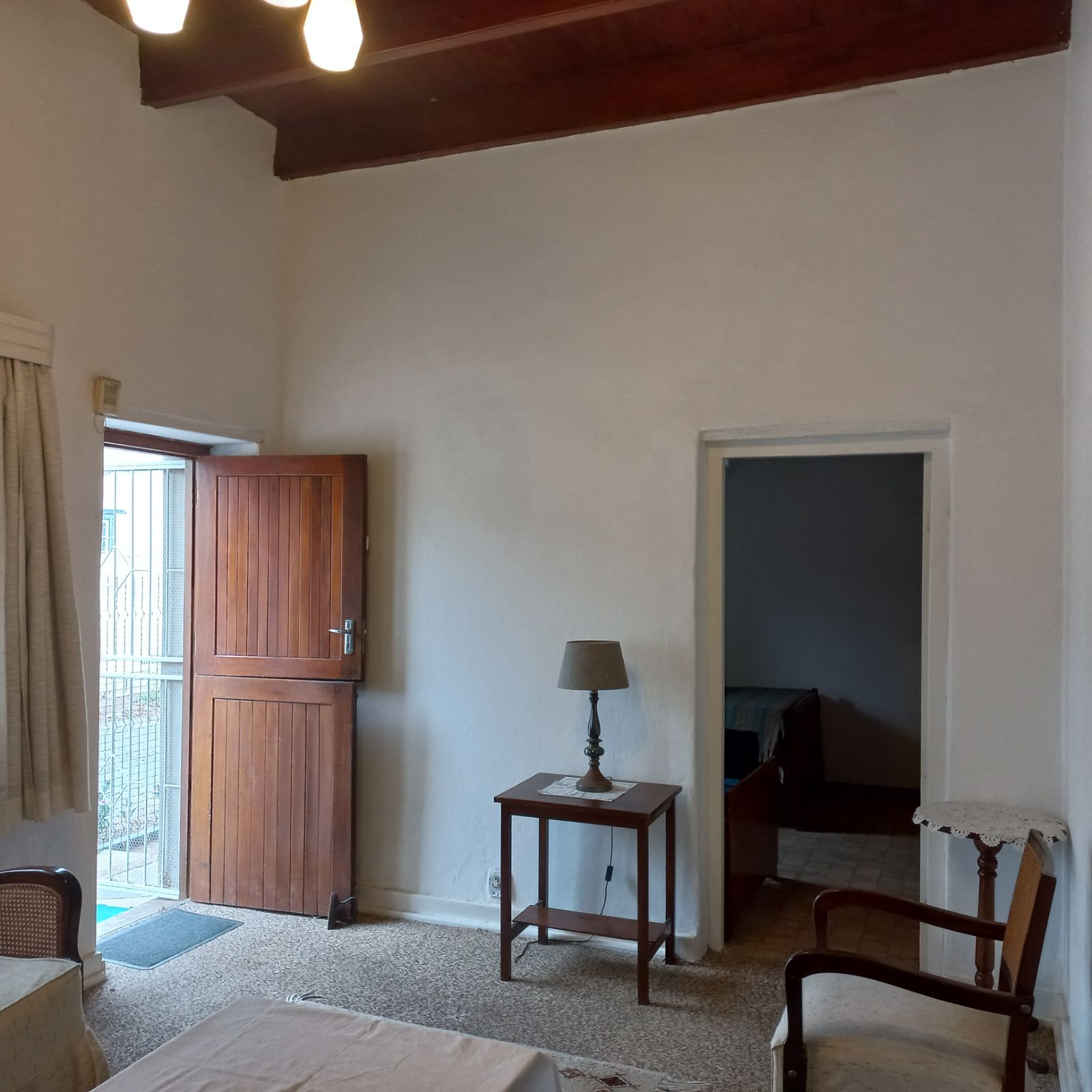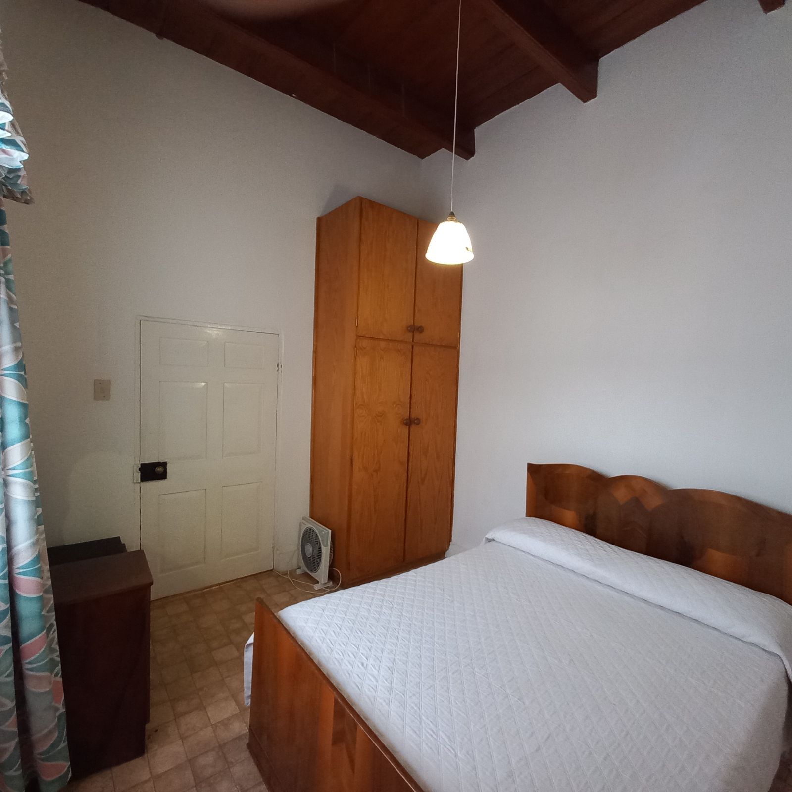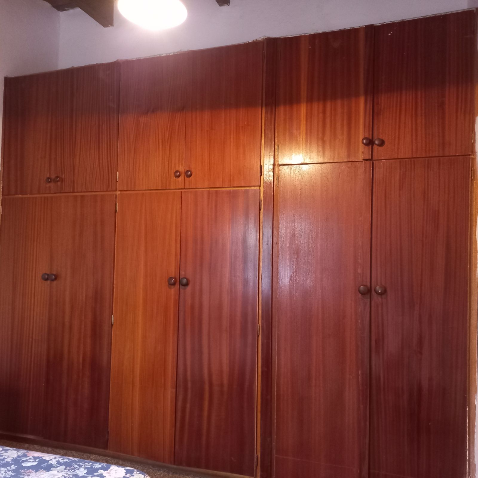 Three spacious bedrooms, each featuring built-in cupboards and elegant wooden ceilings.