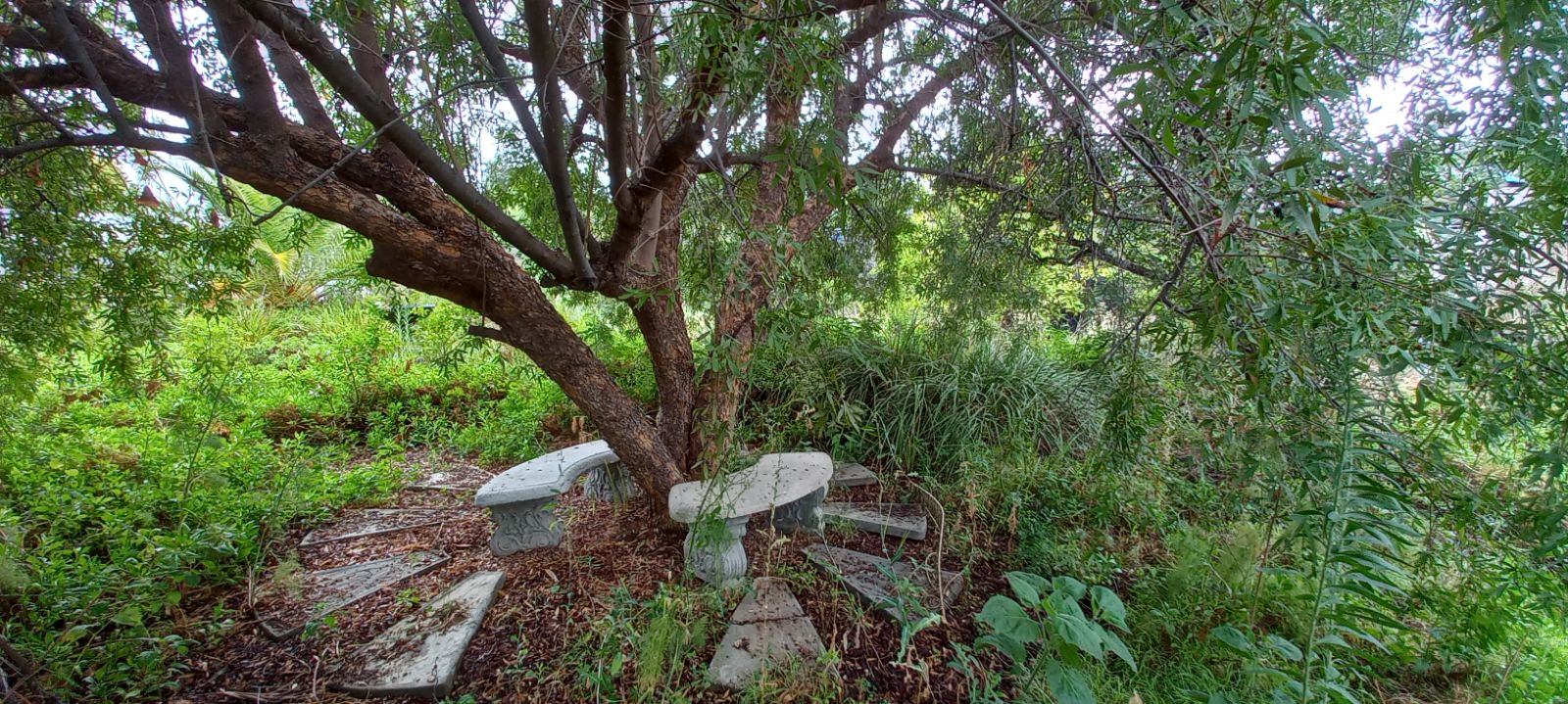 A lush, established garden with a charming pathway and entertainment area.