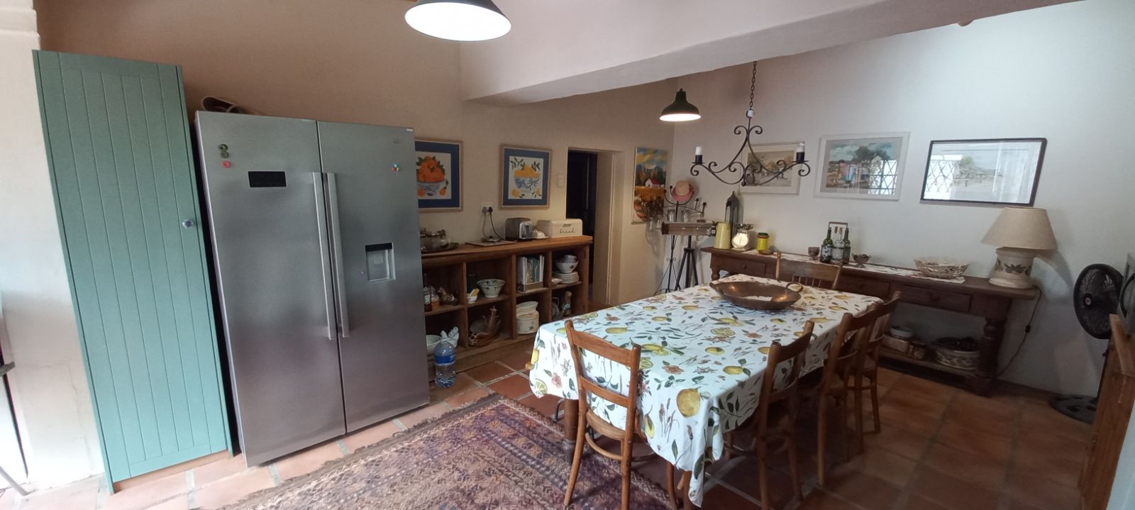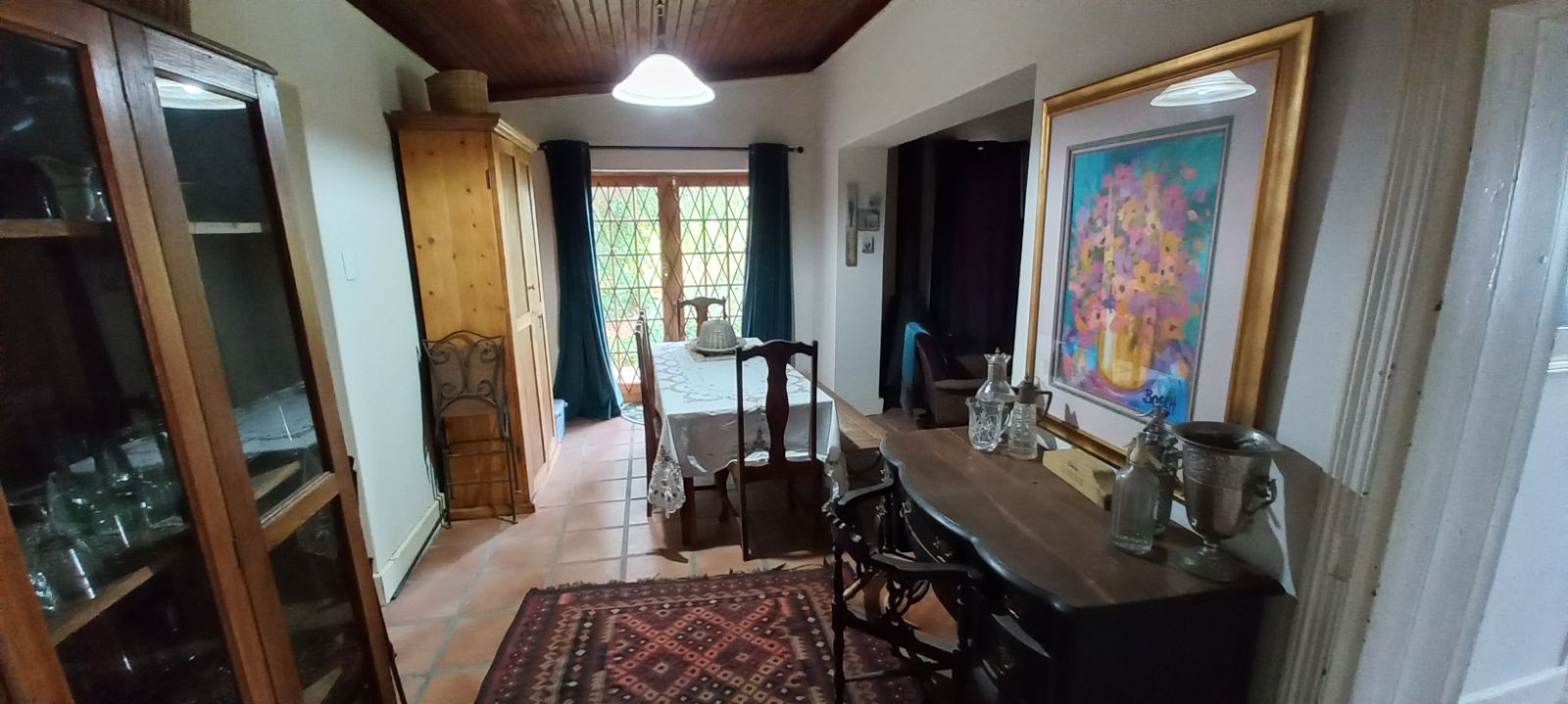 An inviting dining room with double doors opening onto the garden.