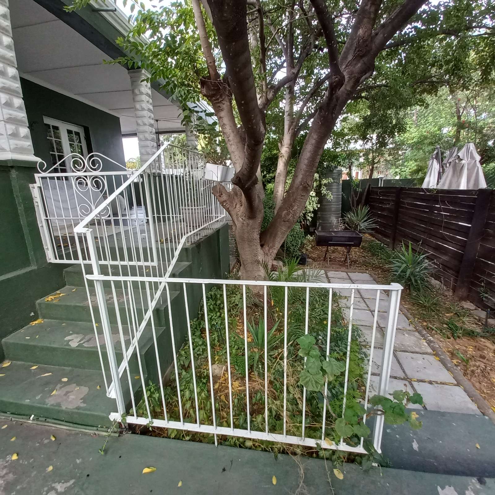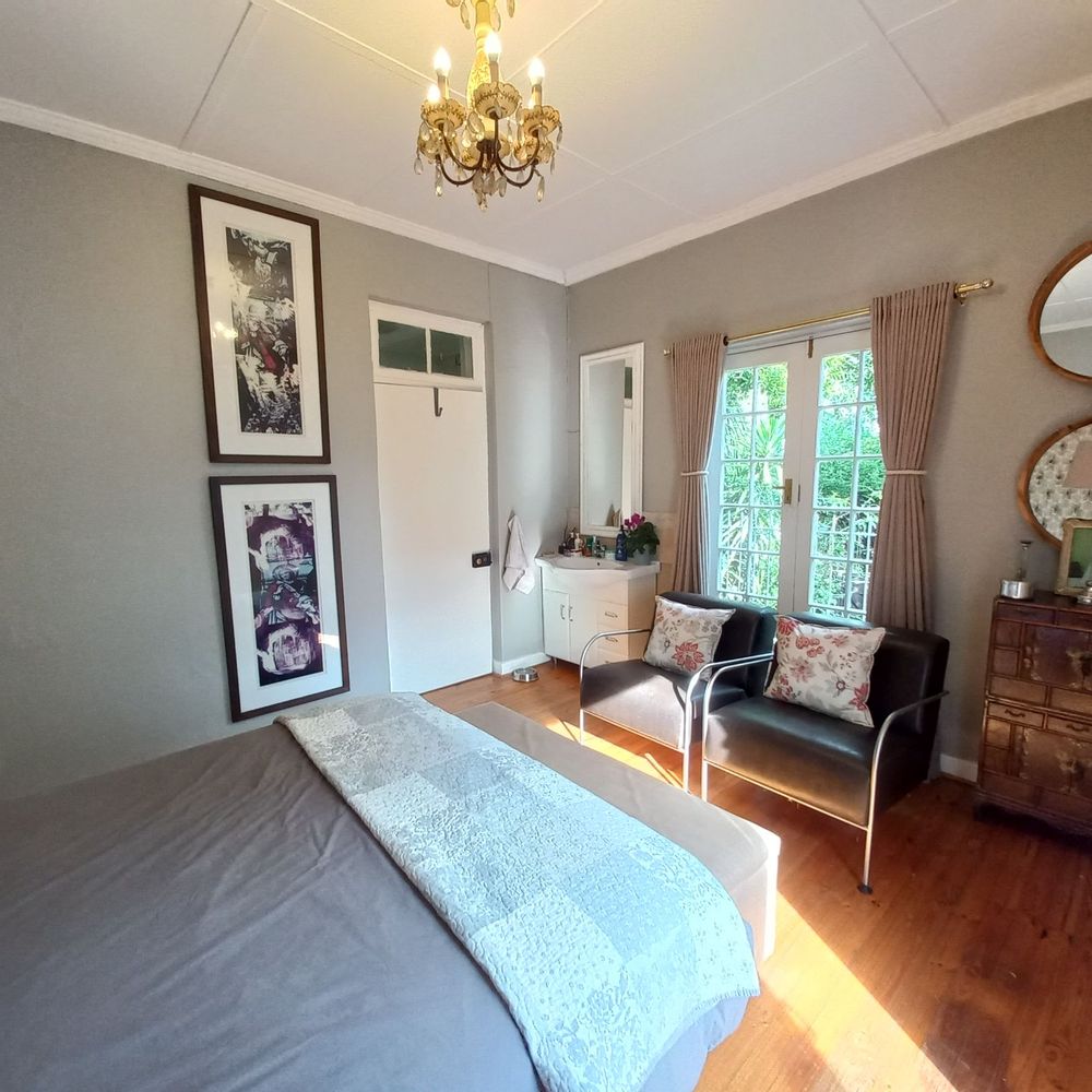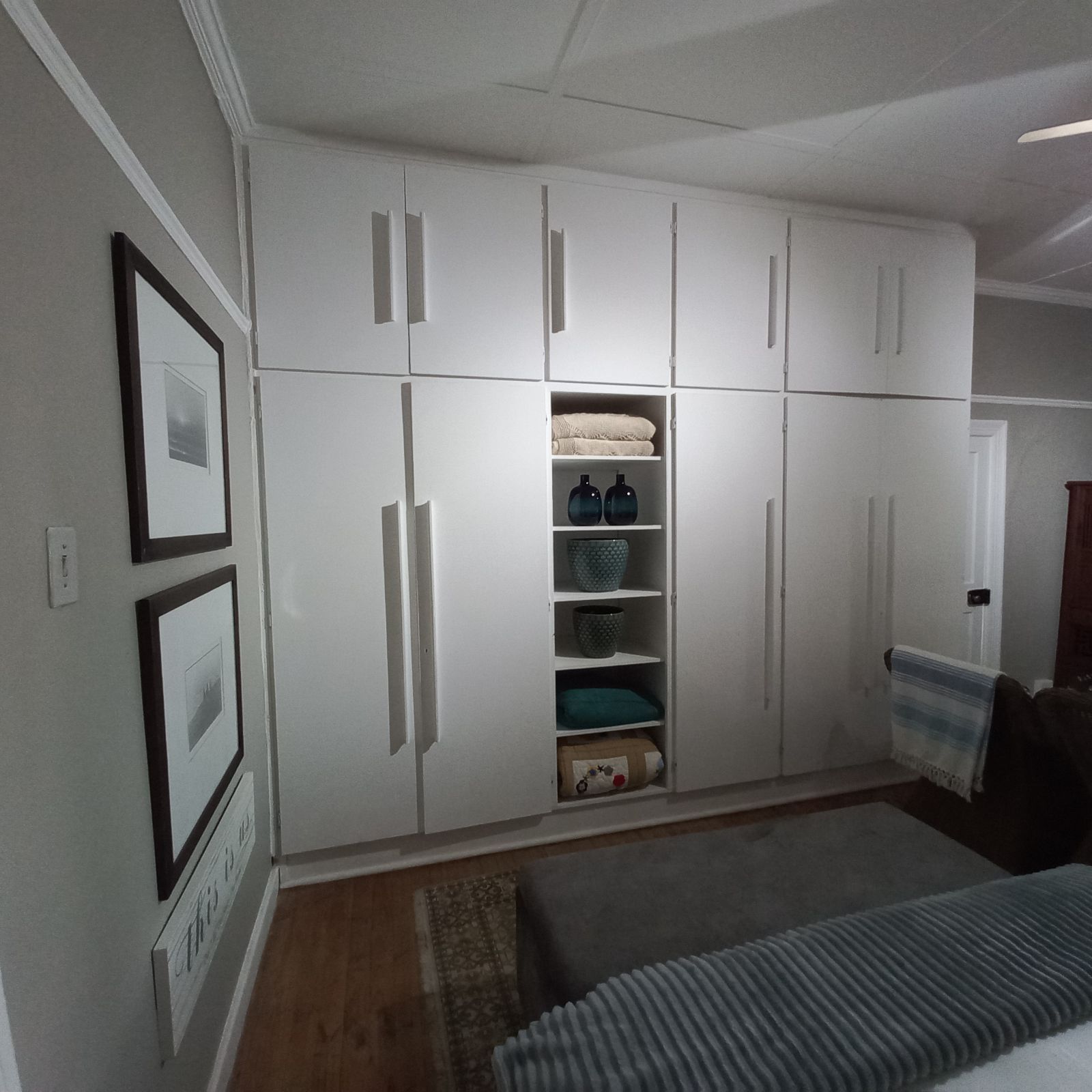 Second bedroom with built-in cupboards and elegant wooden/glass double doors opening onto an entertainment porch