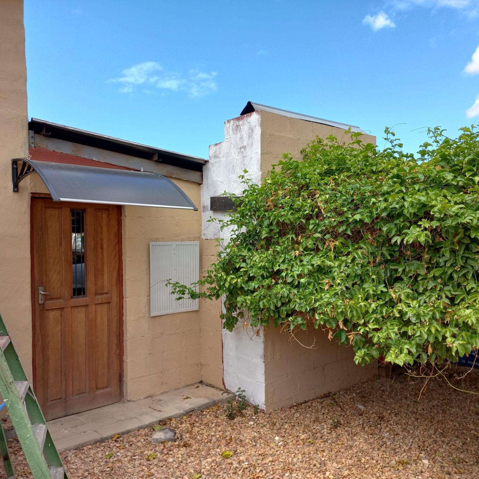Low-maintenance garden with established trees, including White Karee, Karee, citrus trees, and fruit-bearing granadilla plants.