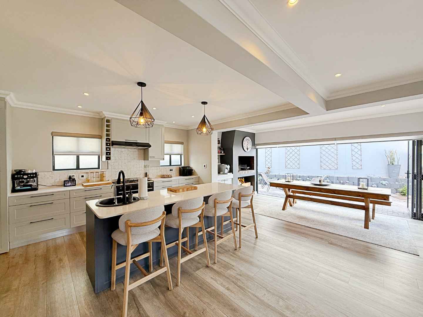 The kitchen is a chef's and entertainer's delight: superbly equipped, functional, and bright. It flows effortlessly into the dining space, which features fold-back doors opening onto a private, tiled back patio. Tucked discreetly away, the scullery provides ample space for appliances and seamless access to the garage, keeping the main entertaining area pristine.