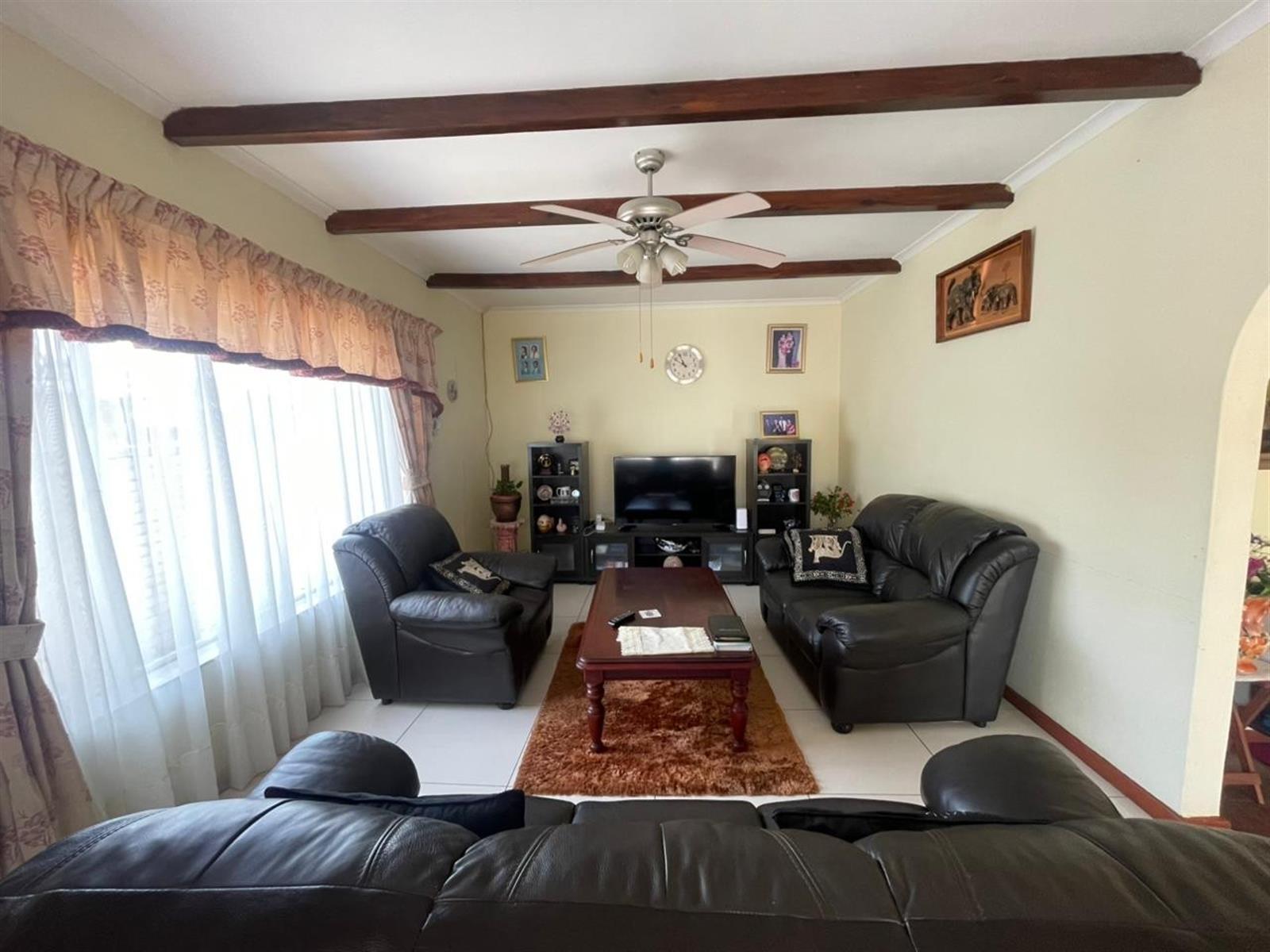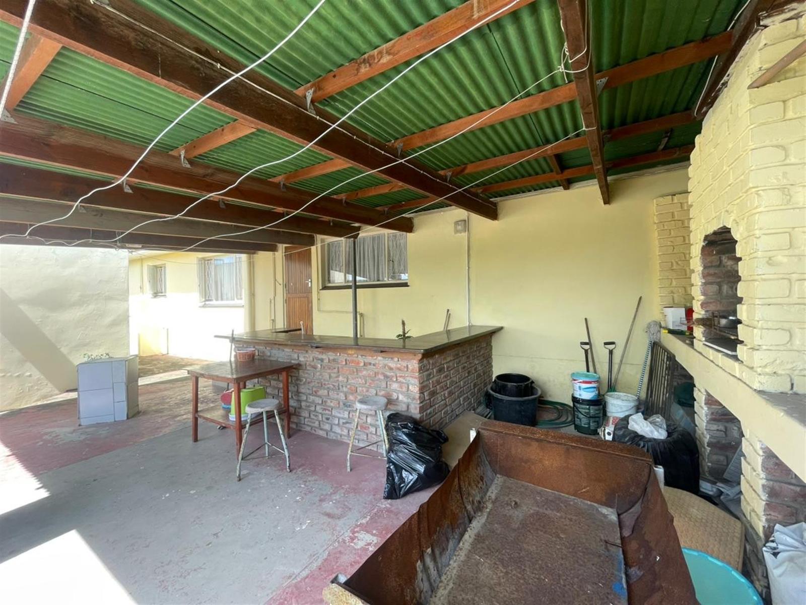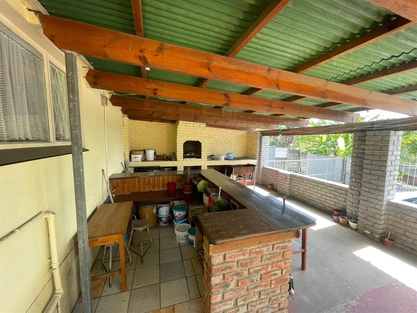 The living areas include a sunny lounge and dining area, flowing into a functional kitchen. From the kitchen, a back door leads to a large undercover entertainment area, complete with a built-in braai and bar — ideal for entertaining family and friends.