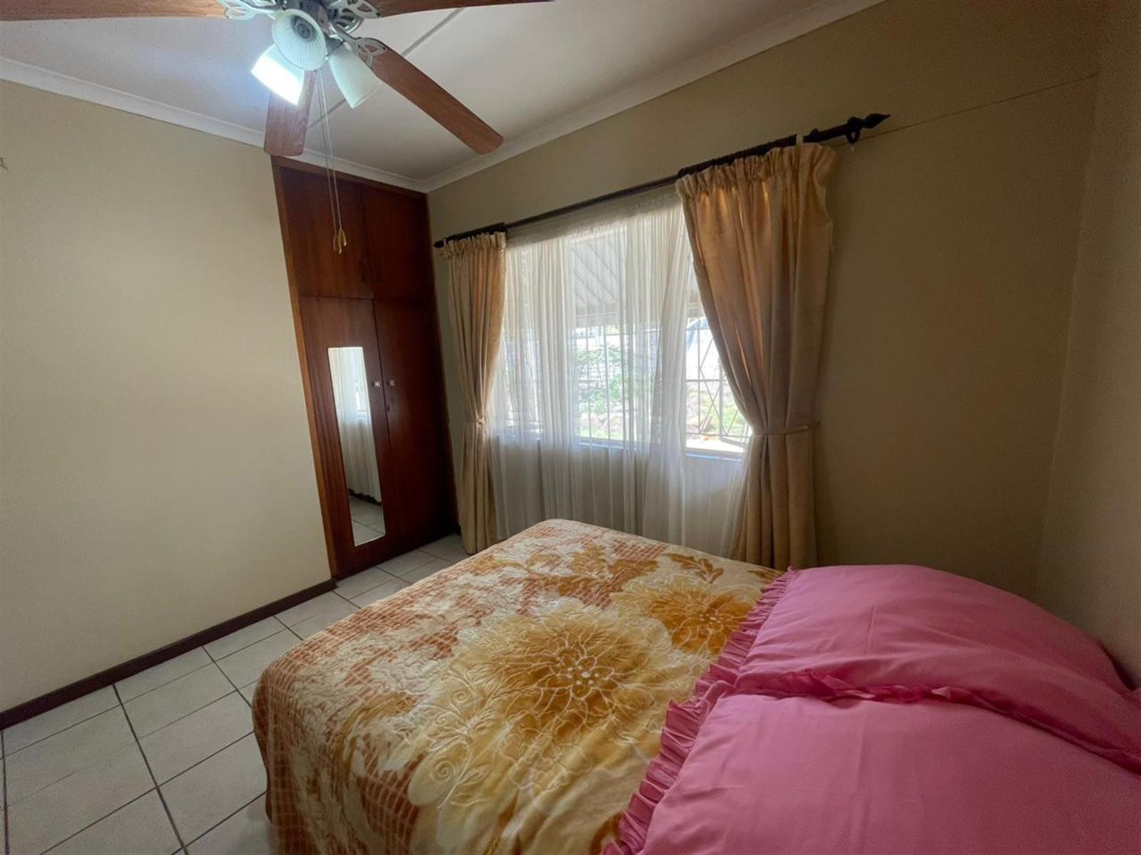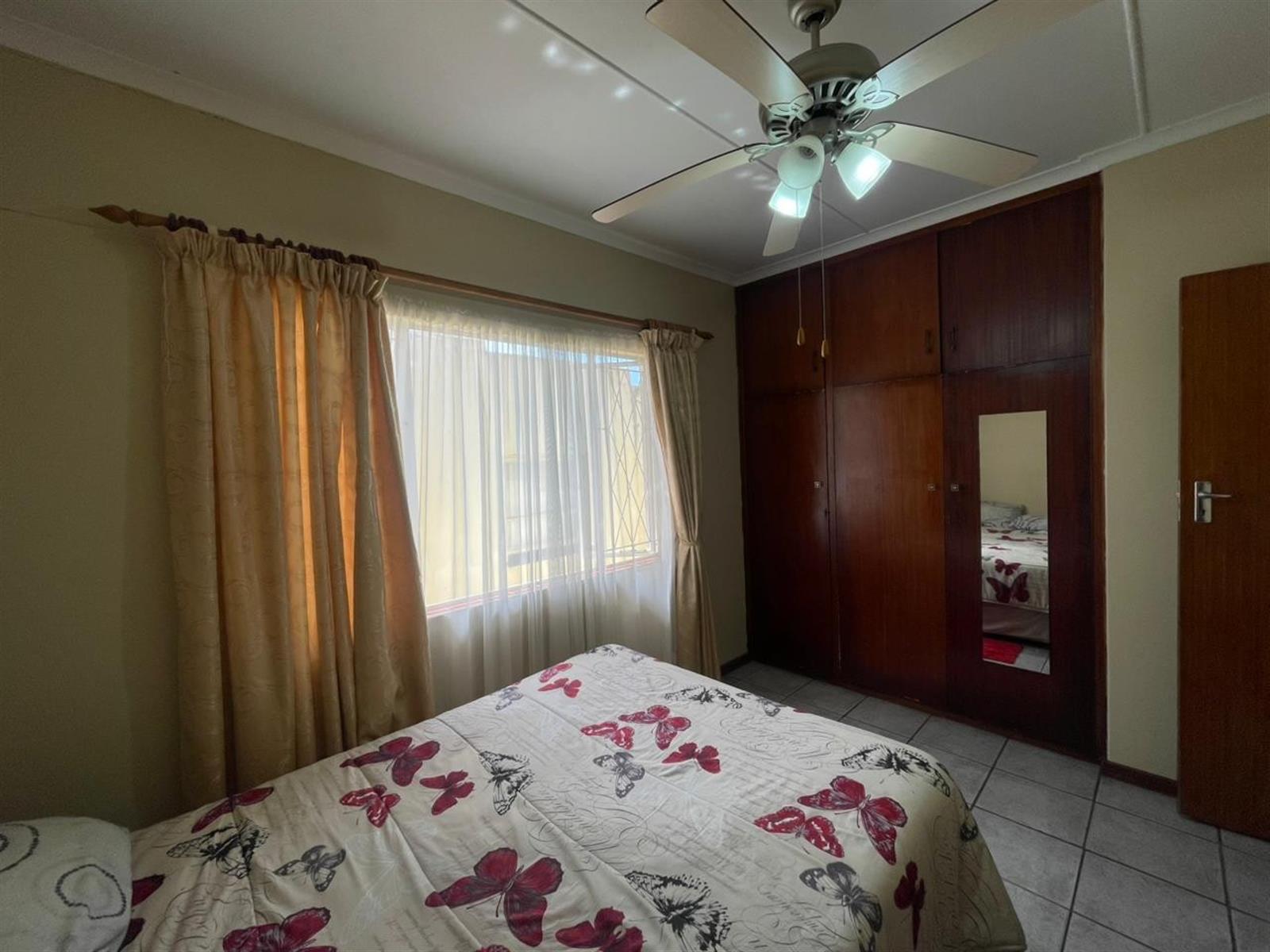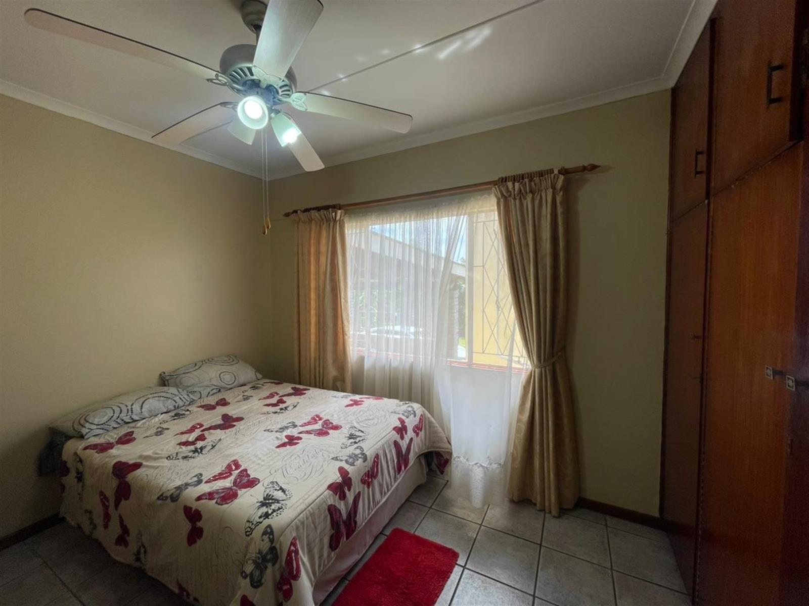 The main home features three well-sized bedrooms, all fitted with built-in cupboards and ceiling fans. The main bedroom has an en-suite bathroom with shower, toilet and basin, while a family bathroom with bath, toilet and basin services the remaining two bedrooms and guests.