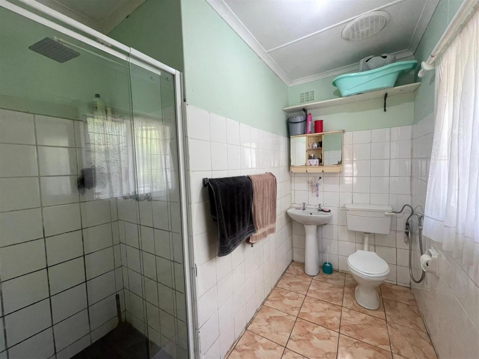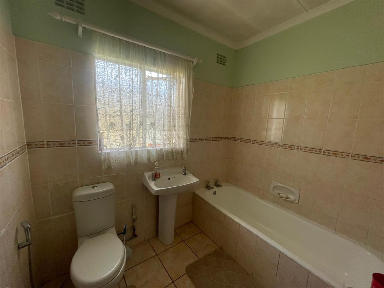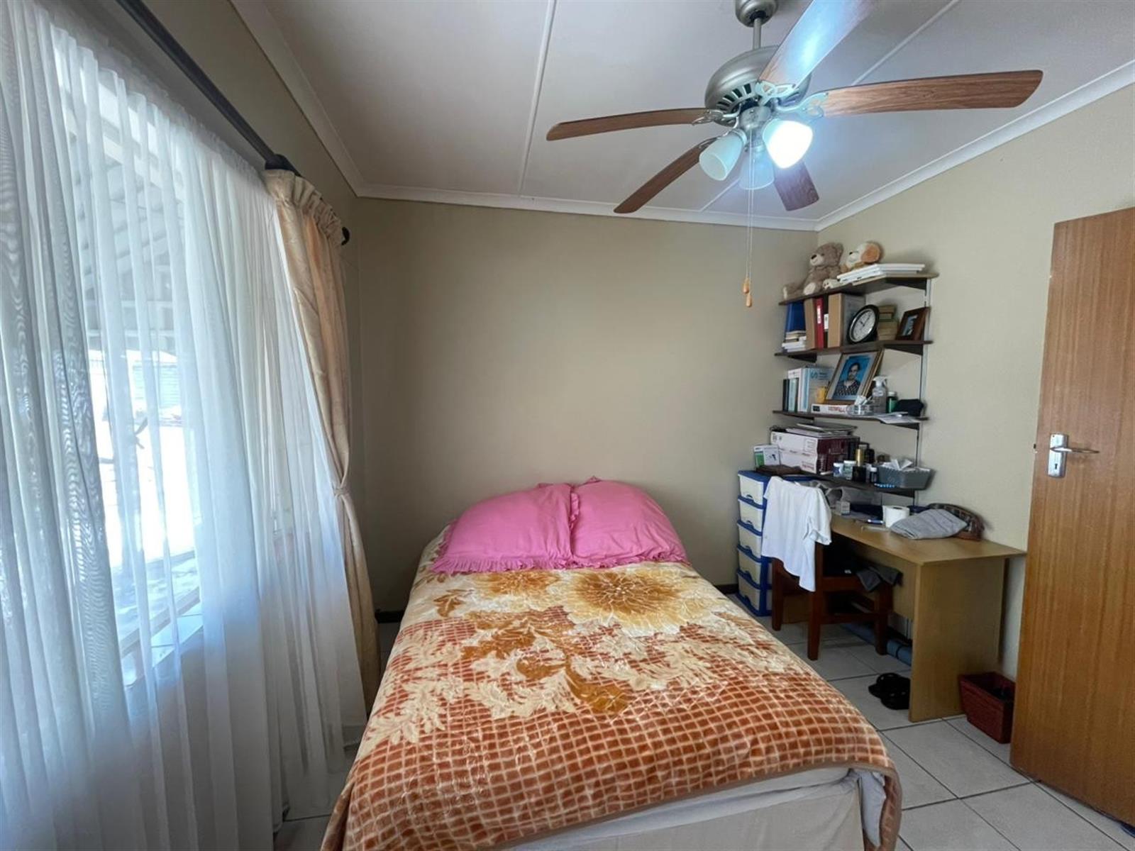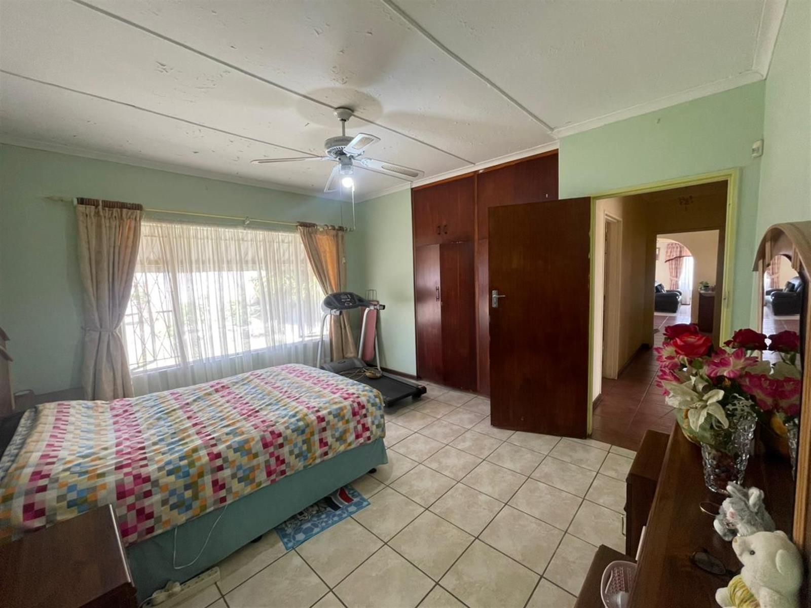 The main home features three well-sized bedrooms, all fitted with built-in cupboards and ceiling fans. The main bedroom has an en-suite bathroom with shower, toilet and basin, while a family bathroom with bath, toilet and basin services the remaining two bedrooms and guests.