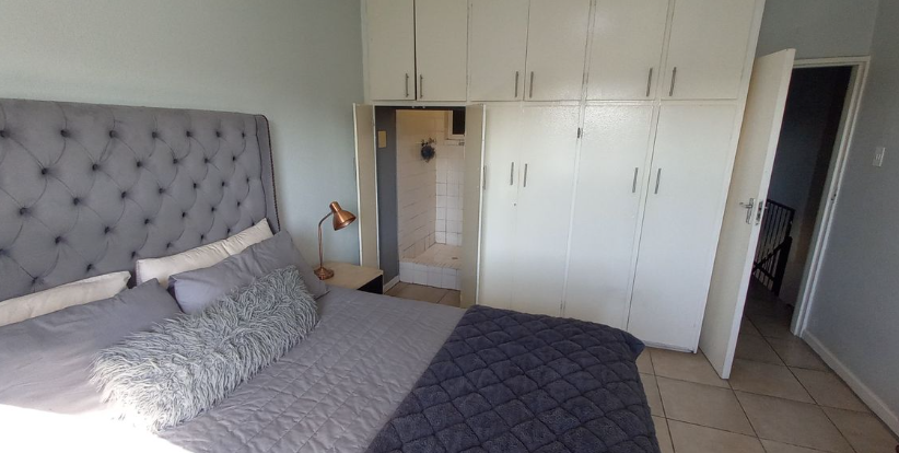 The ground floor offers a spacious lounge and dining area, opening out to a private patio with a built-in braai and enclosed yard – perfect for entertaining. The separate kitchen provides ample cupboard space and accommodates a double-door fridge.