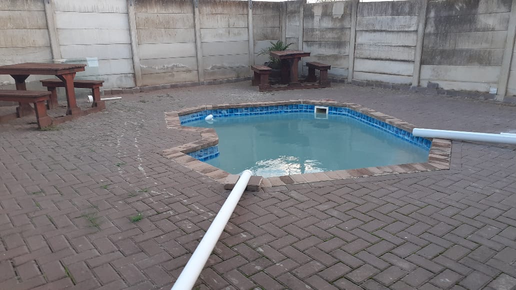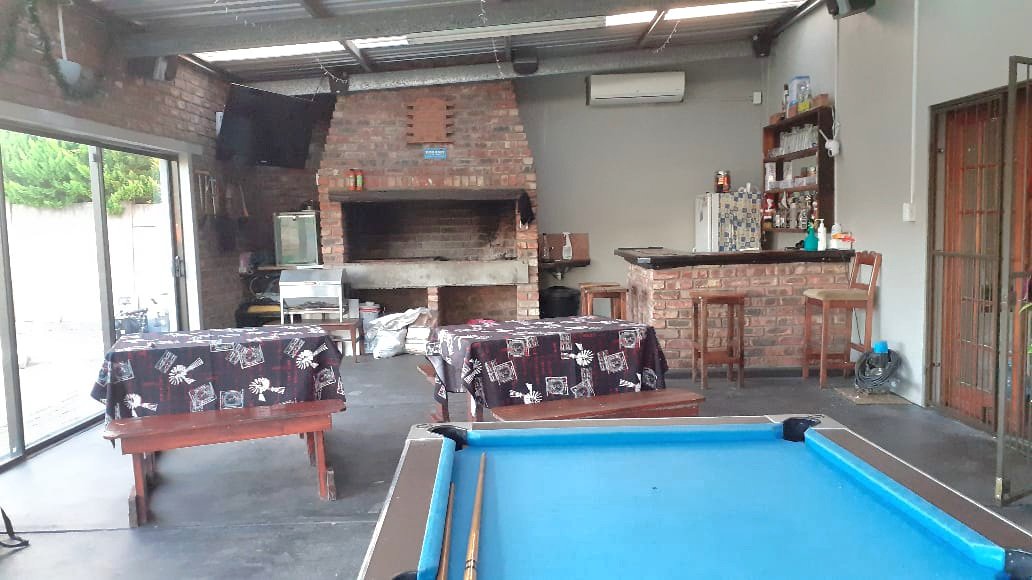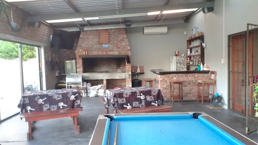 Fantastic indoor entertainment area with bar and built-in braai, leading via sliding doors to a splash pool