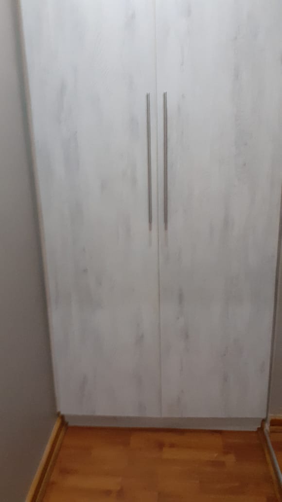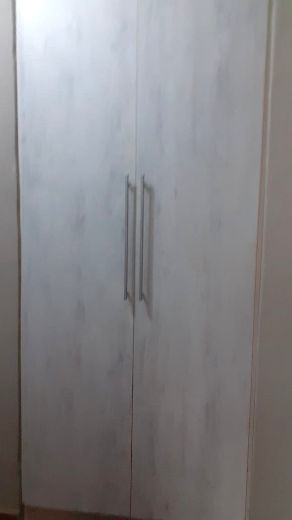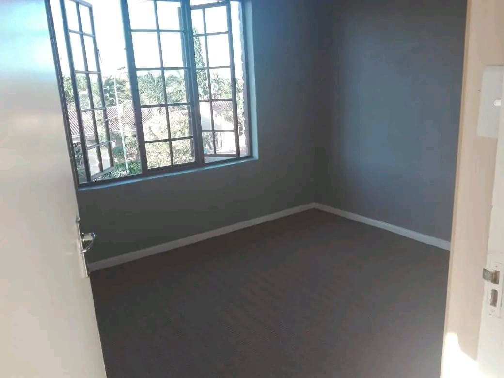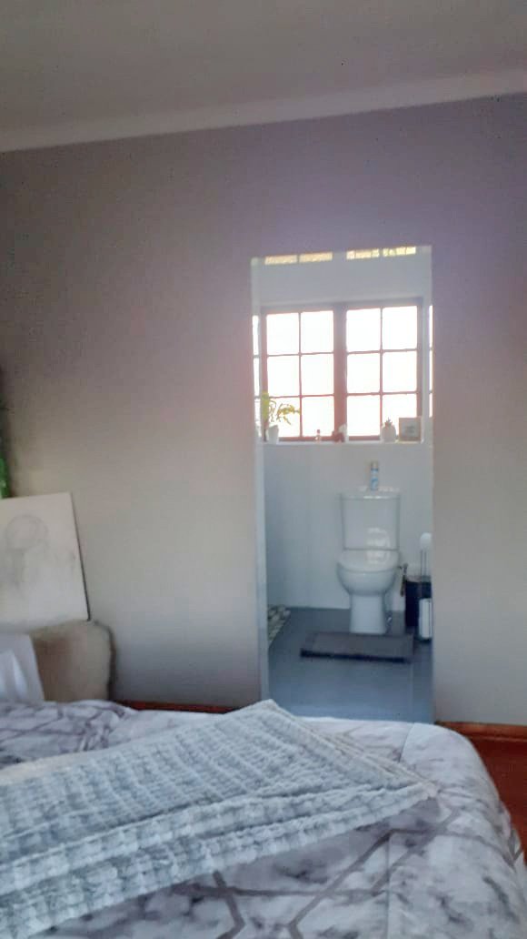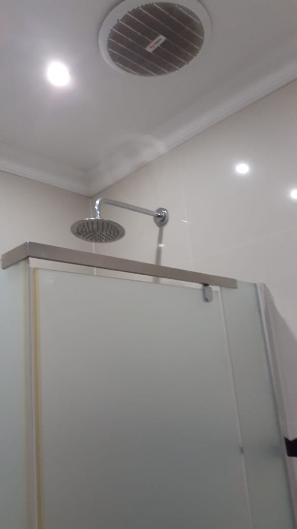 Spacious upstairs bedroom with built-in cupboards, aircon, and open-plan bathroom