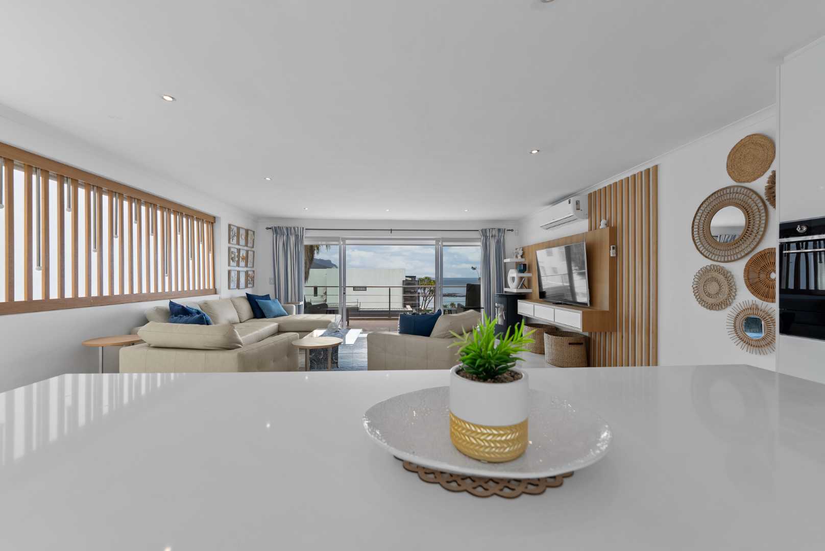 The living room is welcoming and well proportioned with ocean views, featuring a wood-burning fireplace and block-out blinds creating a cosy yet sophisticated atmosphere.