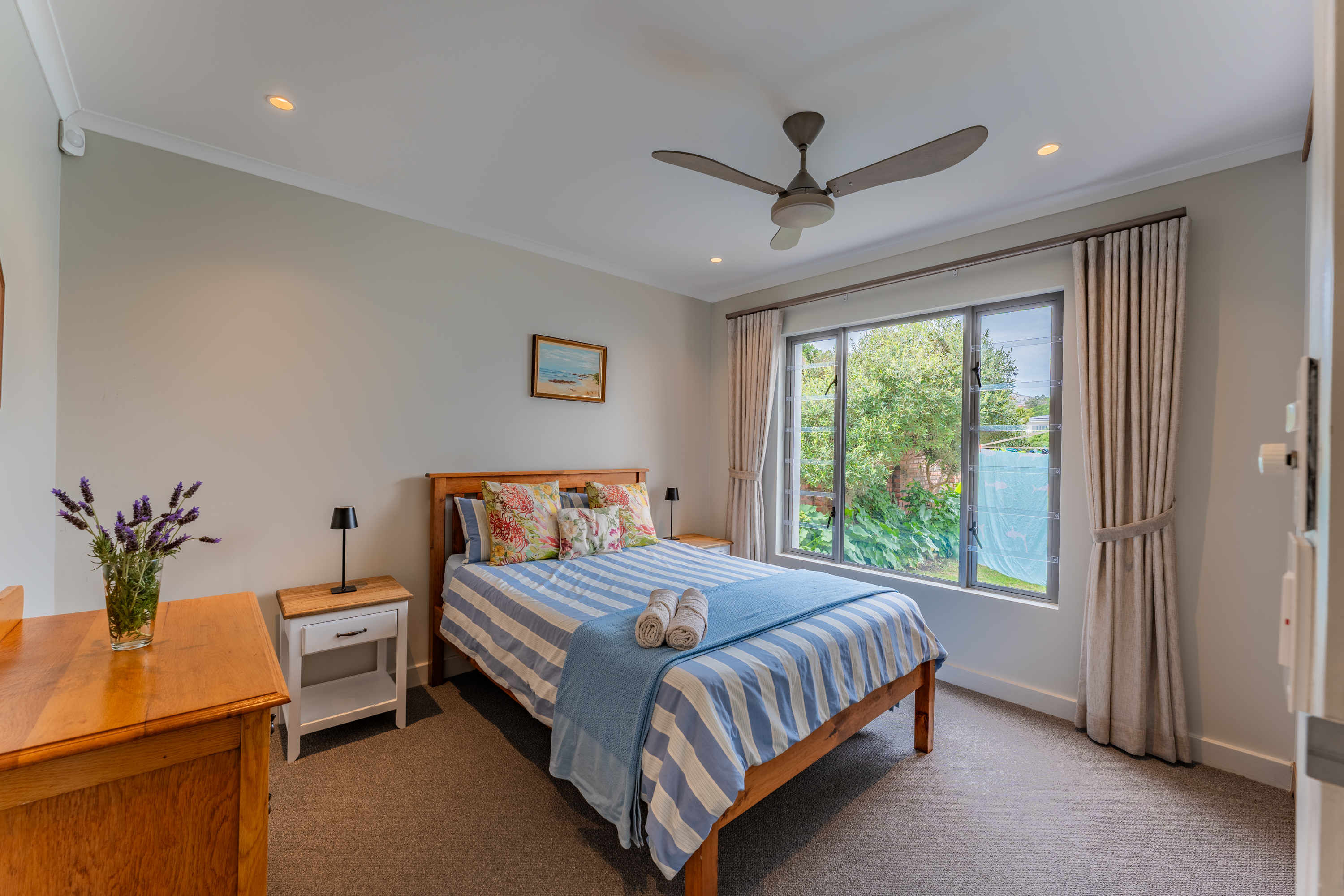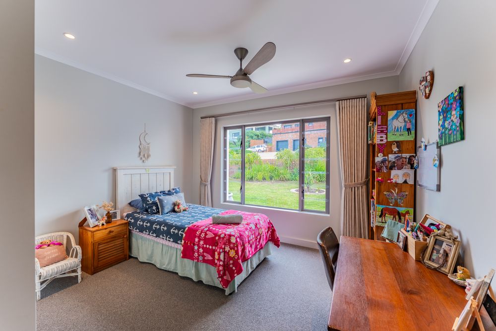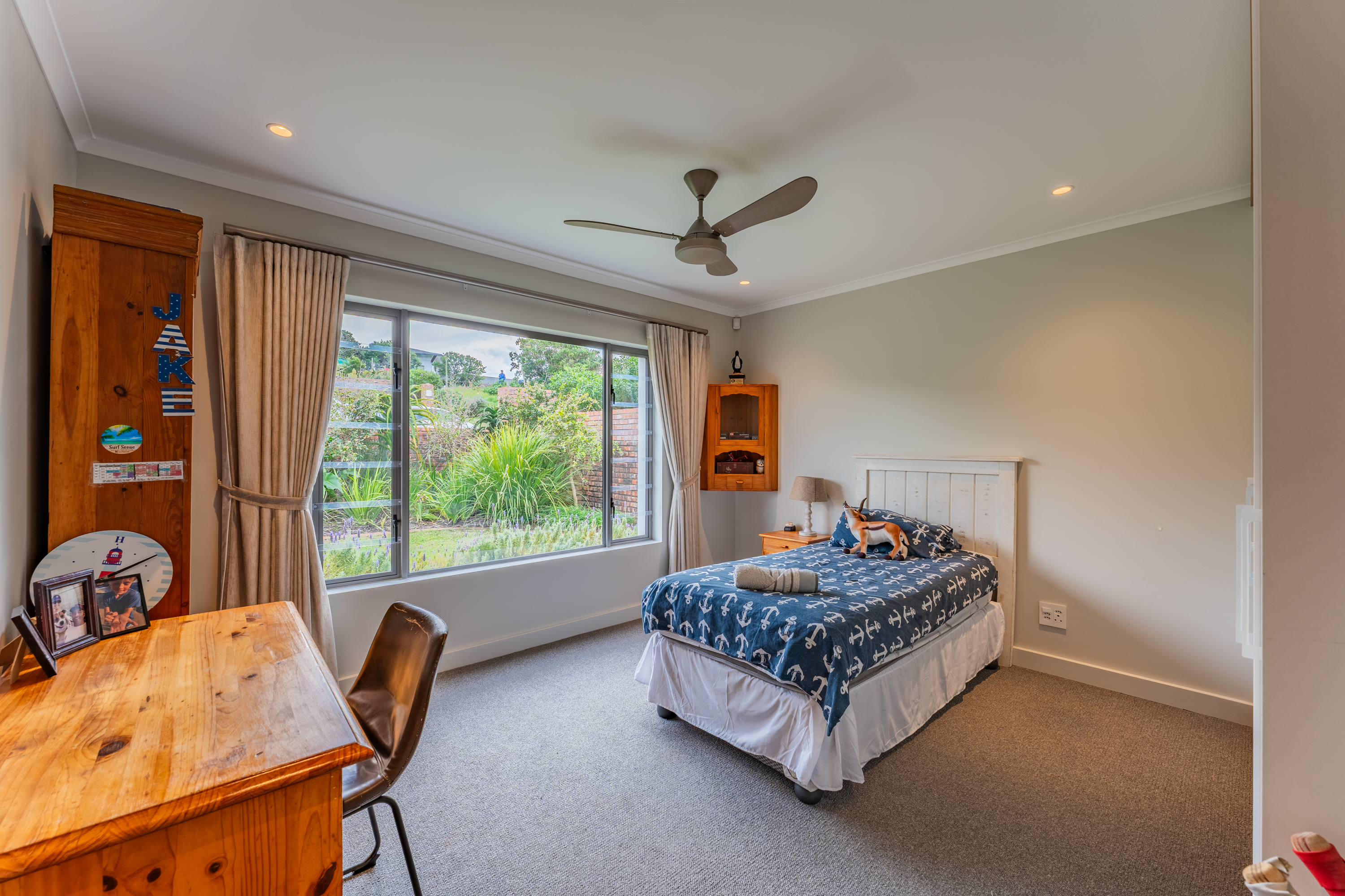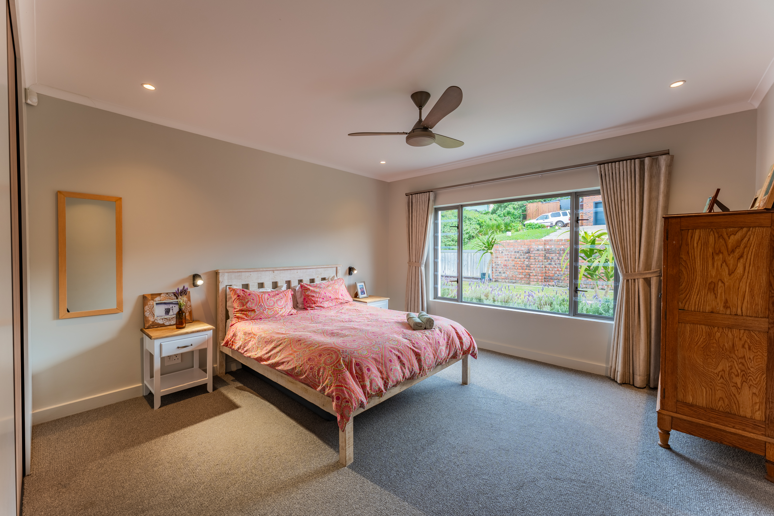All bedrooms are carpeted and include built-in cupboards. Three are north-facing and enjoy abundant sunlight, while the fourth overlooks the garden and pool.