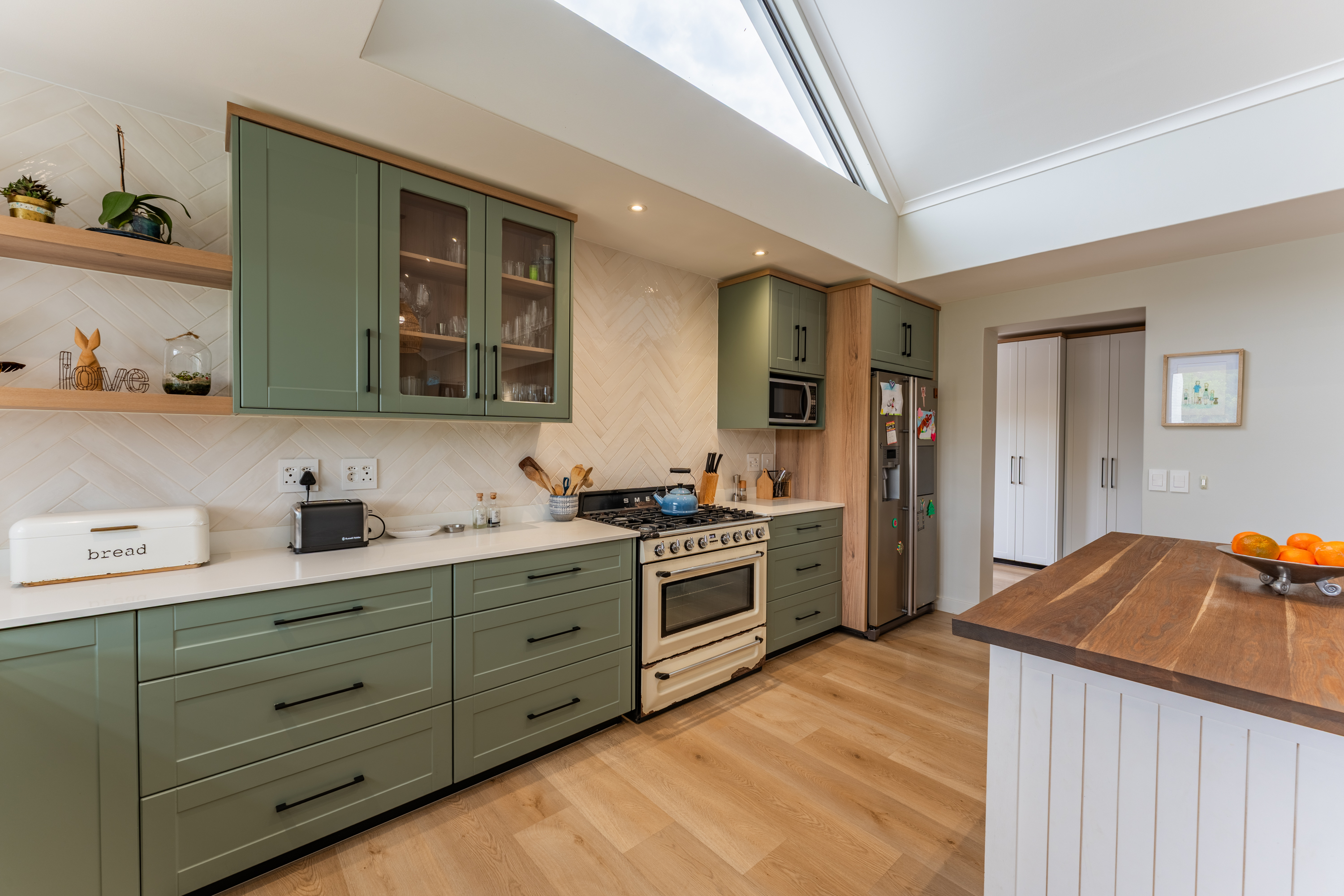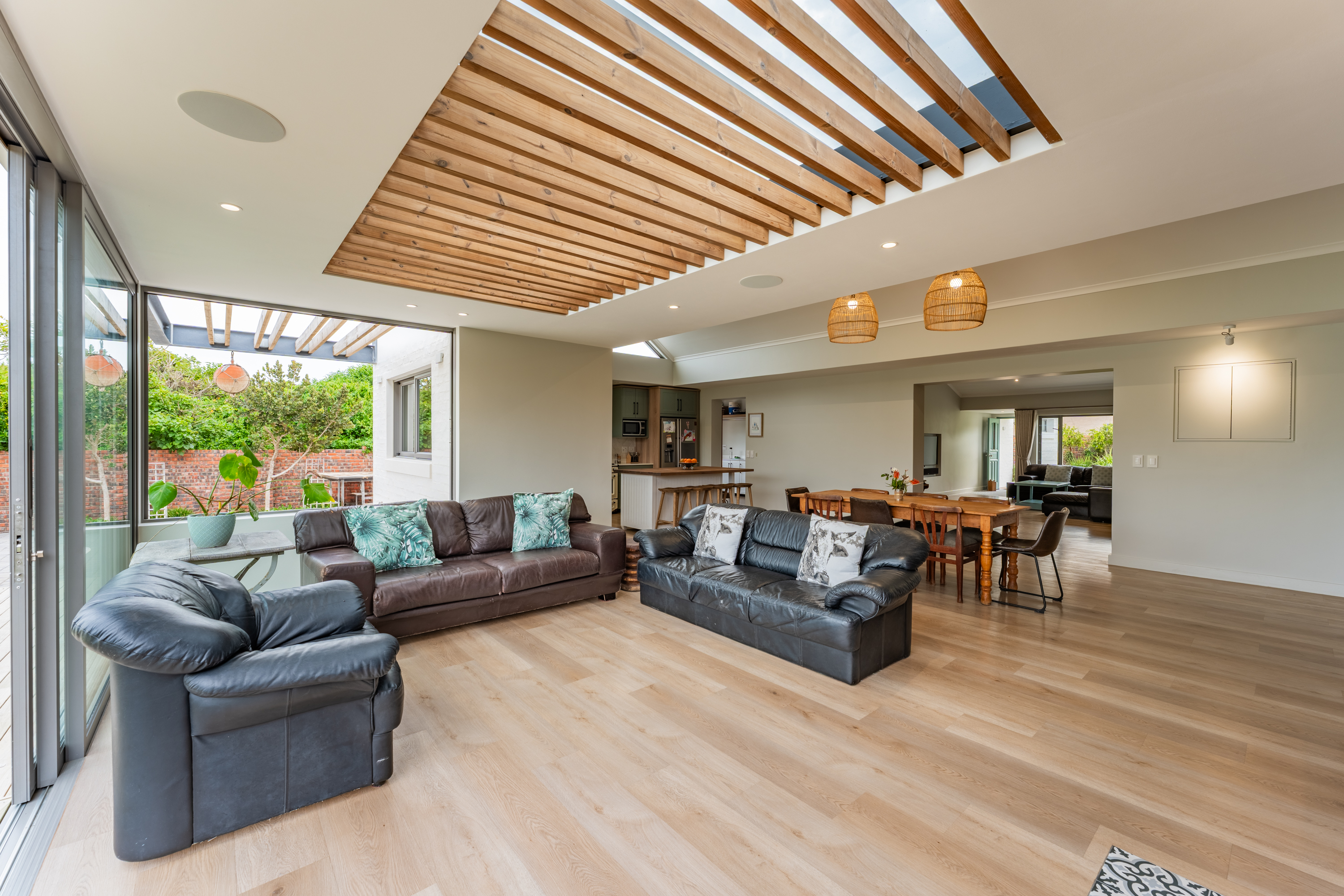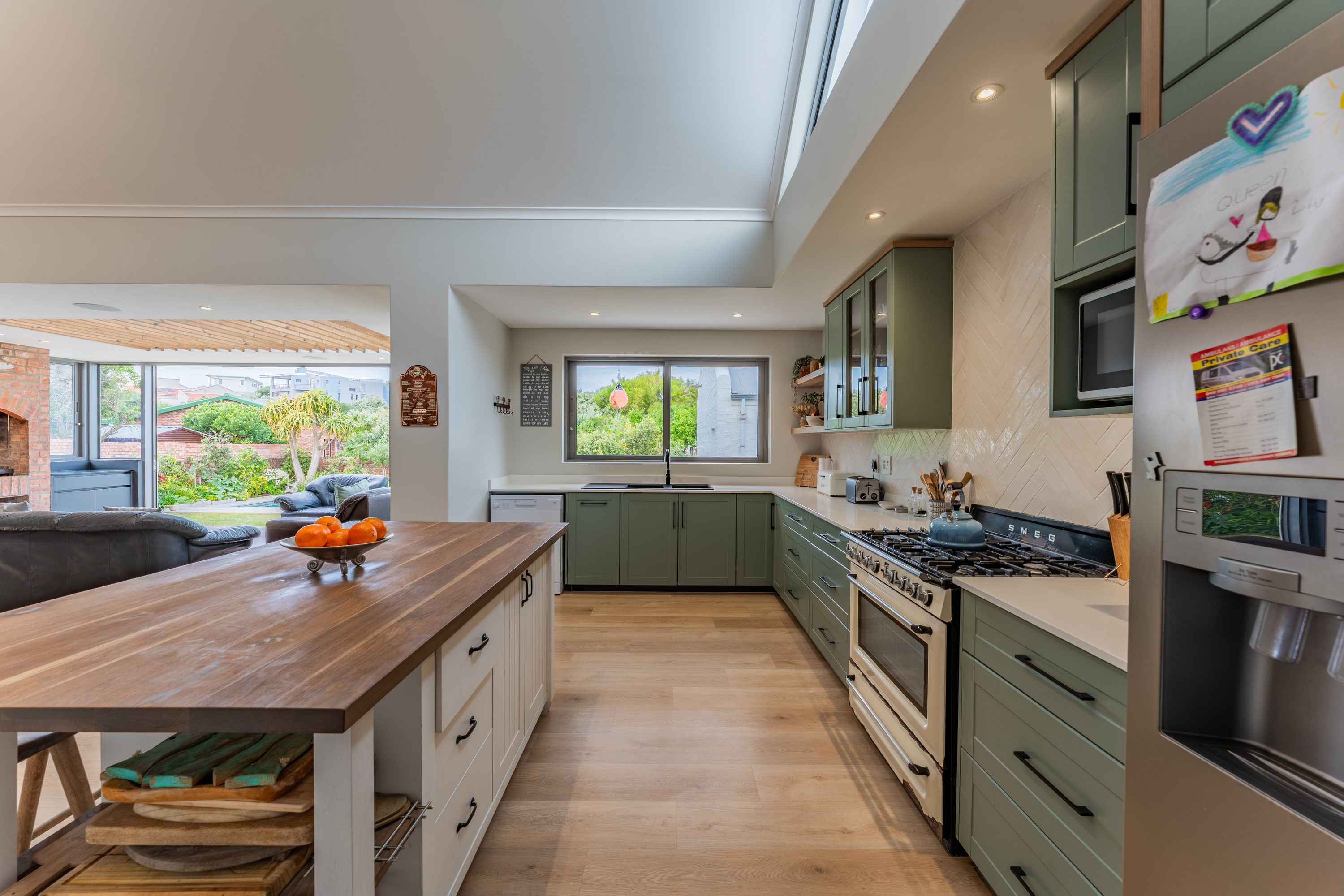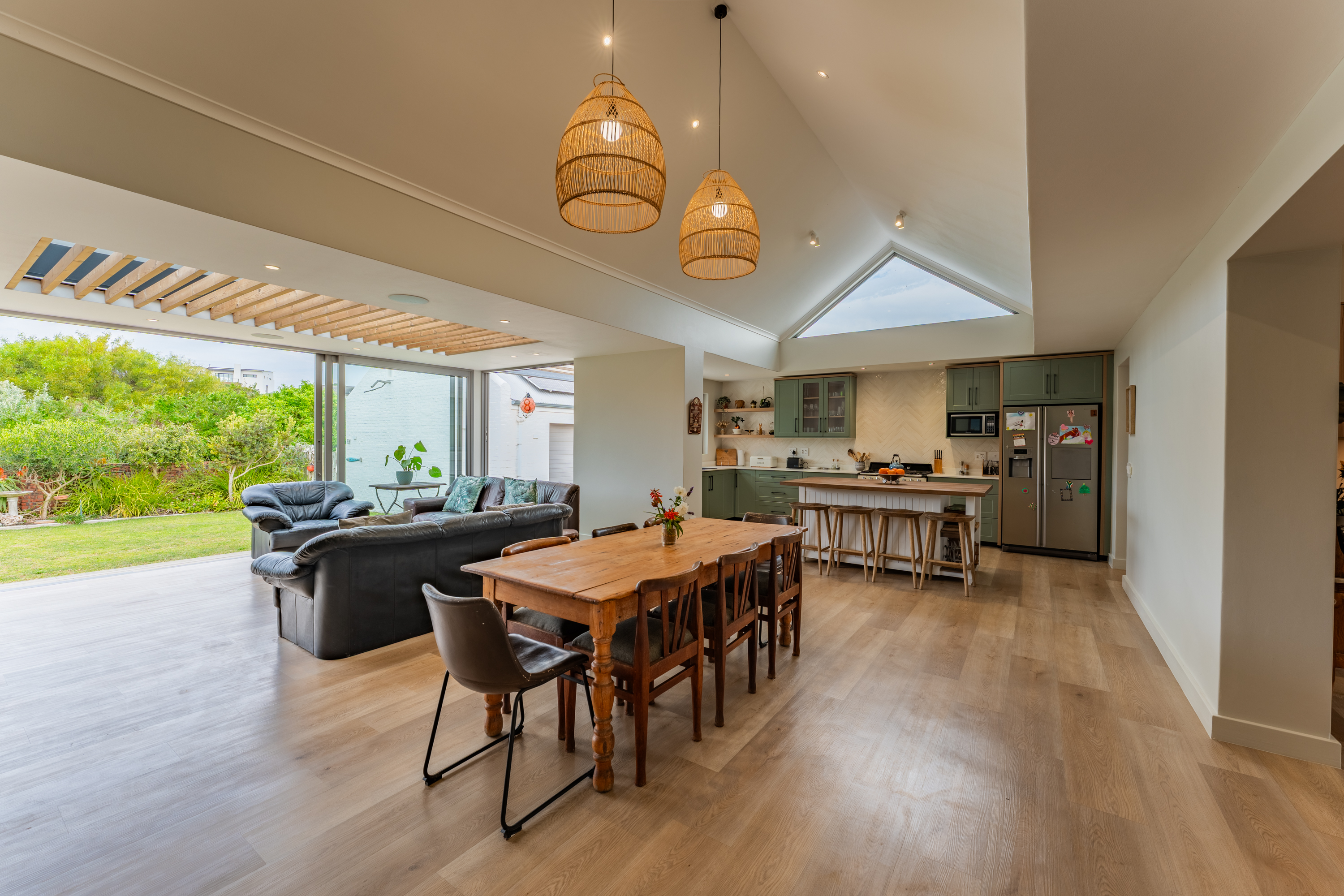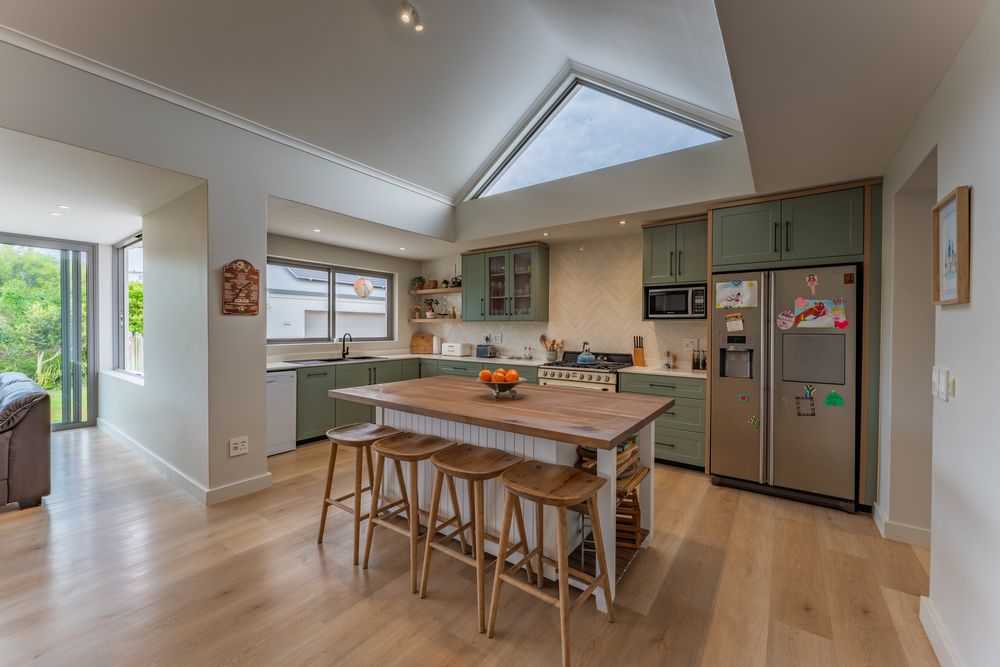 The kitchen is a standout feature, centred around a large timber-topped island with casual seating. Sophisticated cabinetry, premium fittings, and a well-planned layout make it as practical as it is stylish. Just off the kitchen is a clever scullery/laundry/pantry combo with external access—perfect as a multi-purpose mudroom where sandy shoes, beach gear, and groceries can be dropped off with ease.