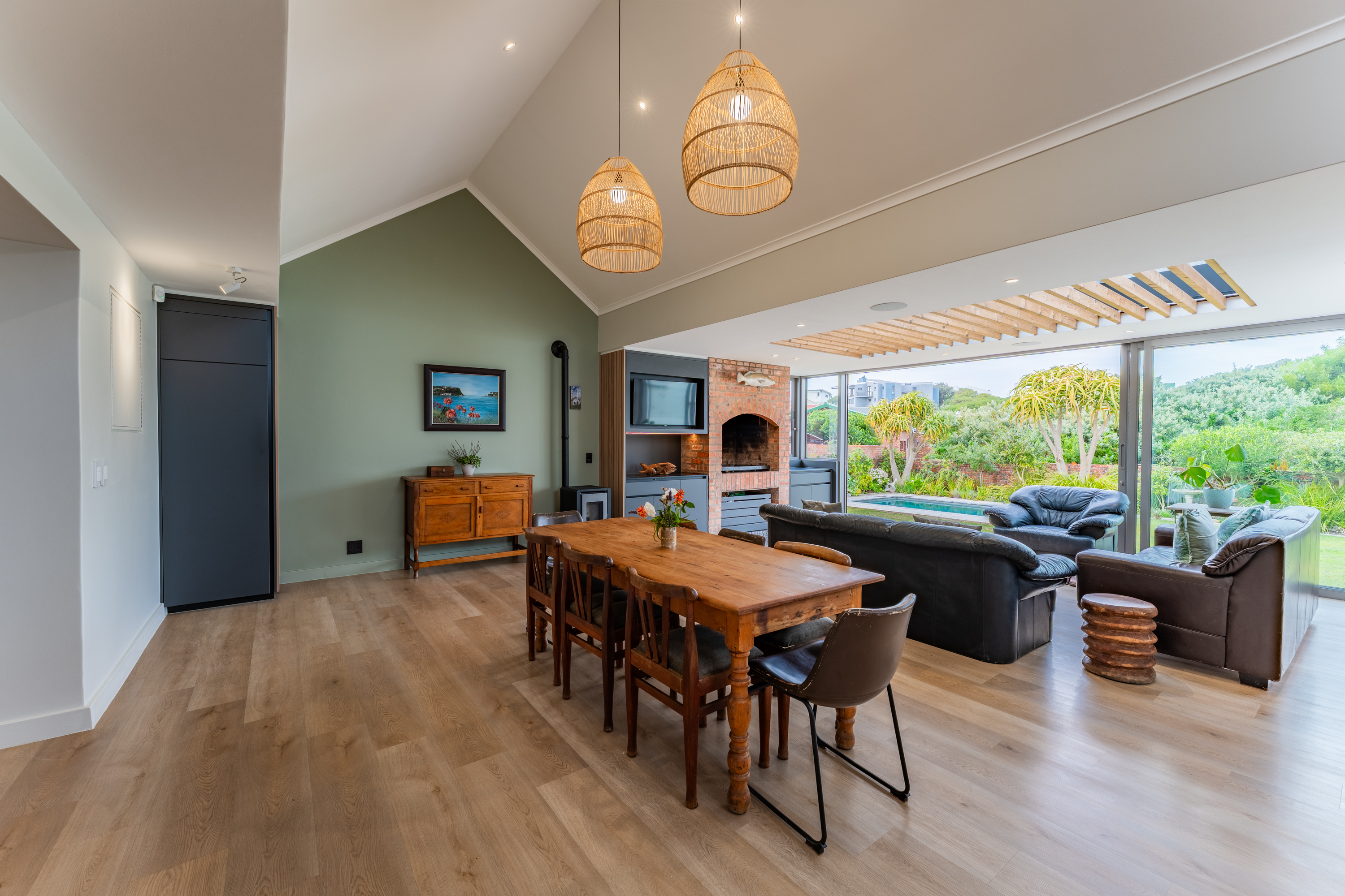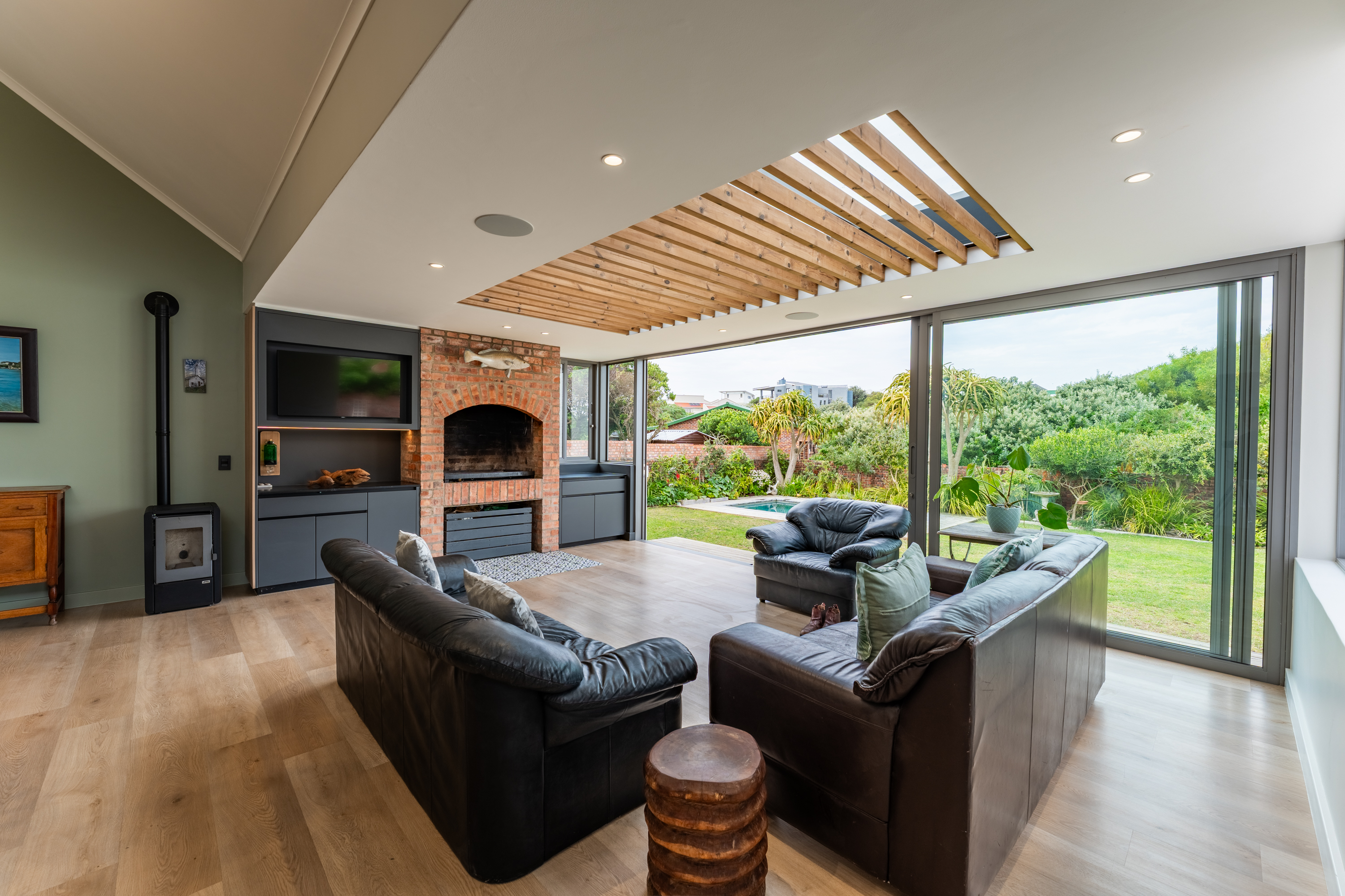 The central living space is where everyone comes together. Whether it's curling up by the pellet-burning fireplace in winter, gathering around the indoor braai on windy days, or sliding open the large doors on summer afternoons to enjoy the sunny garden and sparkling pool, this space caters to every season. It’s perfect for family living—whether cooking, relaxing, reading, playing darts, grilling, or kicking a ball in the garden.