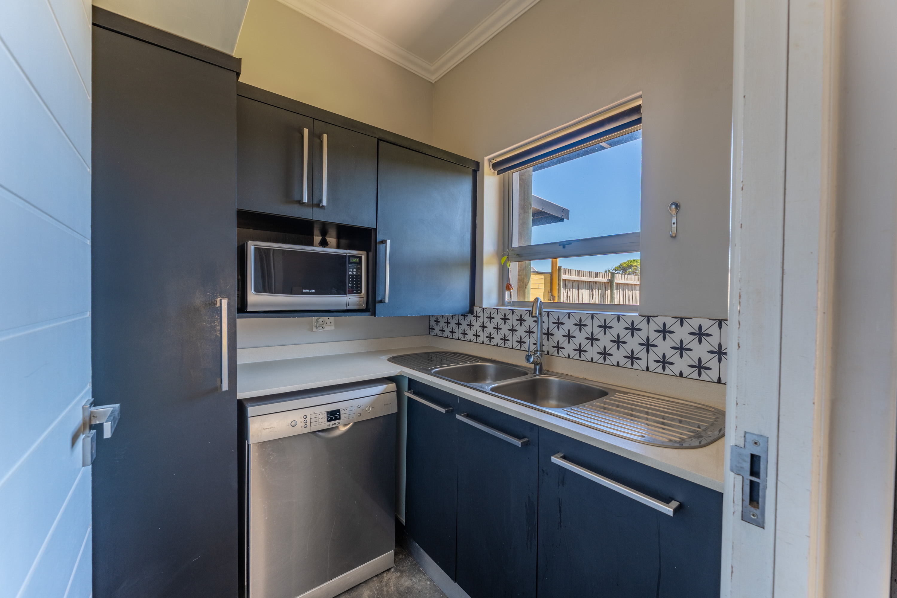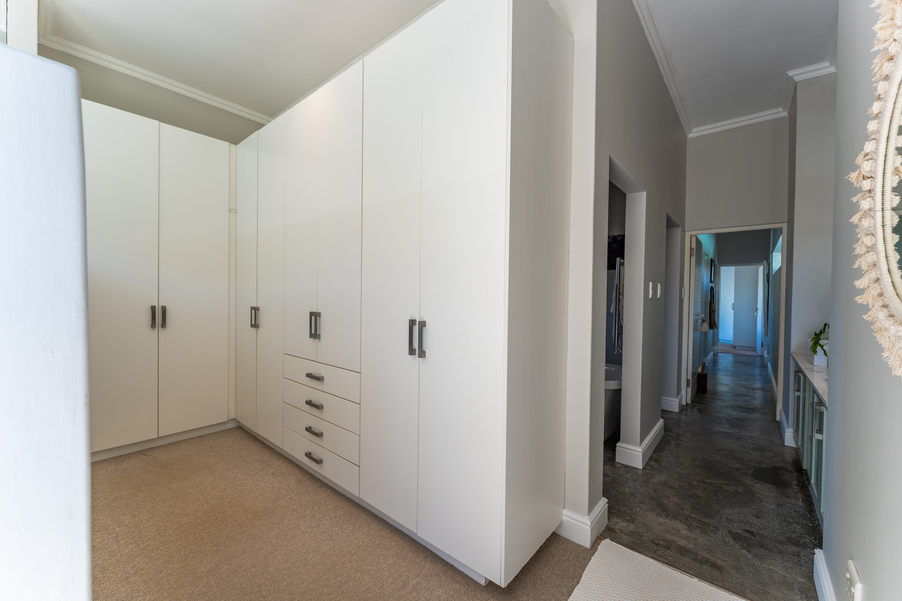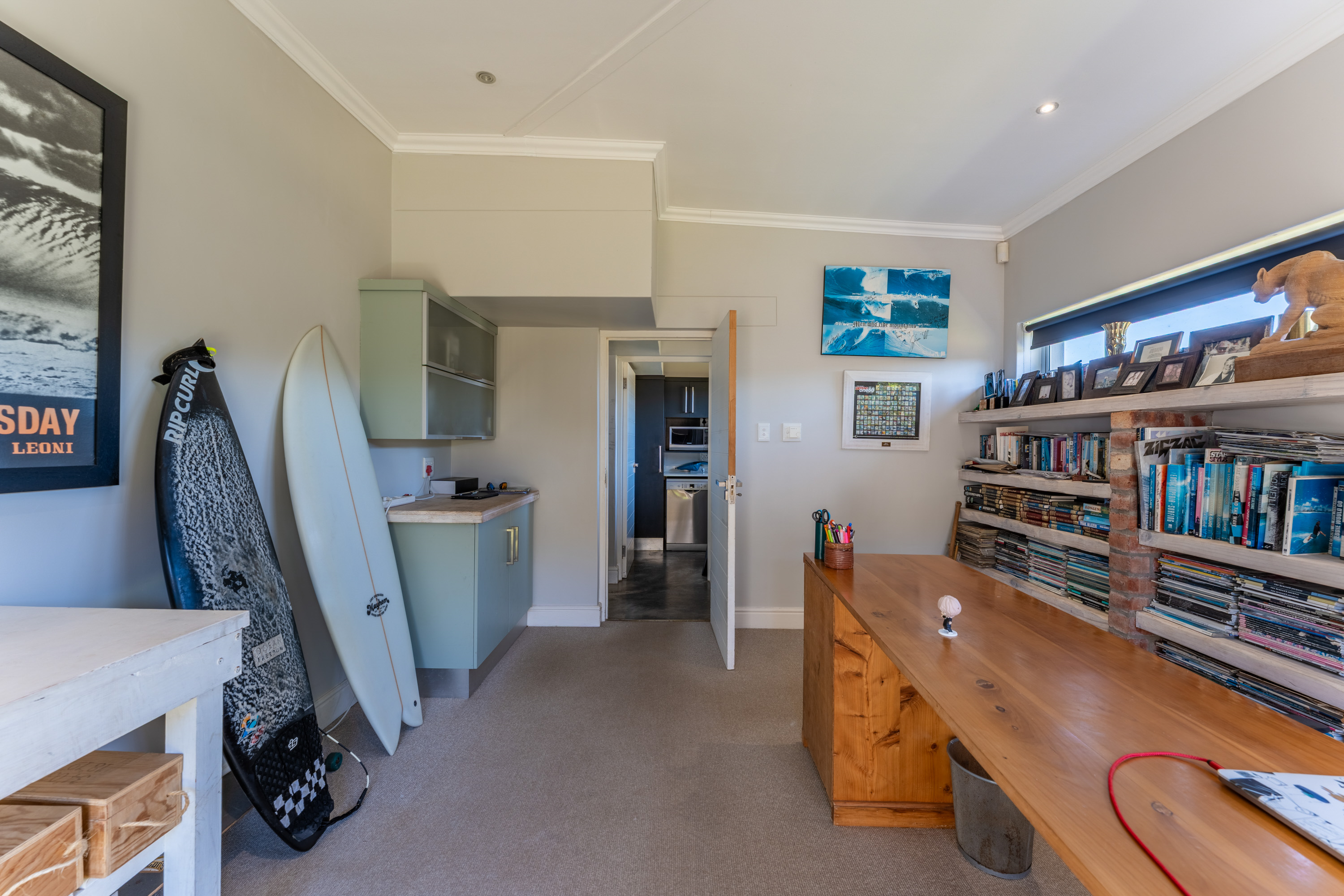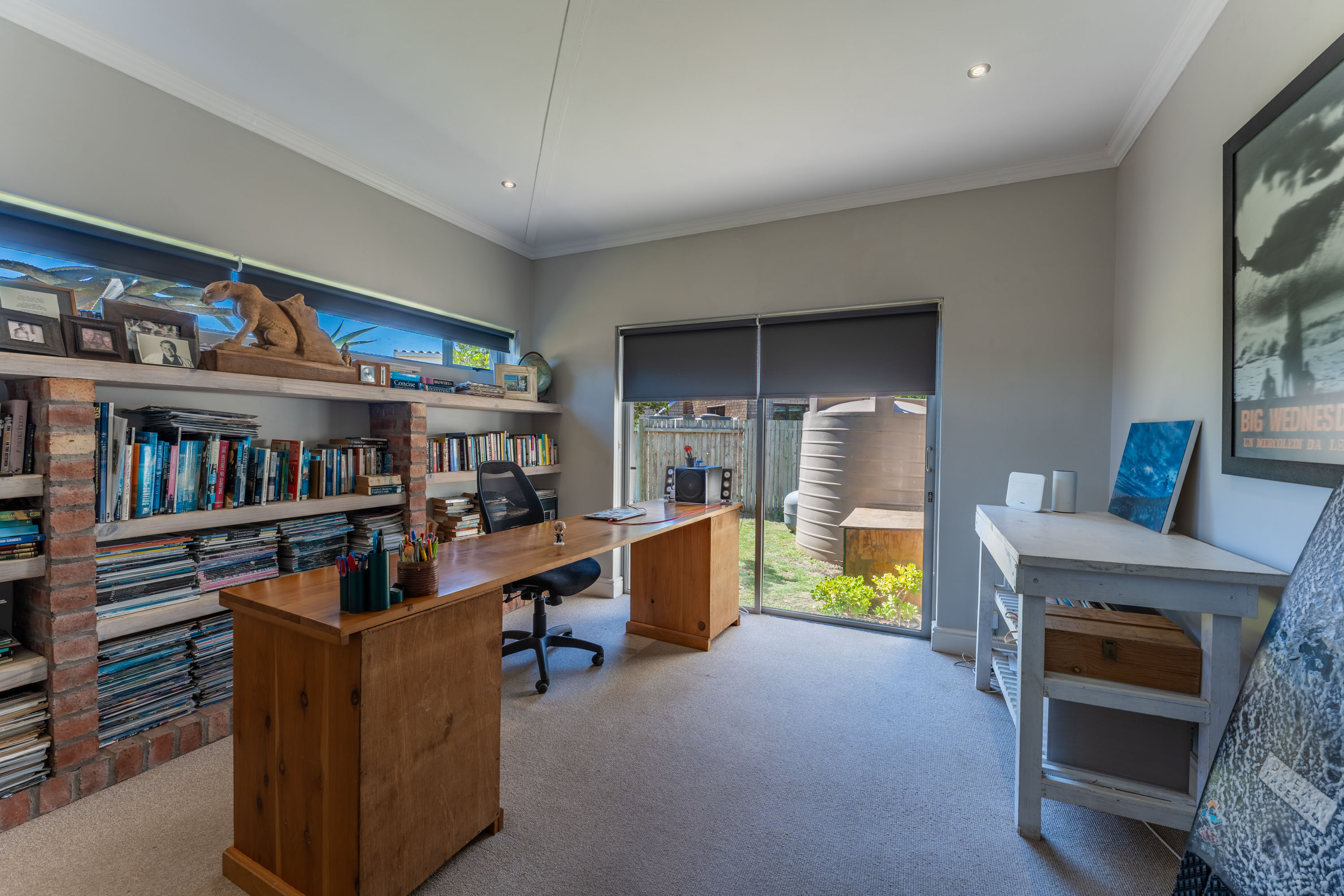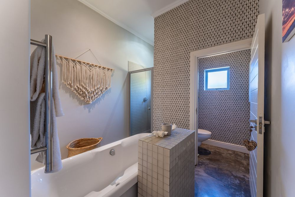 The bedroom wing comprises three beautifully appointed bedrooms and two bathrooms, including a spacious main en-suite. Each bedroom features built-in cupboards and has been tastefully styled to complement the home’s refined beach aesthetic. Abundant natural light enhances every space, with two bedrooms opening onto the tranquil garden and the third enjoying direct access to the deck and pool area.