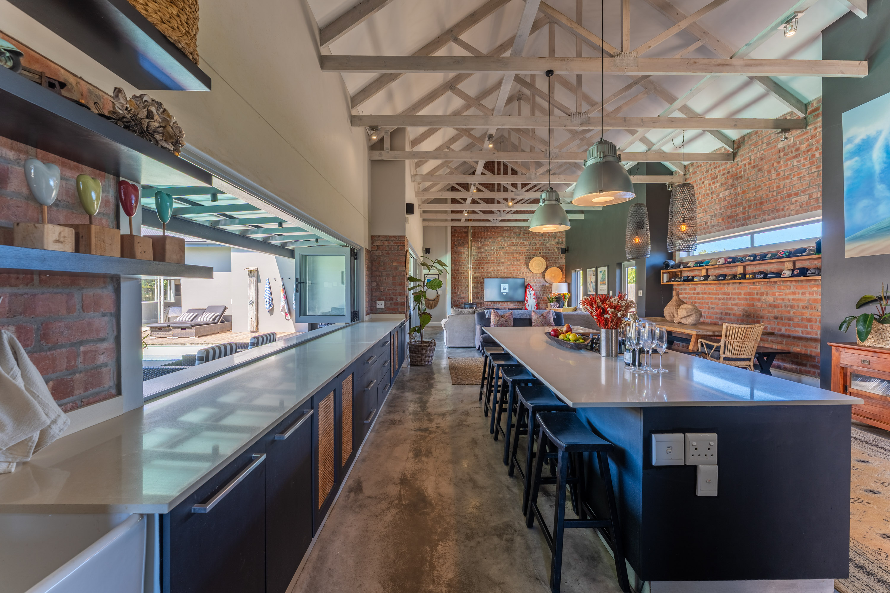 The interior reveals a light-filled open-plan living space where kitchen, dining, and lounge areas flow seamlessly together. Double-volume ceilings create an immediate sense of scale, while exposed brick feature walls introduce a contemporary coastal elegance. Screed floors add both practicality and understated sophistication — perfectly suited to barefoot living after a day at the beach or beside the pool. Expansive stack windows and sliding doors open the home onto the deck, allowing natural northern light to flood the interiors and blurring the line between indoor and outdoor living. The result is a home that remains cool in summer, warm in winter, and inviting year-round.