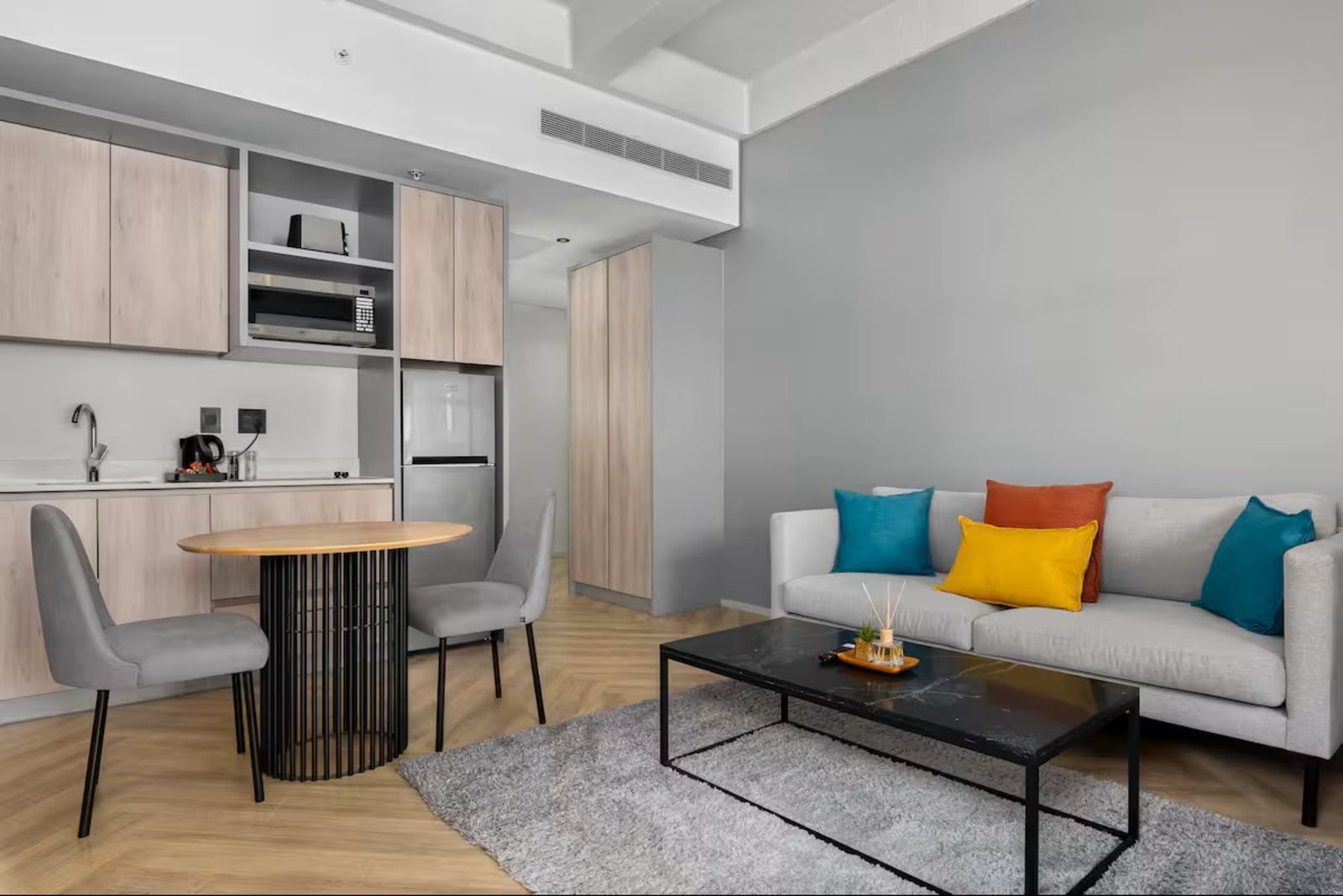 Fully Equipped Kitchenette: Includes sleek cabinetry and high-quality appliances, ideal for urban living.