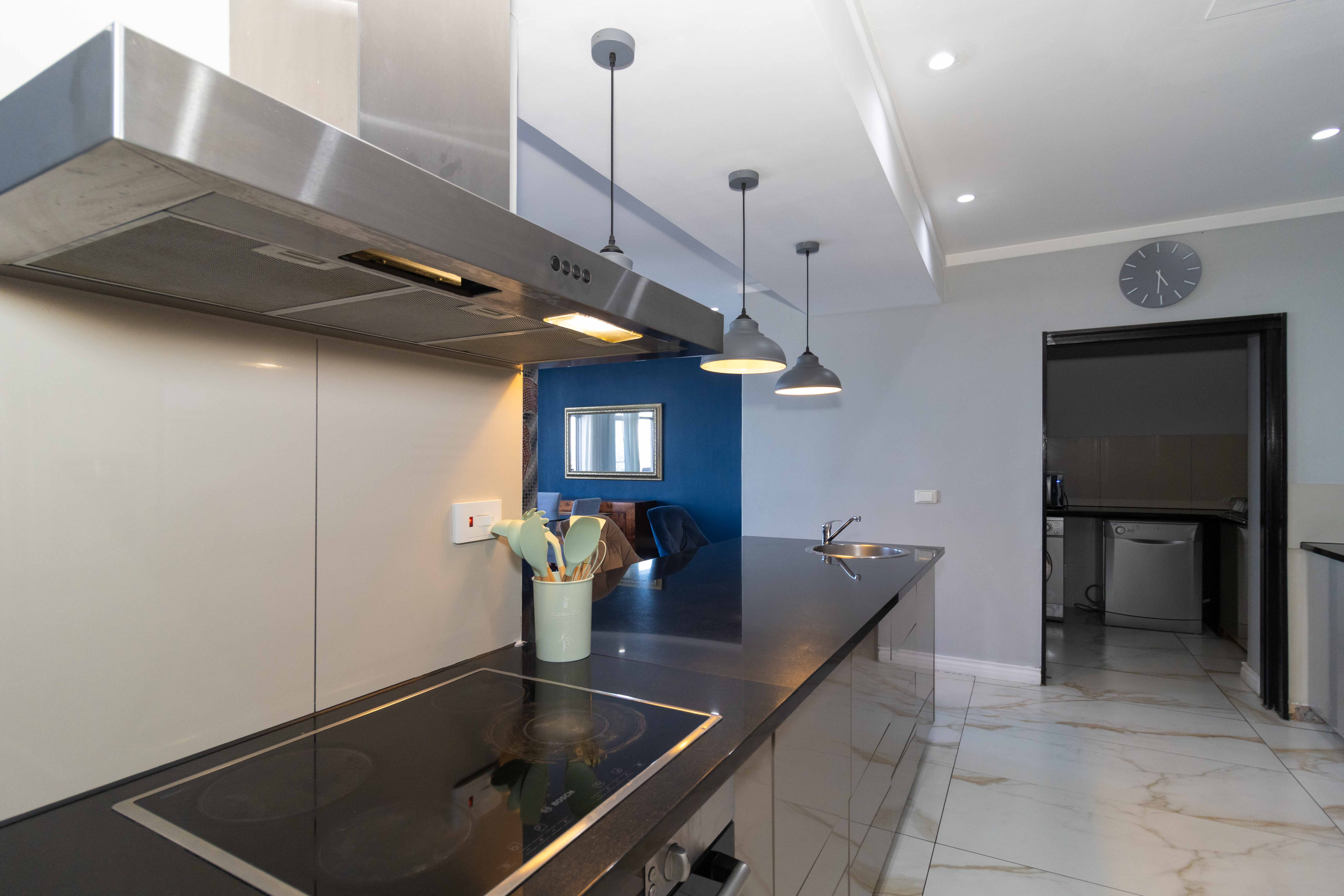Gourmet Kitchen: The sleek, fully integrated kitchen is equipped with high-end appliances, stone countertops, and a central island—perfect for entertaining or everyday luxury.