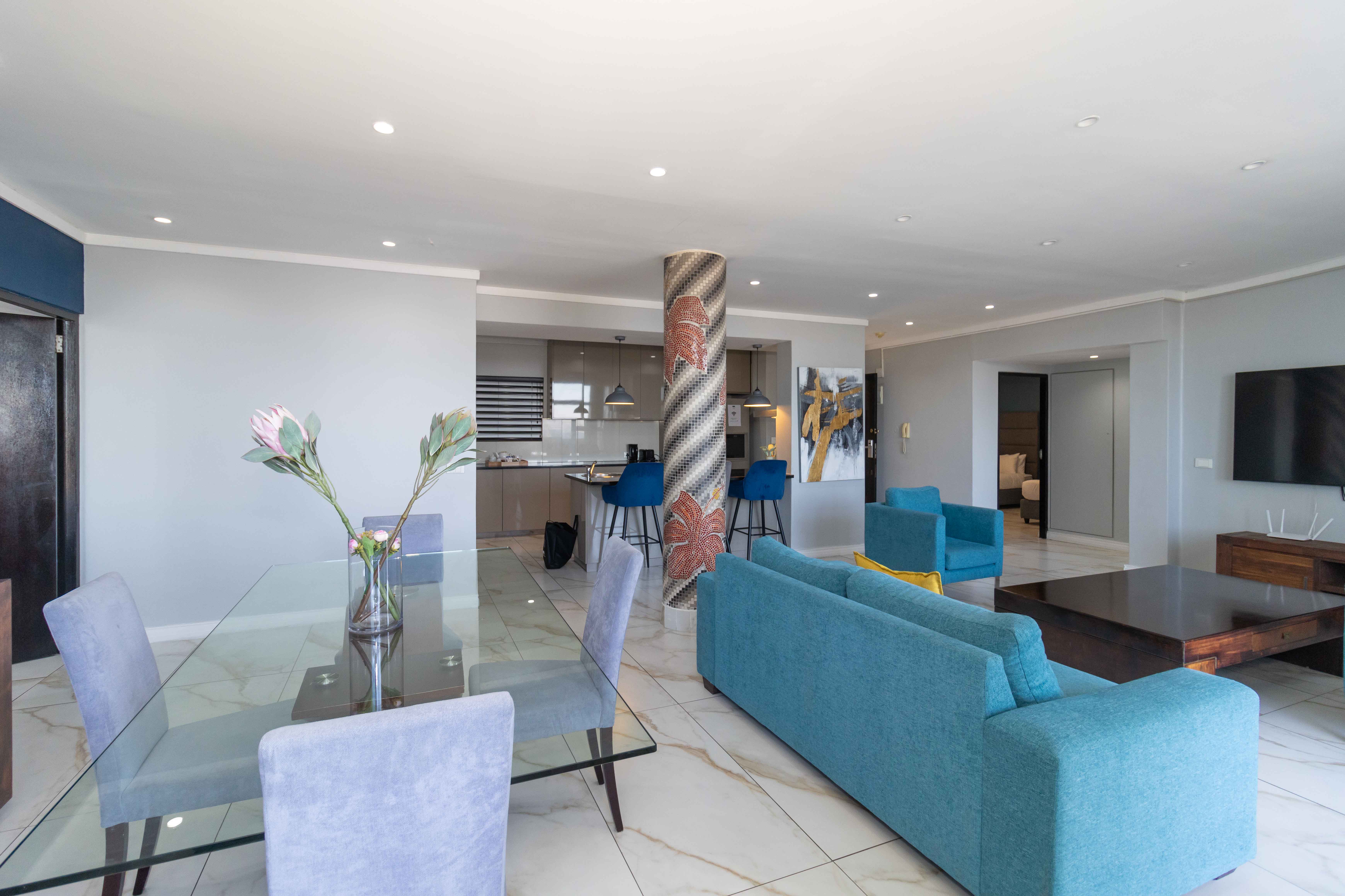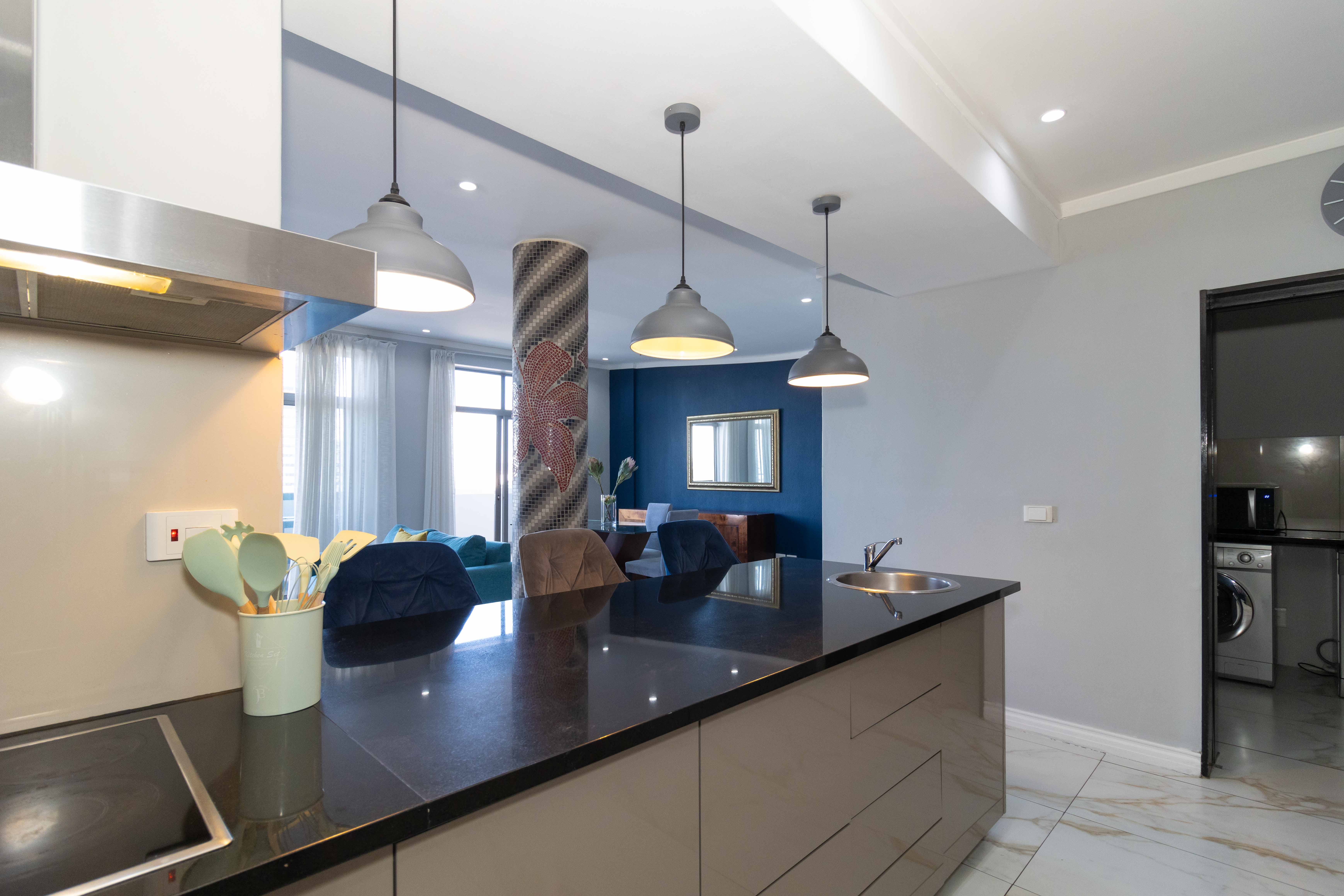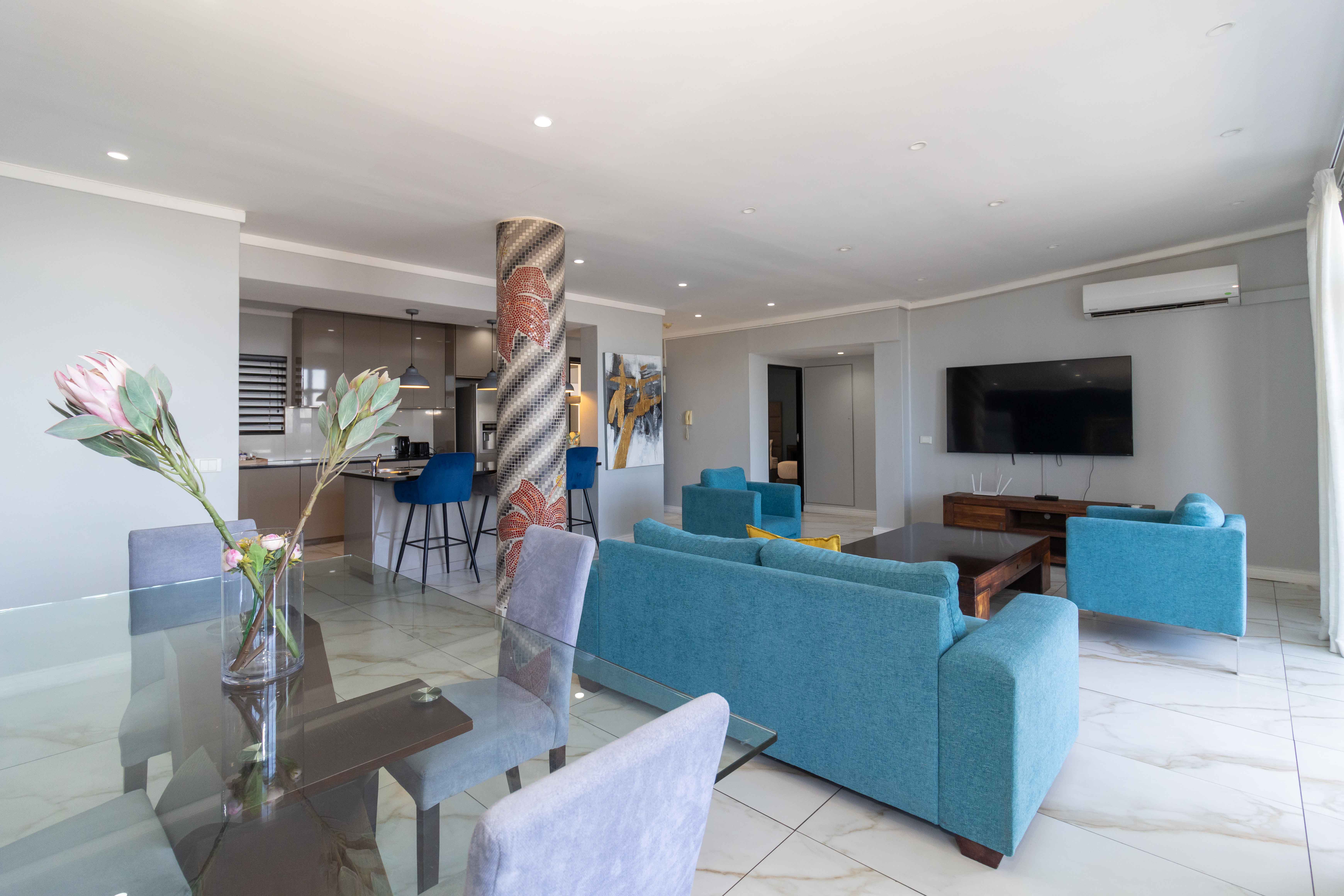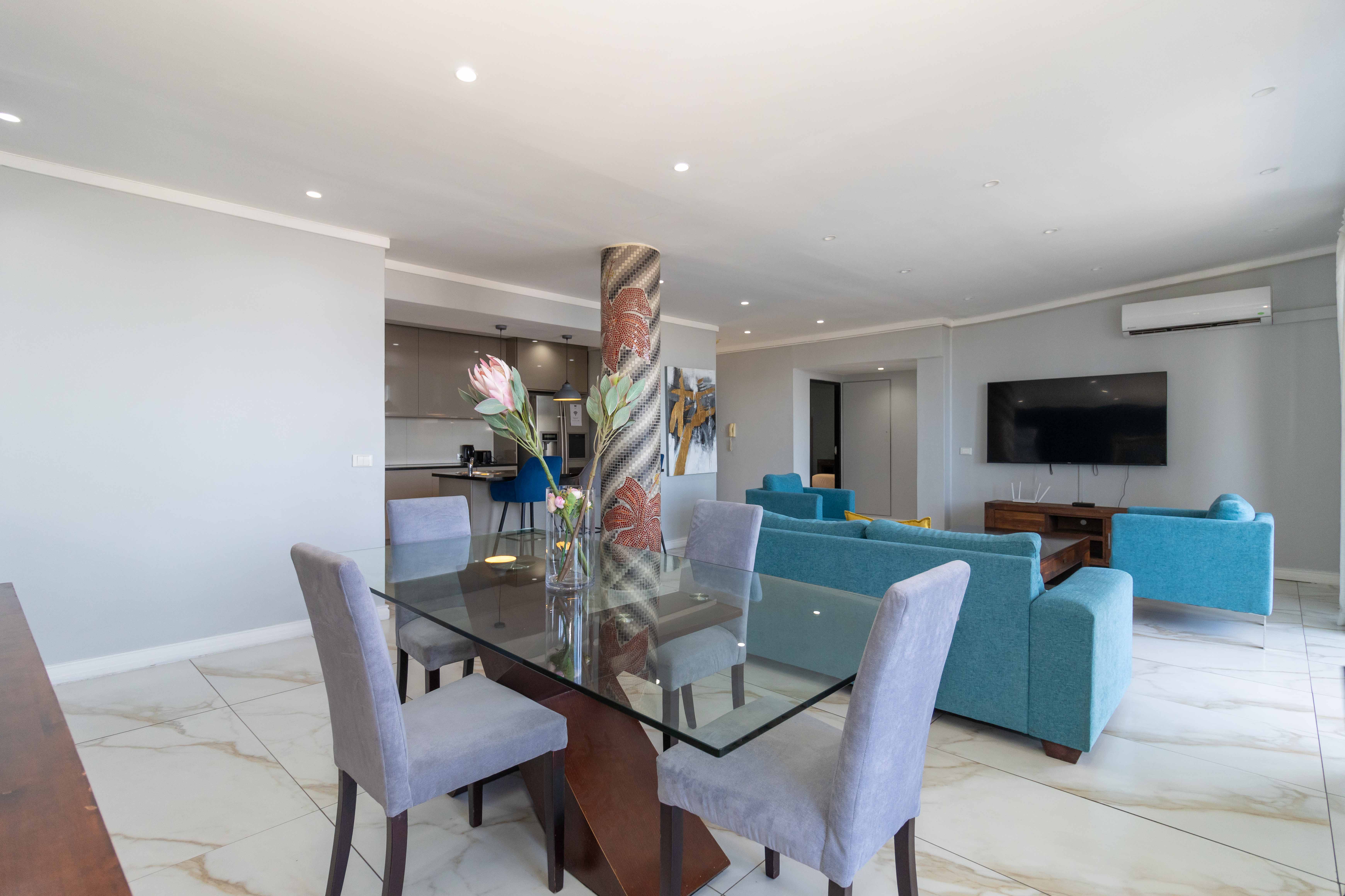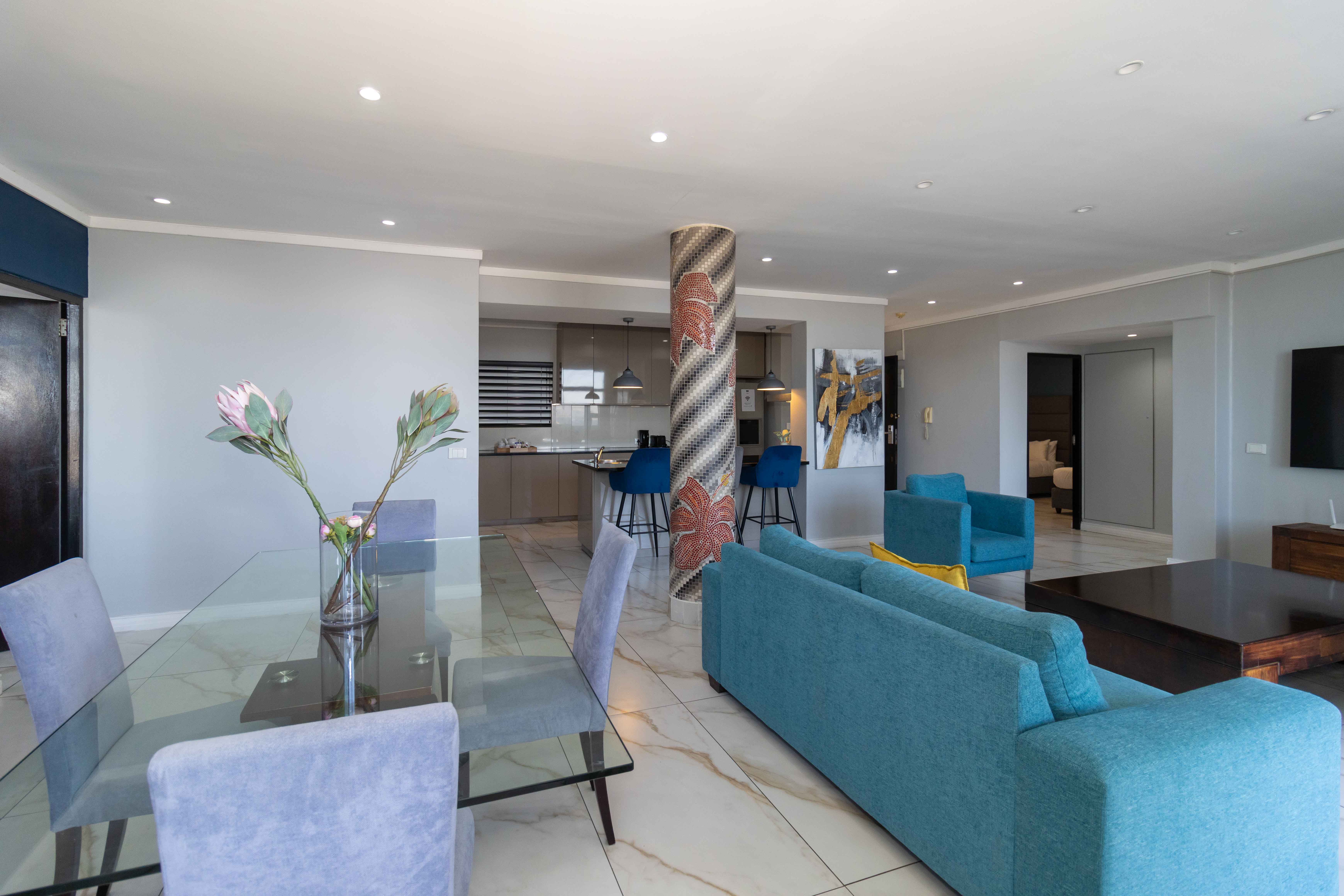 Expansive Living: This 200 sqm residence boasts a grand, open-plan layout with soaring ceilings and floor-to-ceiling windows that flood the space with natural light and frame breathtaking views of Table Mountain and the city skyline.