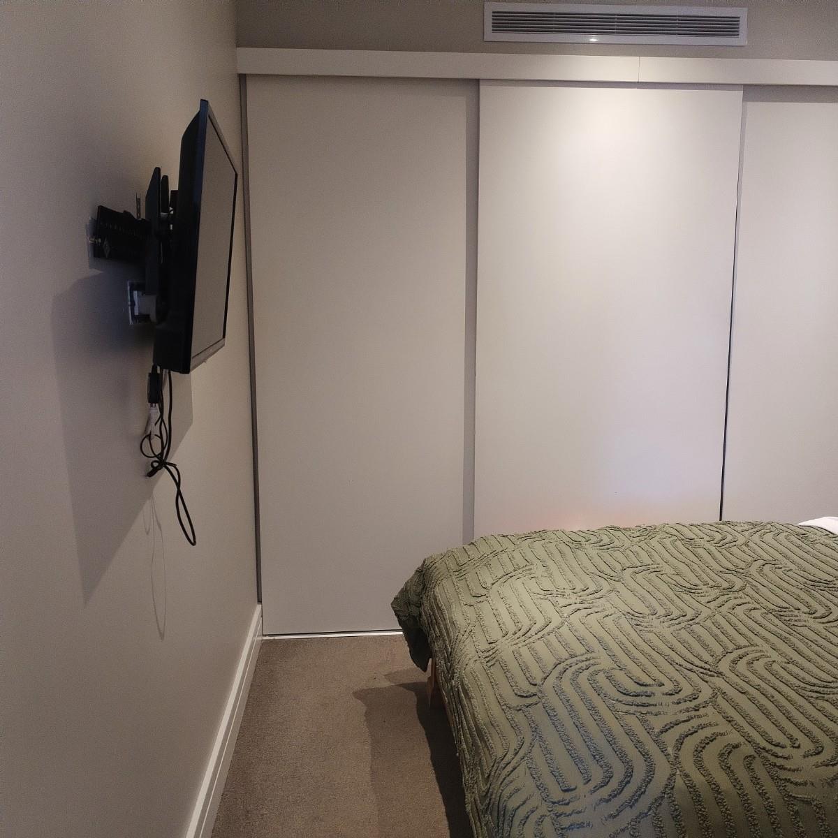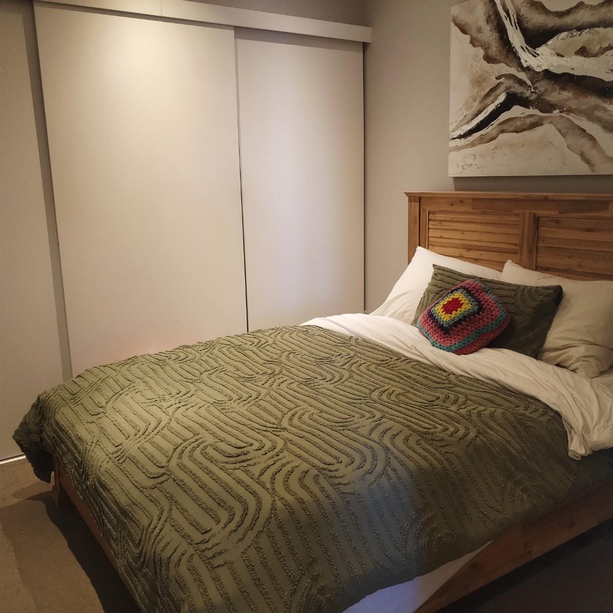 The bedroom is carpeted for comfort and includes generous built-in cupboards, while the bathroom is neatly finished and easily accessible from the living space.