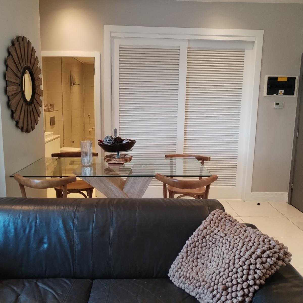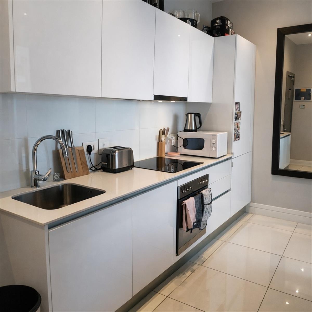 The apartment features a bright, open-plan layout incorporating the lounge, dining area, and a contemporary kitchen fitted with Caesarstone countertops. The kitchen comes fully equipped with a built-in oven and hob, as well as an integrated fridge and dishwasher, ideal for both everyday living and short-term stays.