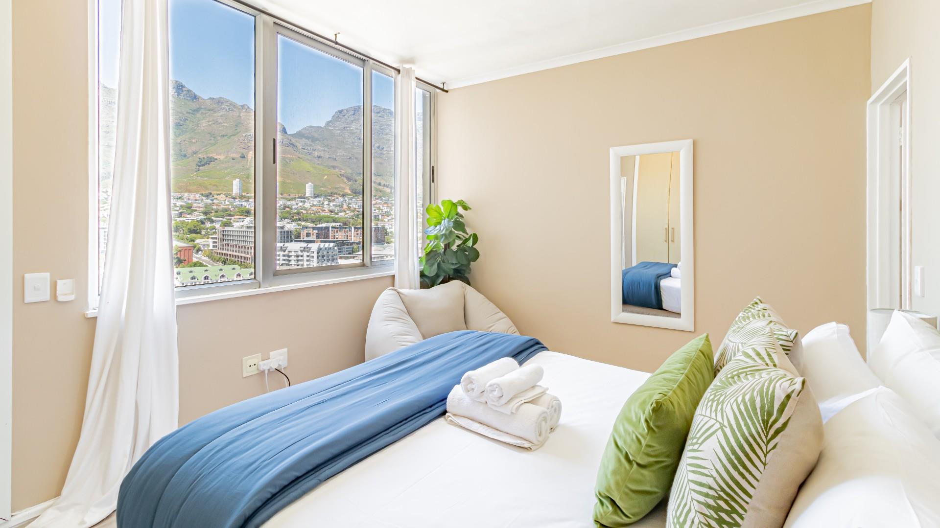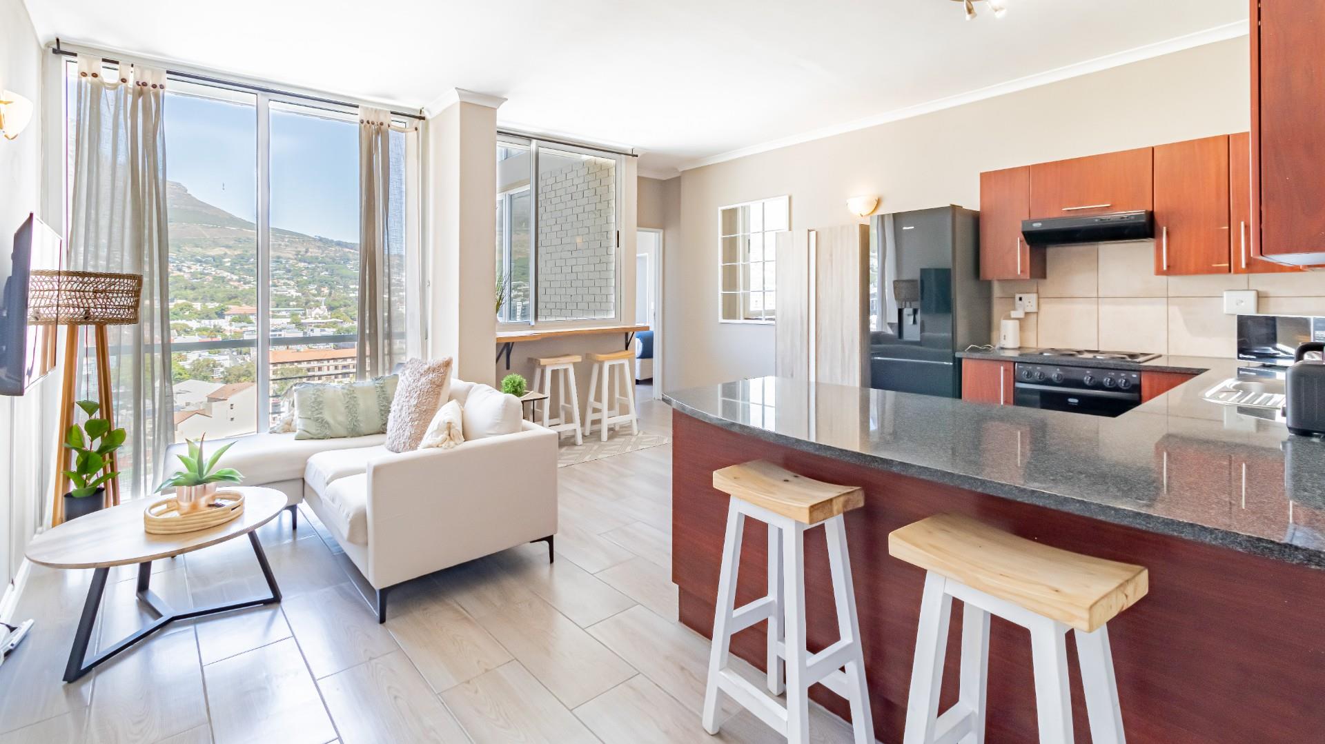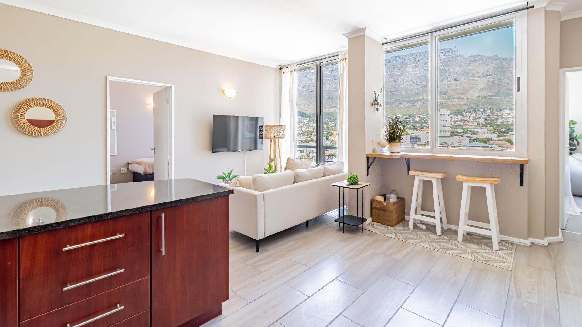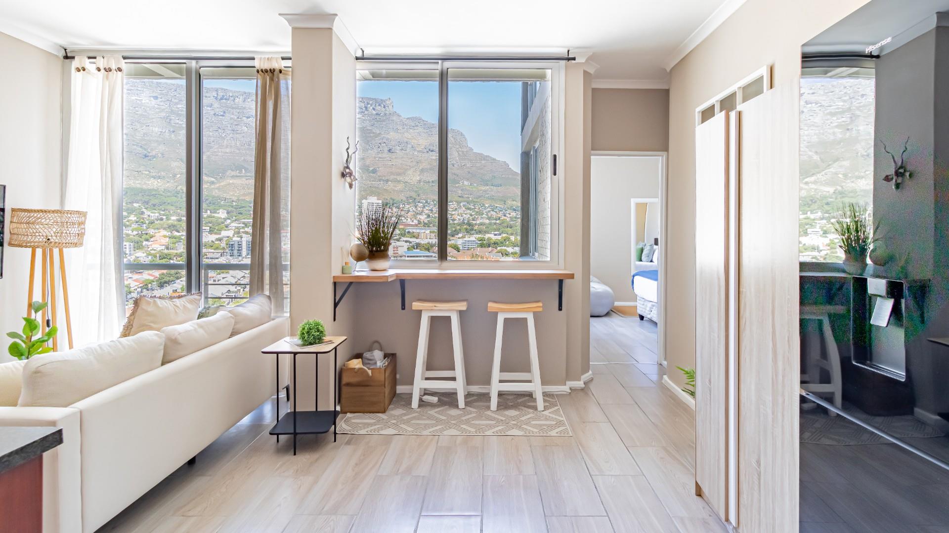 The living area and bedrooms all offer aspects of the parliament precinct and beautiful views of the mountains. It has a beautiful Sundowner corner that captures the beauty of what Cape Town is known for.