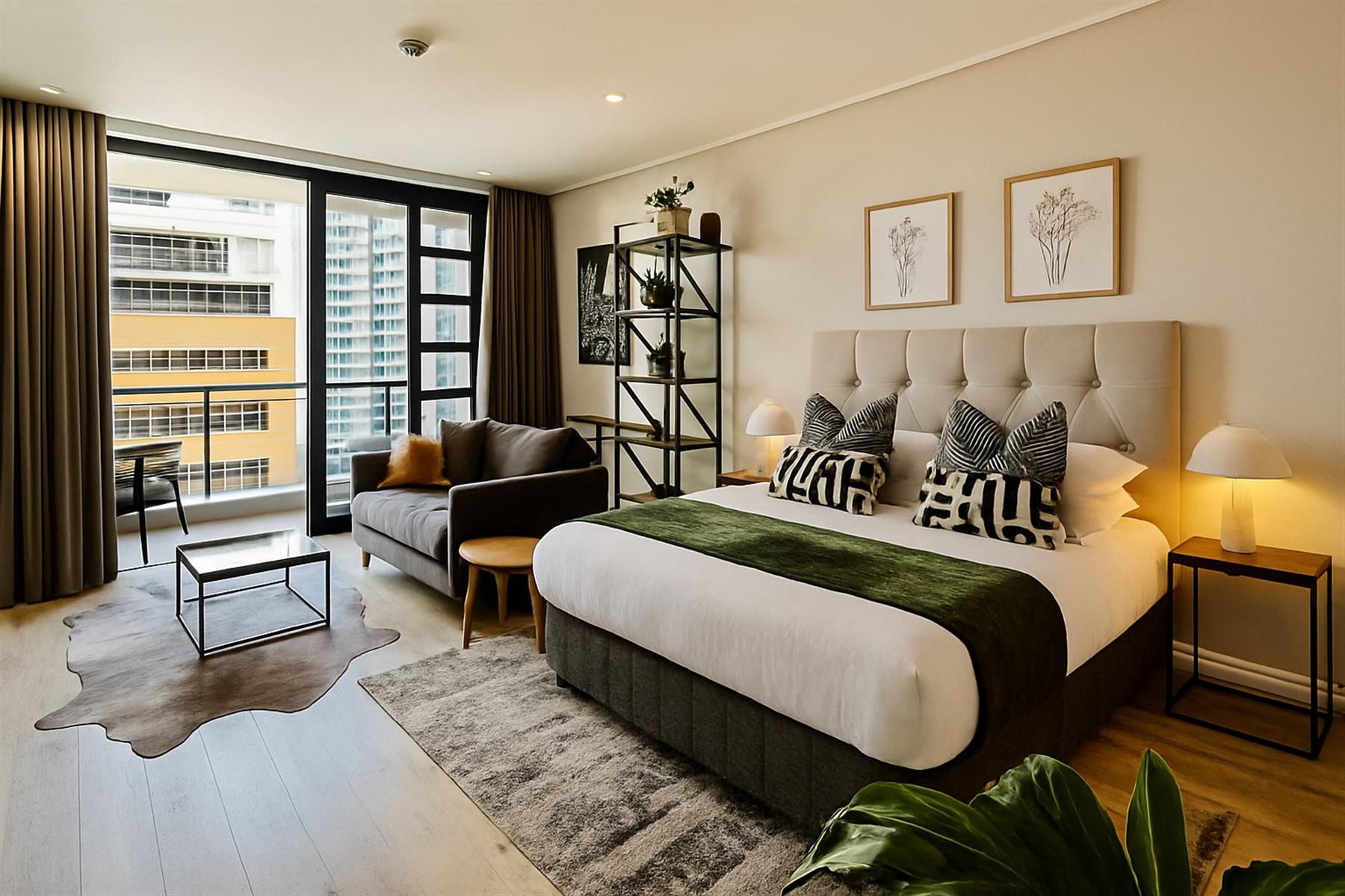 The 41 m2 studio apartment features a 6 m2 balcony, a bathroom with a shower, a modern, fully equipped kitchen, ample storage space, and air conditioning. Enjoy your morning coffee on your private balcony with breathtaking views of Table Mountain and Cape Town`s vibrant harbour.