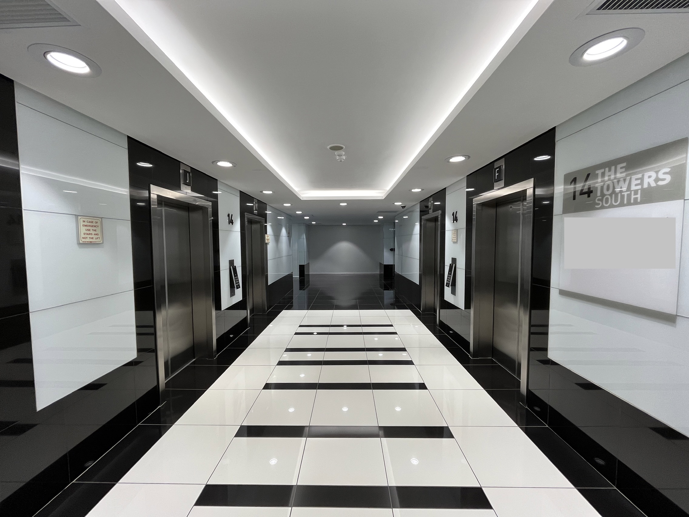 The unit features a spacious and welcoming reception area that sets a professional tone on arrival, flowing into a thoughtfully designed layout comprising multiple partitioned offices and boardrooms, allowing for both focused work and collaborative engagement. Supporting infrastructure includes a dedicated server room, storage area, and a kitchenette, ensuring seamless day-to-day functionality. An internal access point for staff provides convenient connectivity to communal bathrooms and building amenities without disrupting client-facing areas.