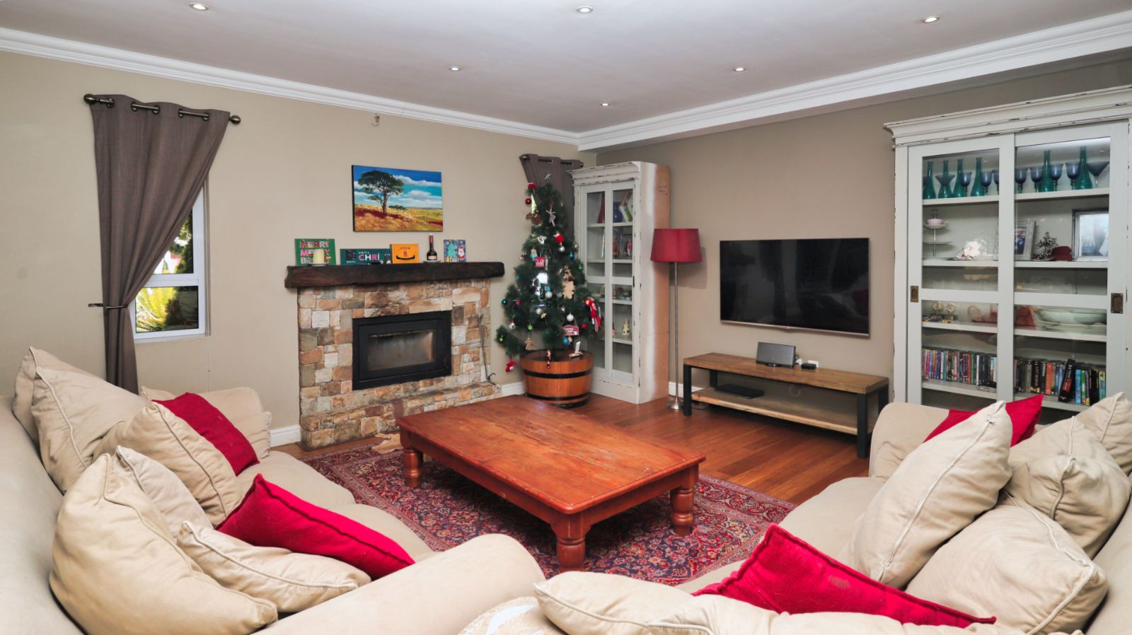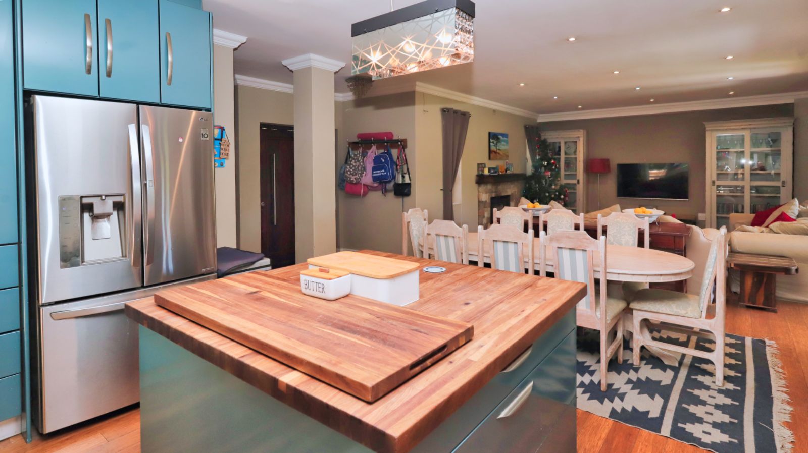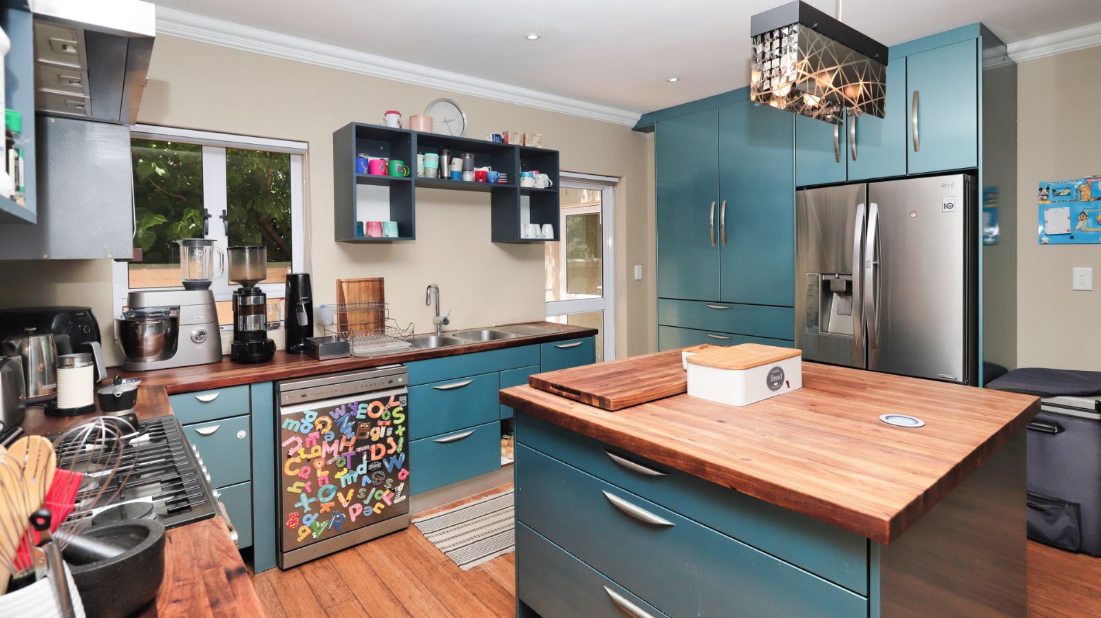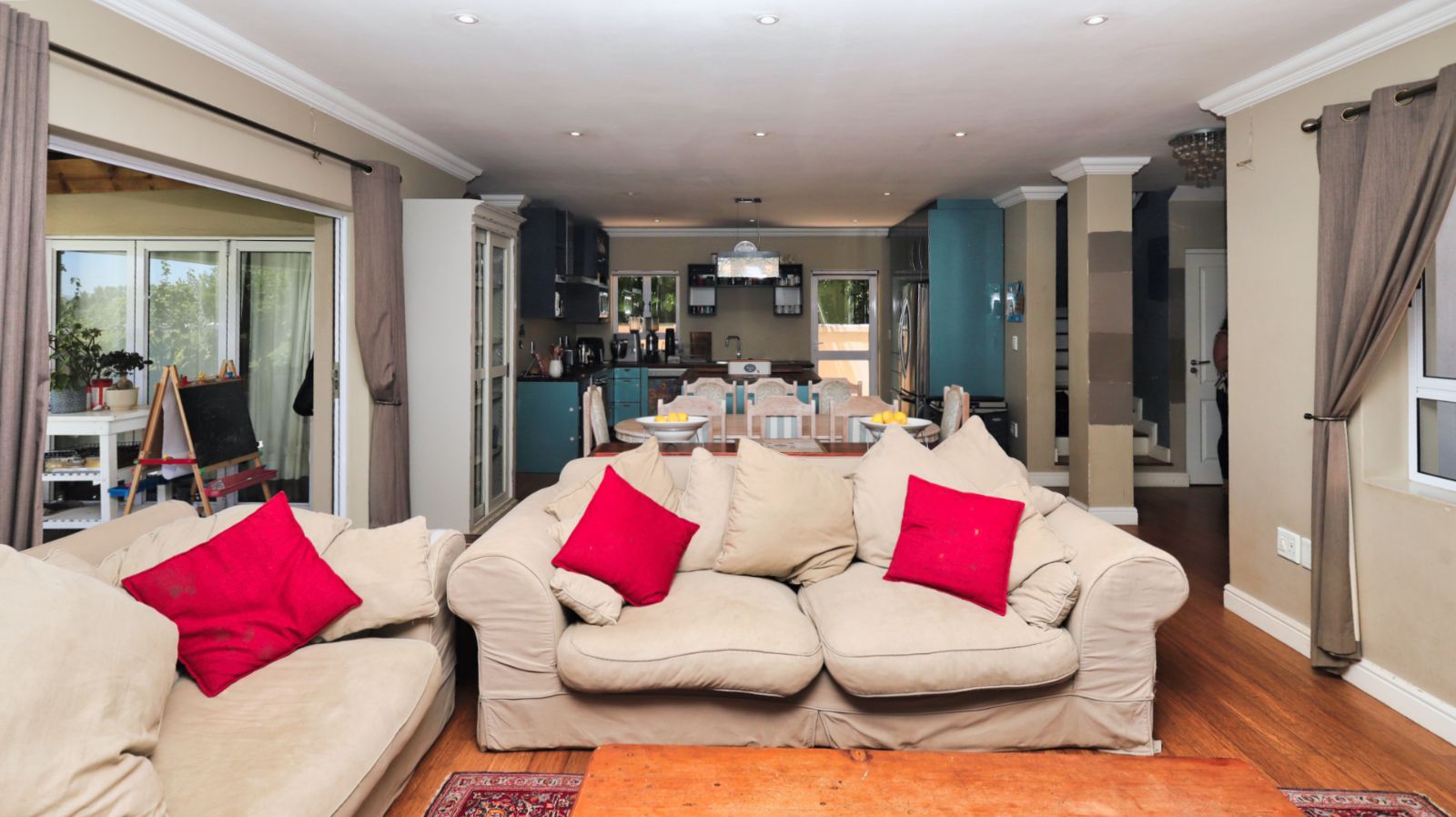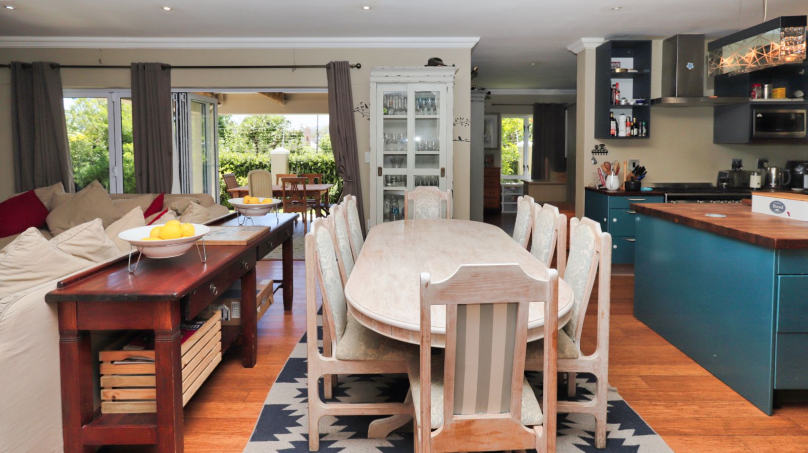 The open-plan living areas flow effortlessly from the lounge and dining room to the covered patio and landscaped garden, creating a seamless indoor–outdoor experience ideal for both relaxed family living and sophisticated entertaining. The kitchen forms a stylish focal point with its central island, quality finishes, gas hob and separate scullery and laundry.