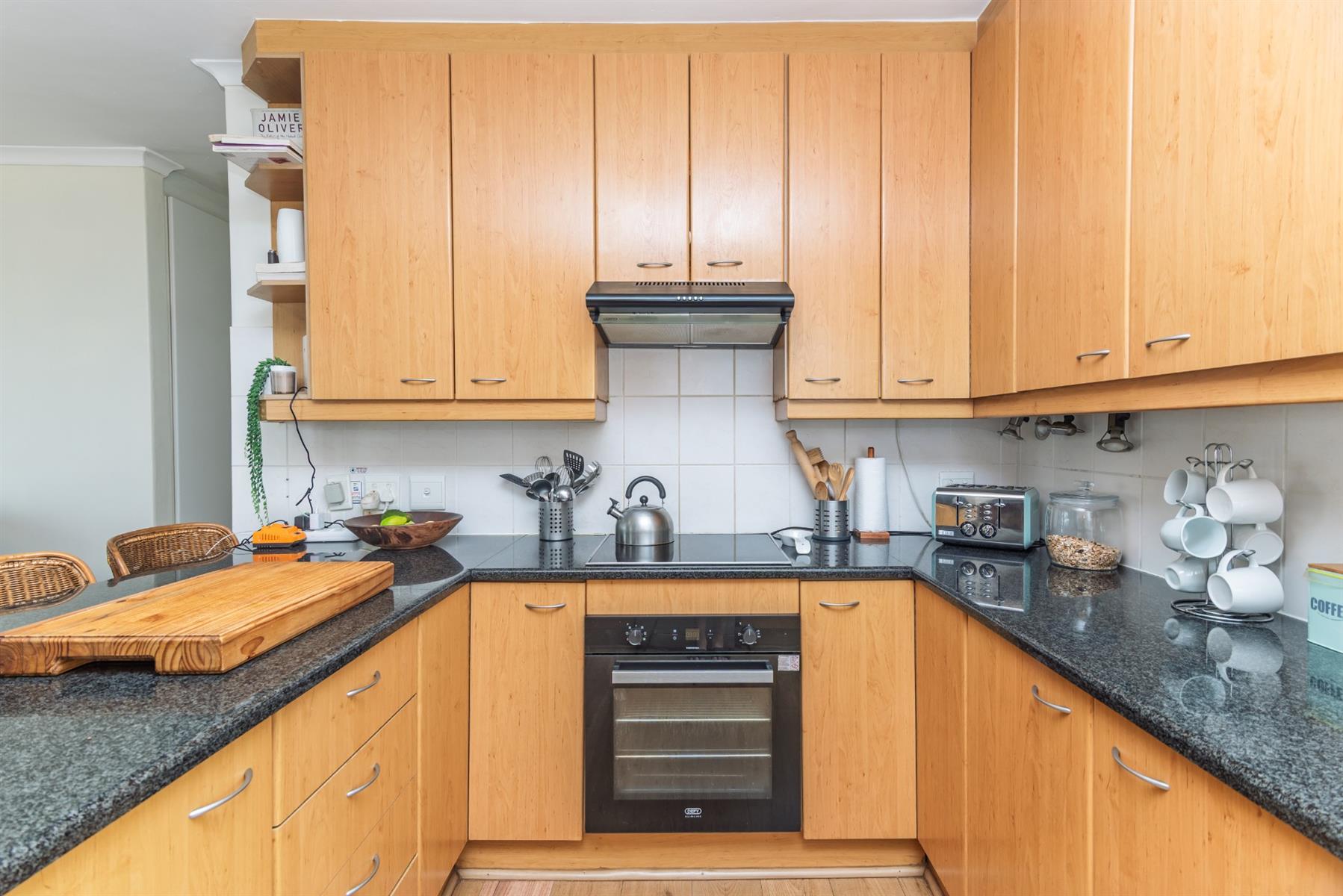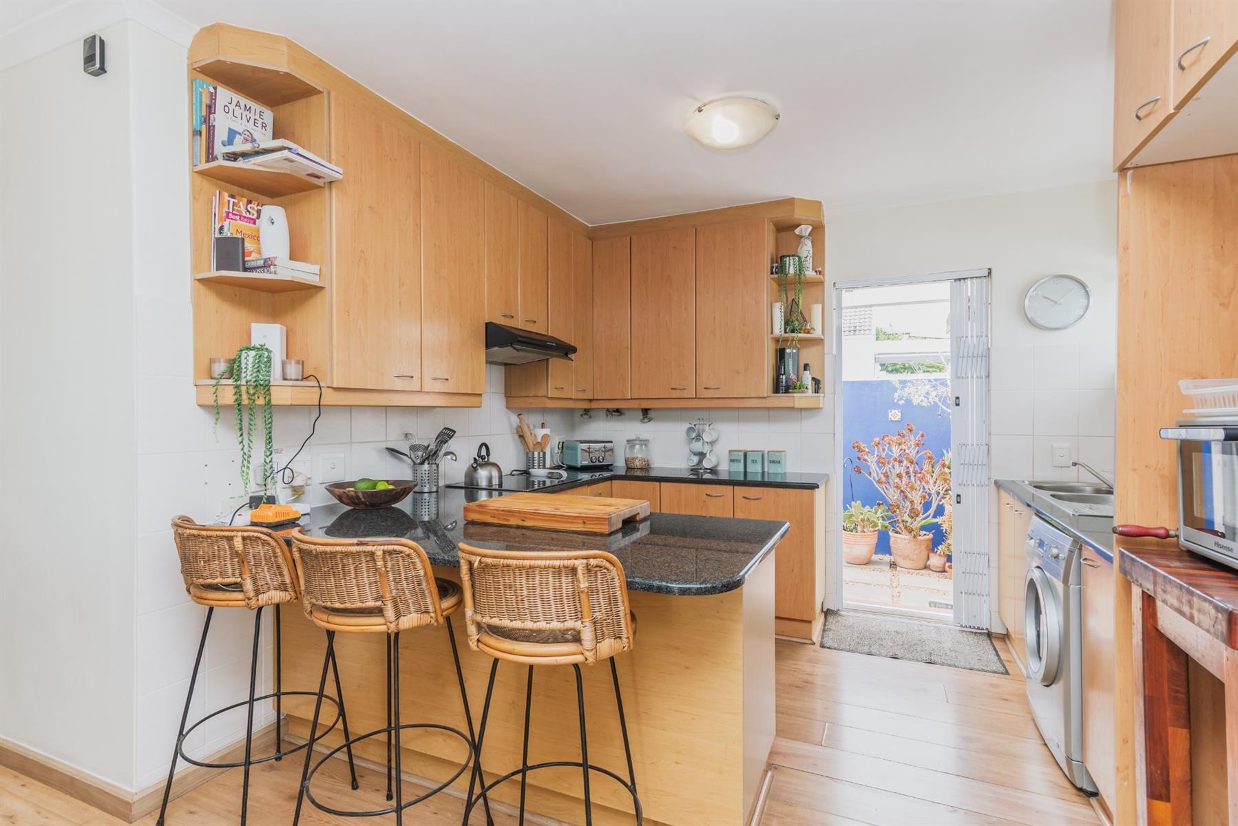 The well fitted open plan kitchen includes an electric hob, oven and extractor. Courtyard off the kitchen.