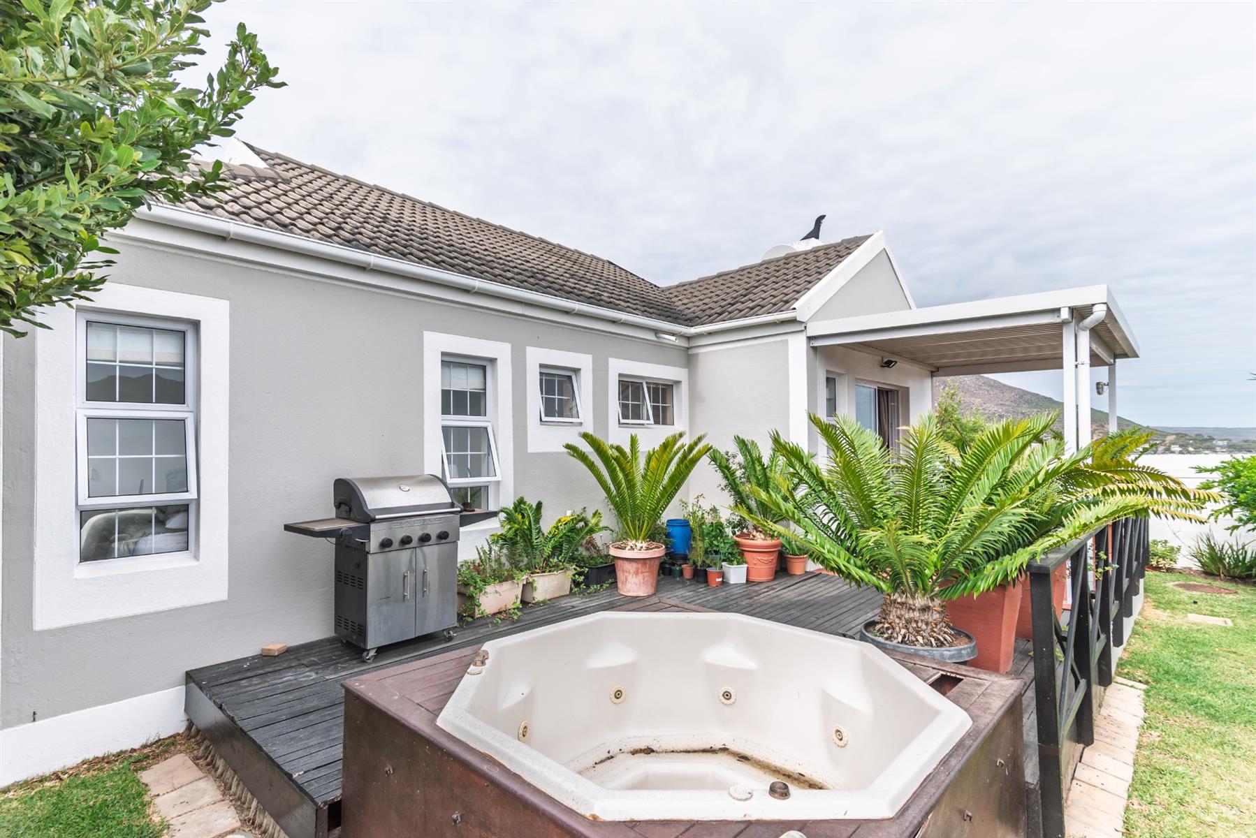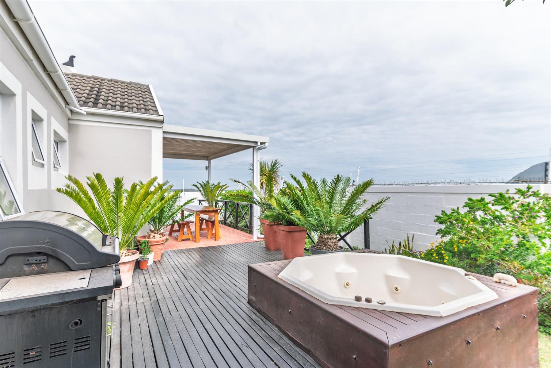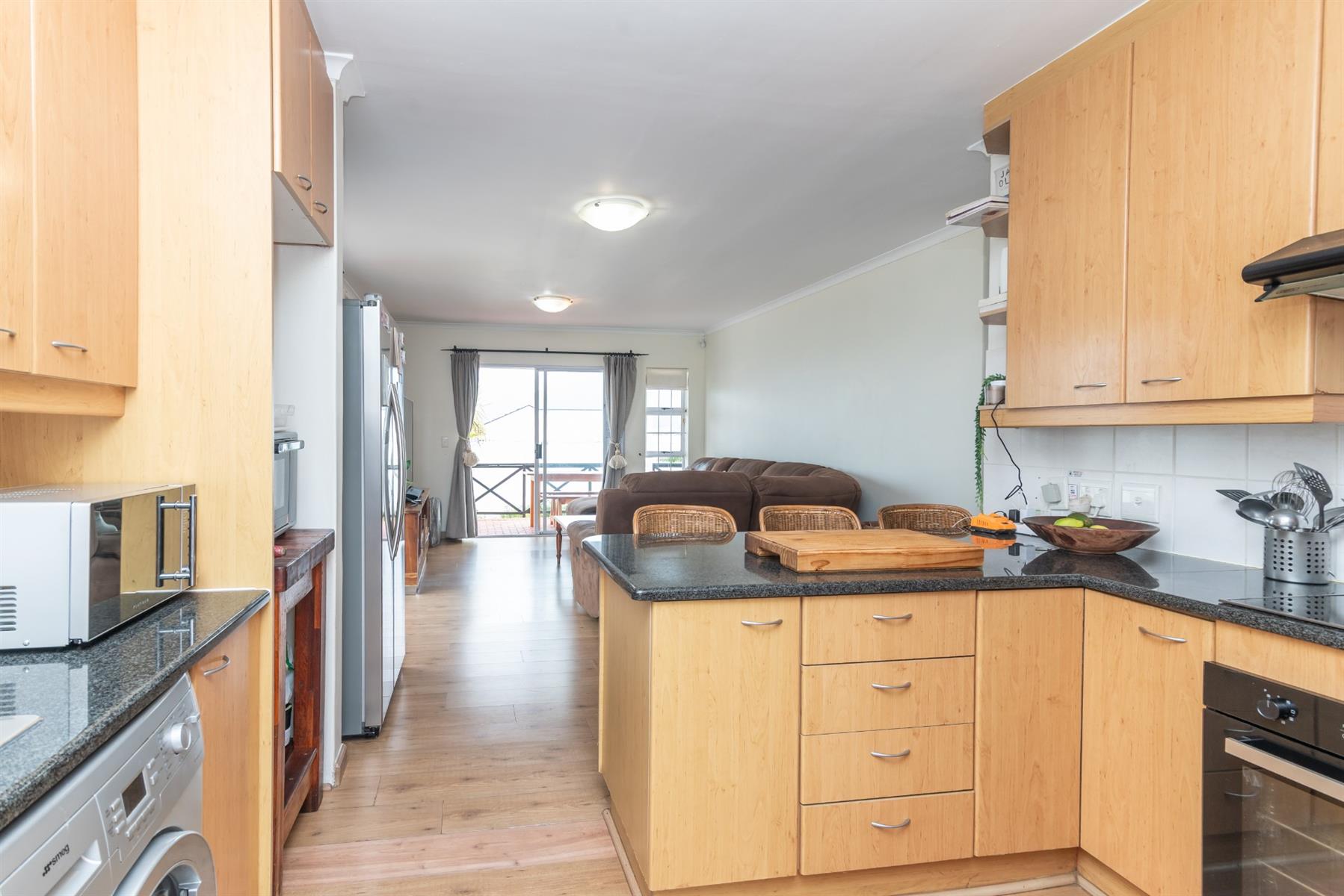 The open-plan kitchen, lounge and dining area flows easily onto a covered patio and deck with sea views - with space for a braai and outdoor entertaining.