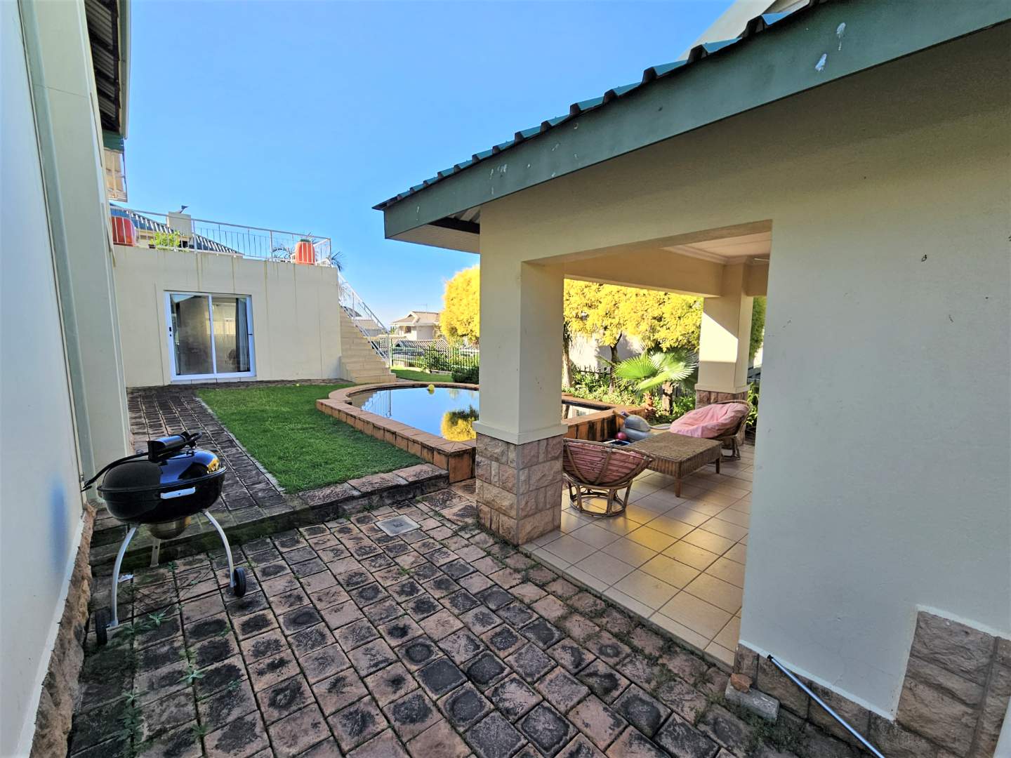 leading to the garden with a sparkling pool and patio.